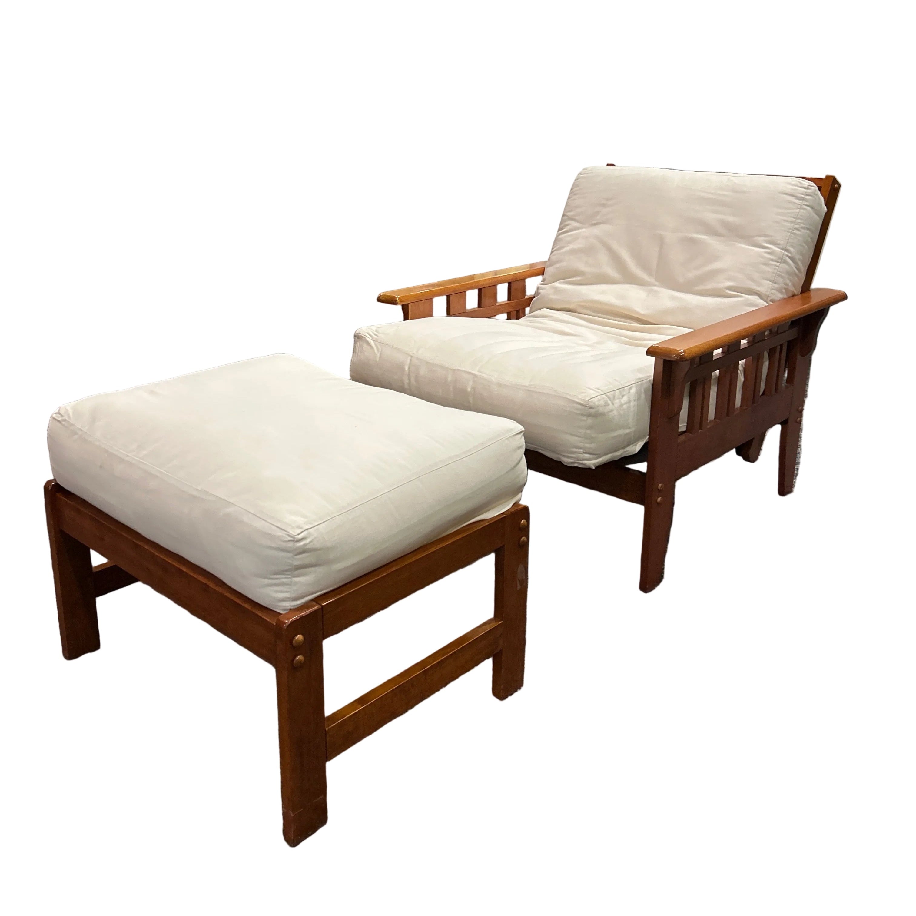 Convertible White Futon Teak Arm Chair w/ Ottoman 42” L x 35” W x 36” H