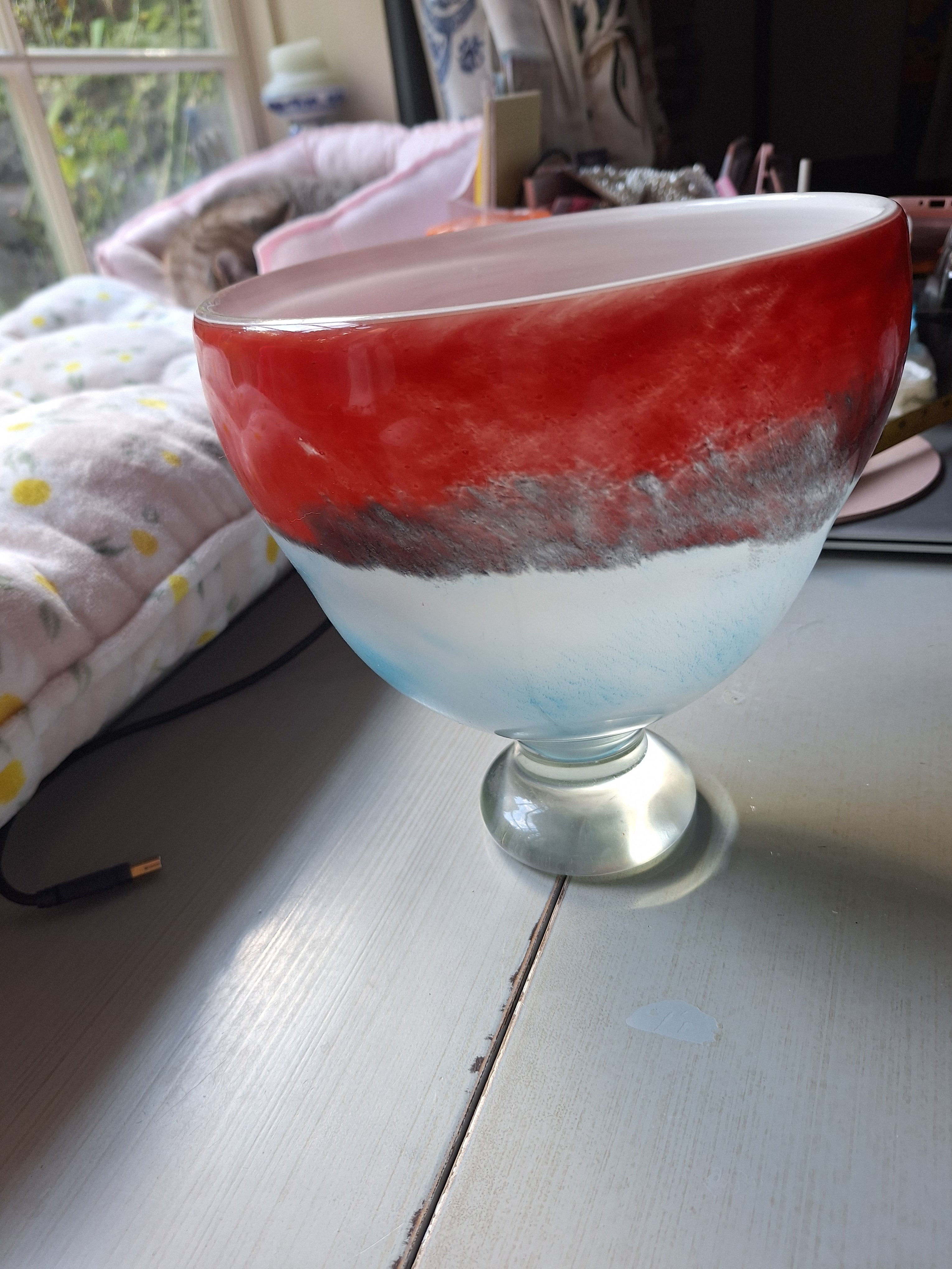A round, decorative glass bowl featuring a red and blue gradient design, resting on a light-colored surface near a window with green foliage visible.