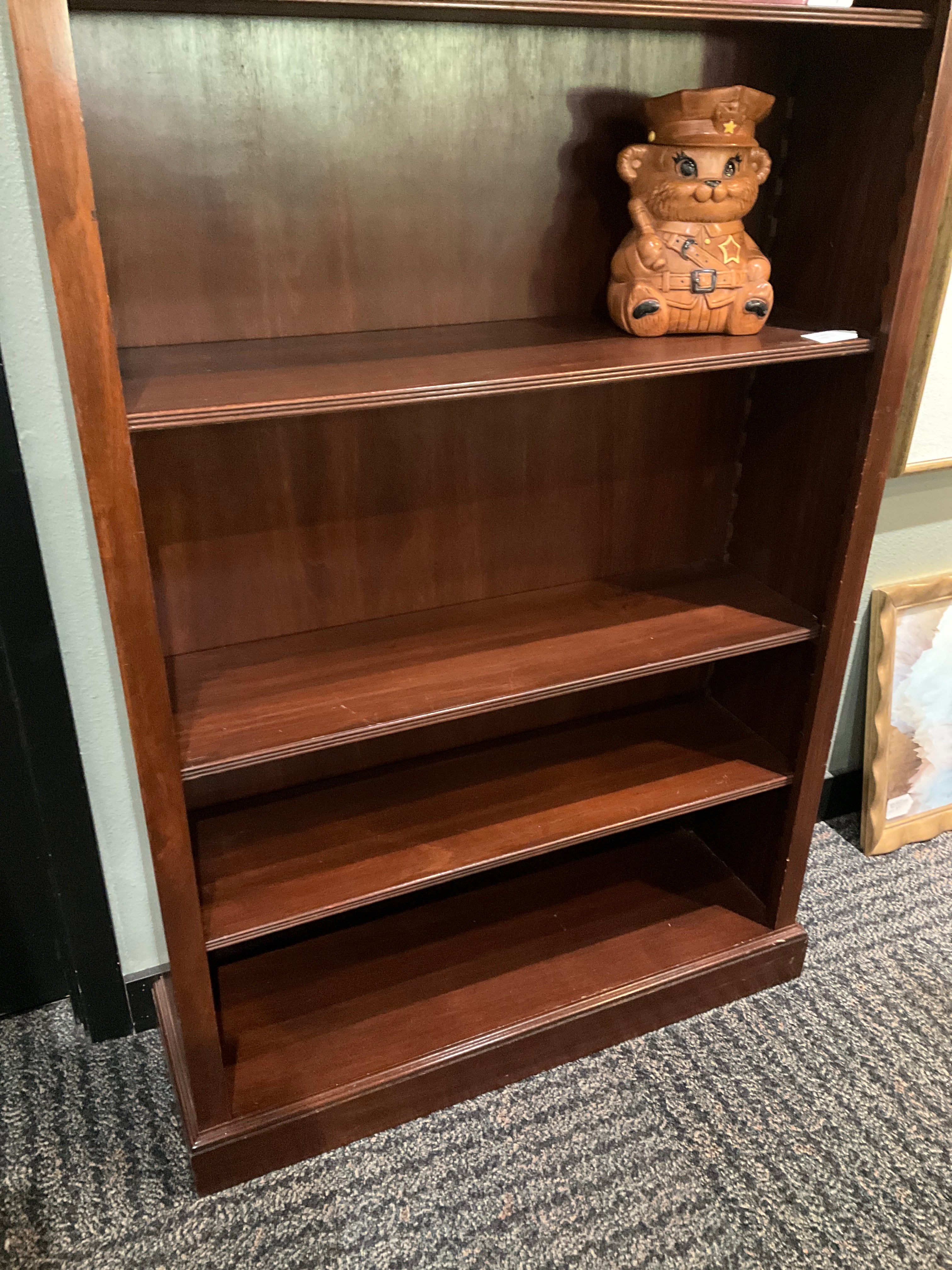A wooden bookshelf with a rich finish showcases three shelves, two of which are empty. A few books are neatly arranged on the lower shelf.