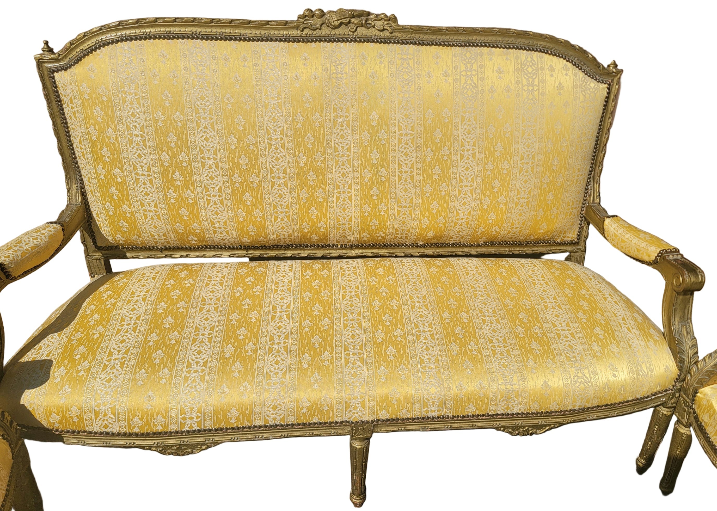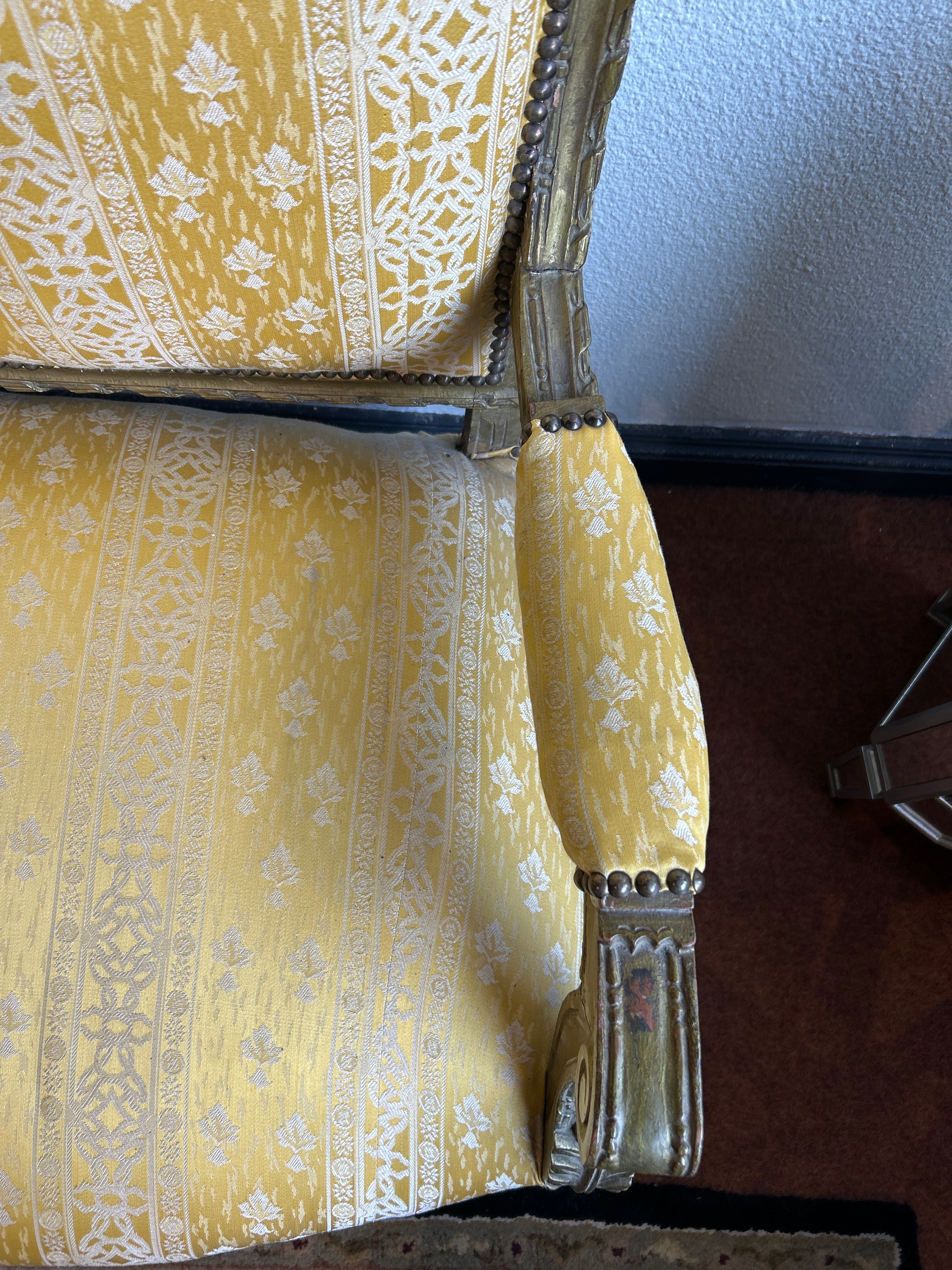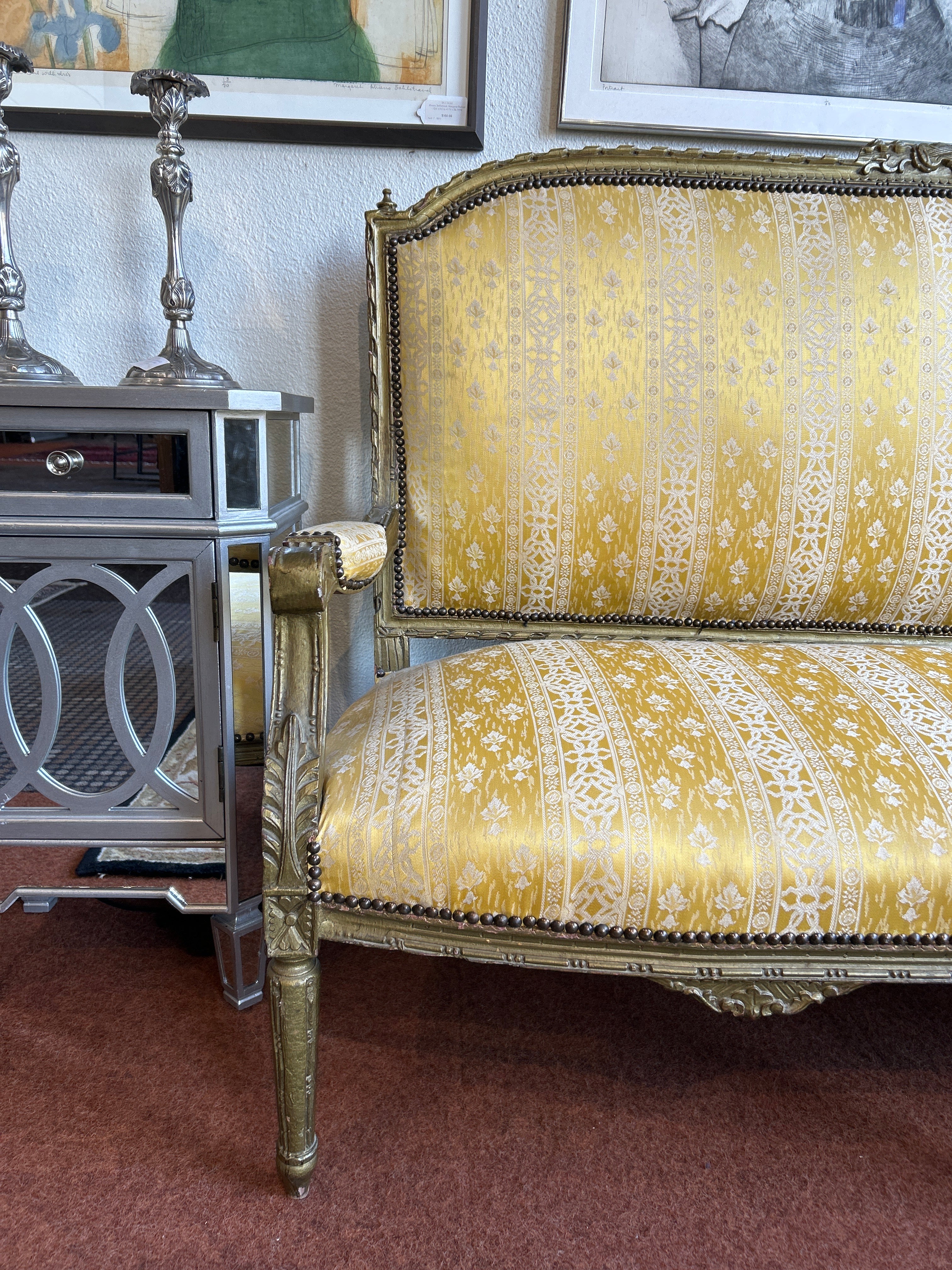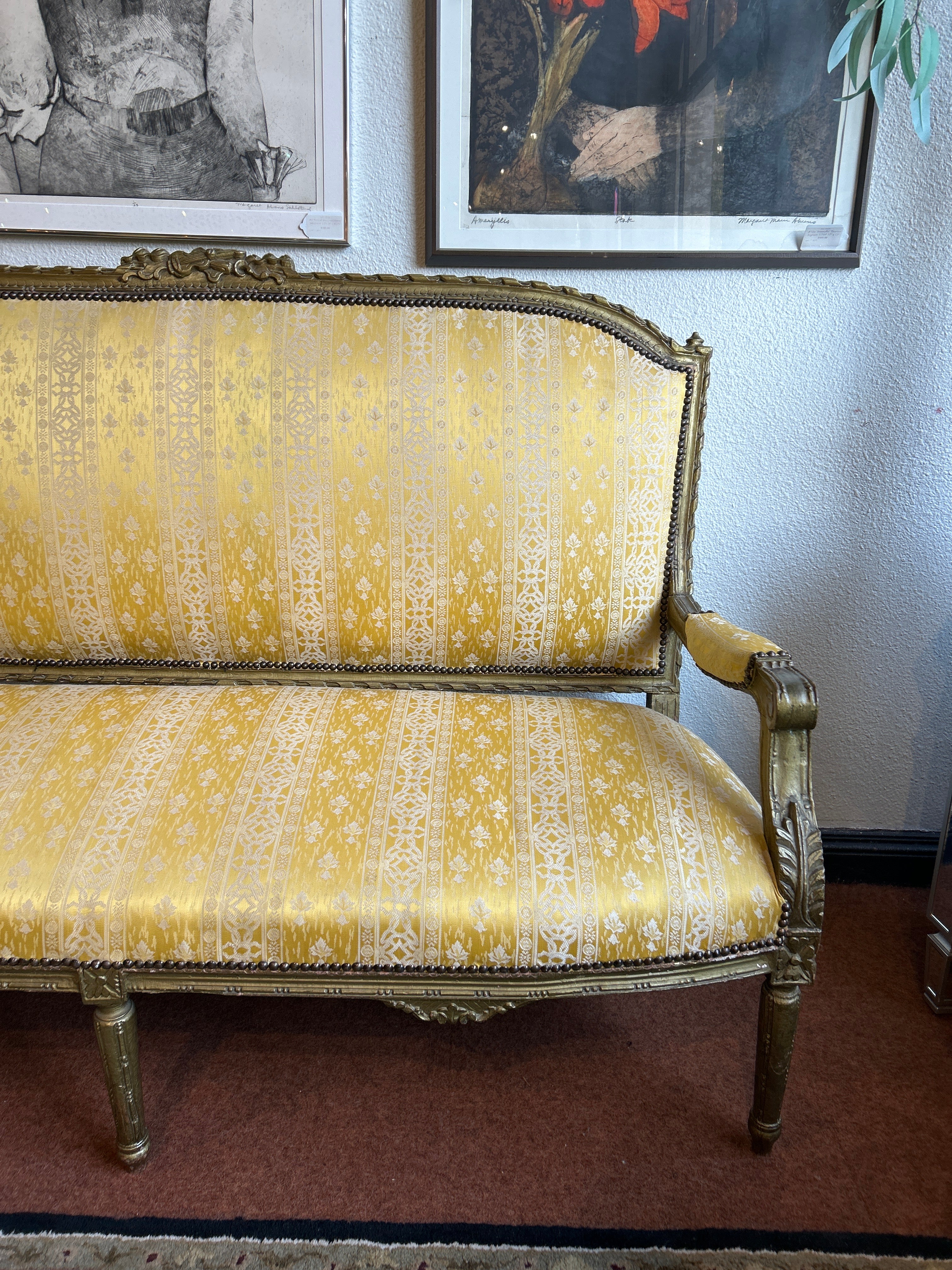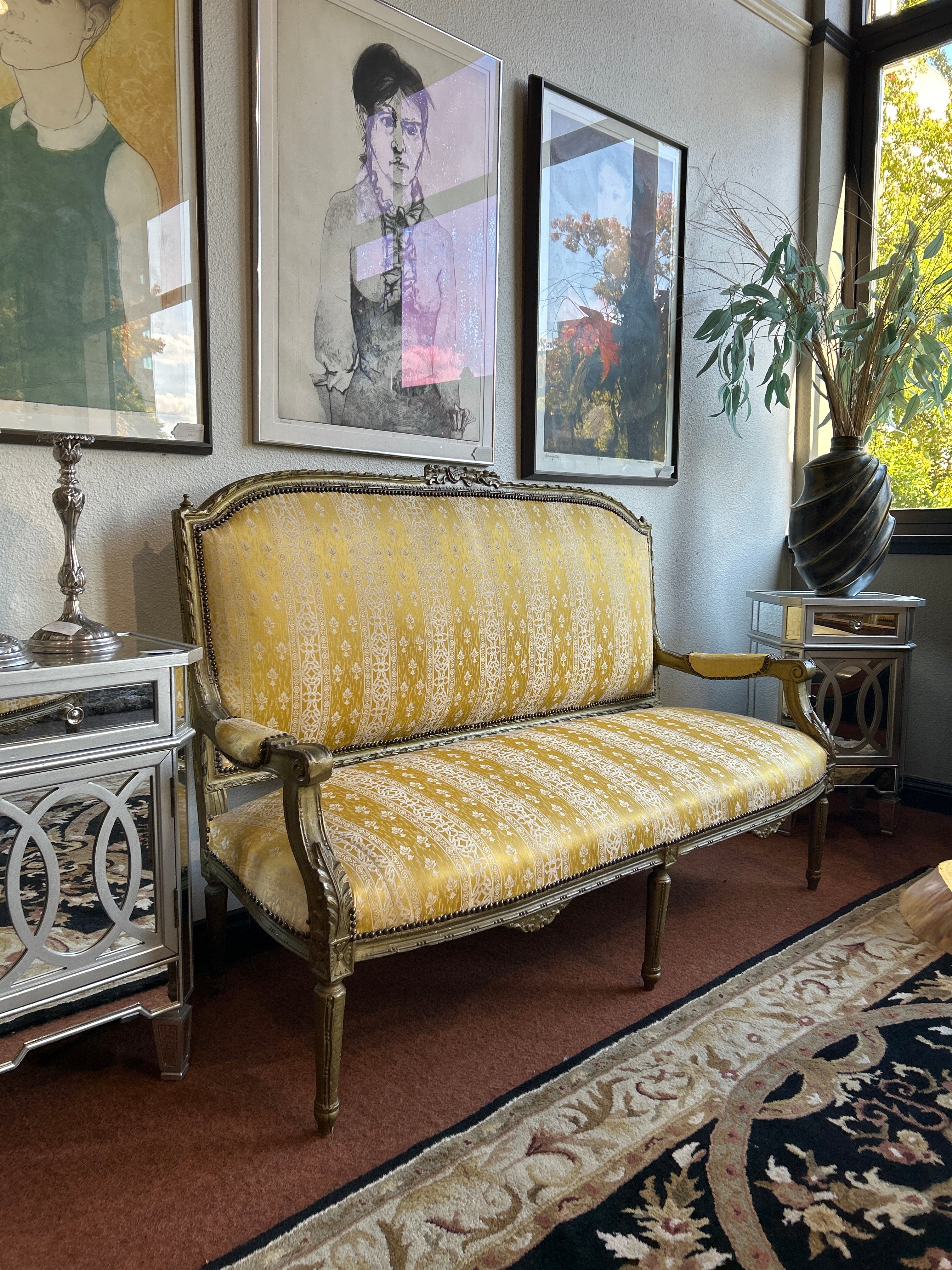 Louis XVI French Settee – Bright Yellow Striped Upholstery & Gilded Carved Frame