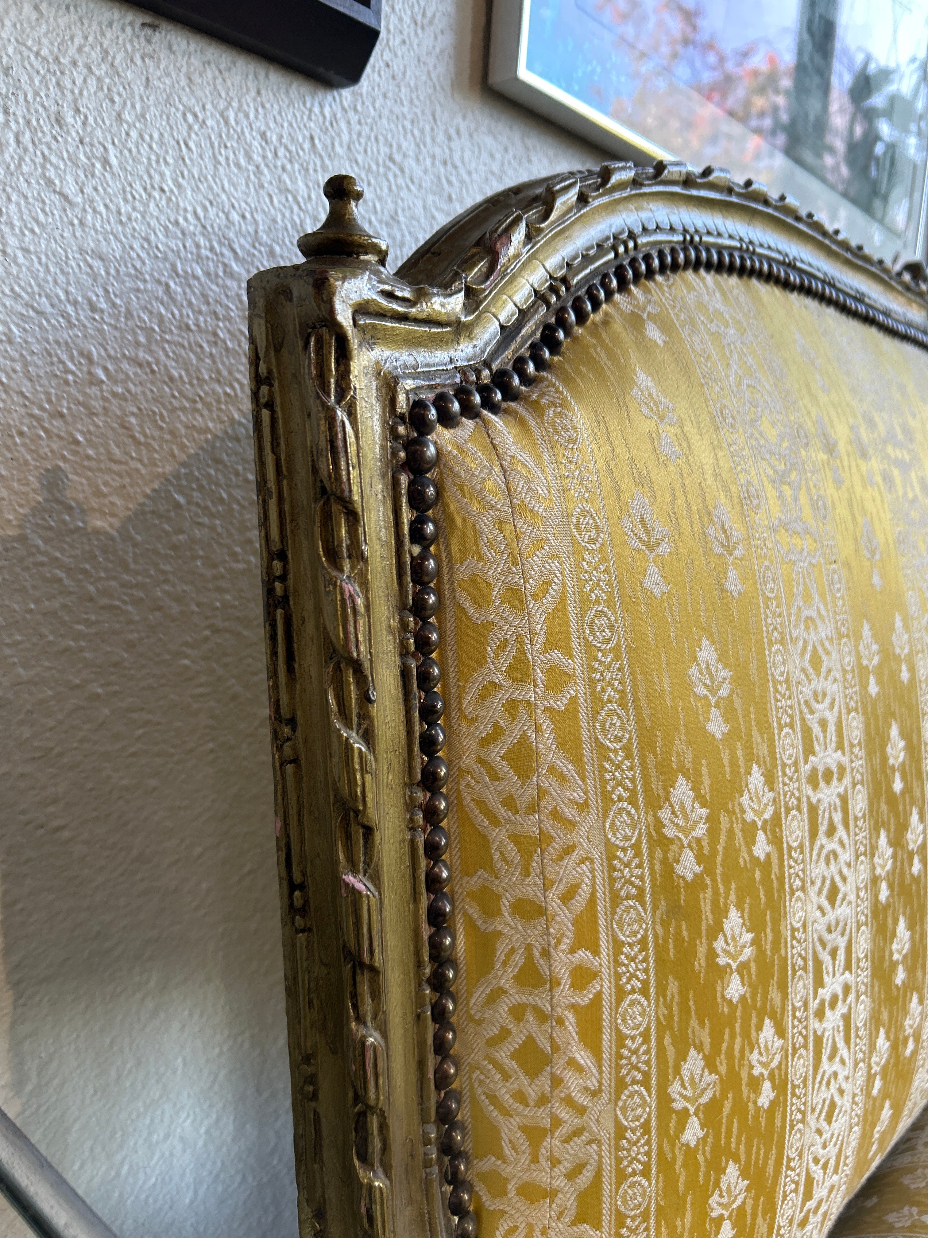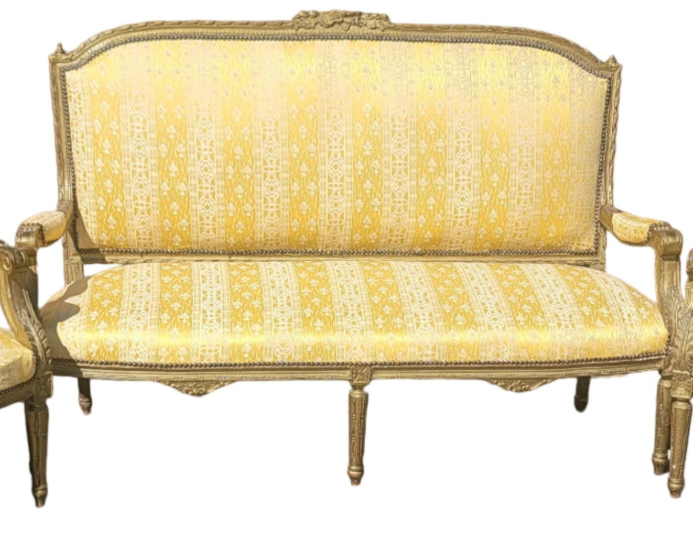 Bring the charm of a French salon into your space with this radiant Louis XVI-style Settee, a true celebration of classic elegance and regal craftsmanship. This six-legged settee features a hand-carved, gold-painted frame with exquisite detailing—from acanthus leaves to fluted legs echoing the refined symmetry and grandeur of the Louis XVI period.