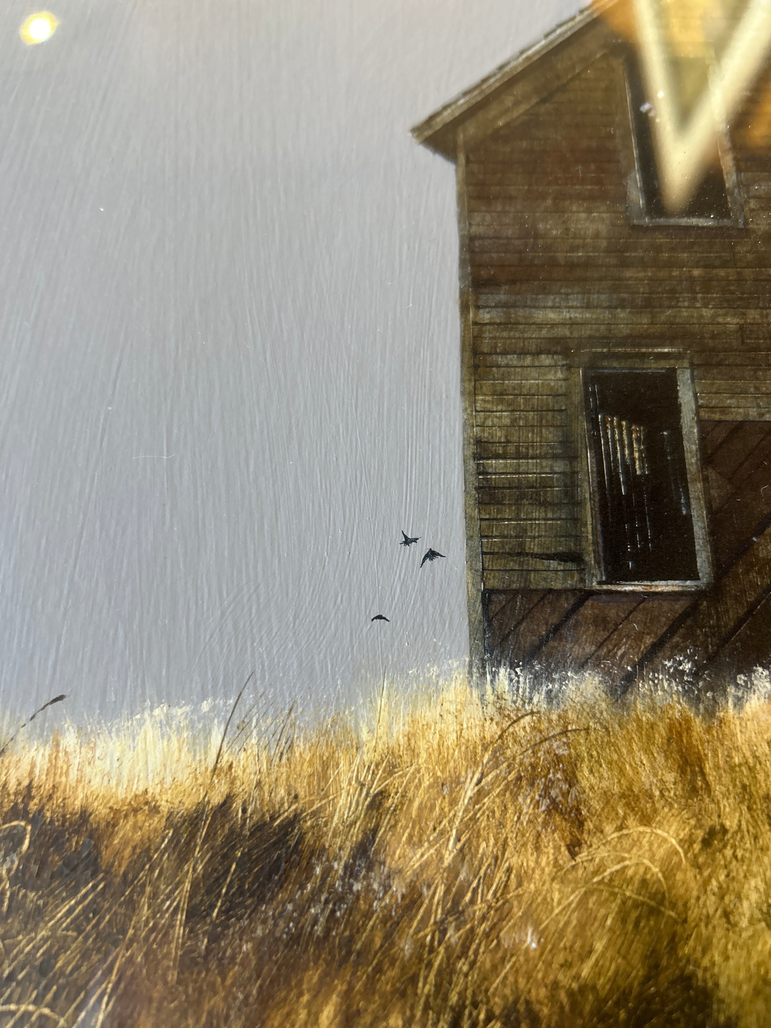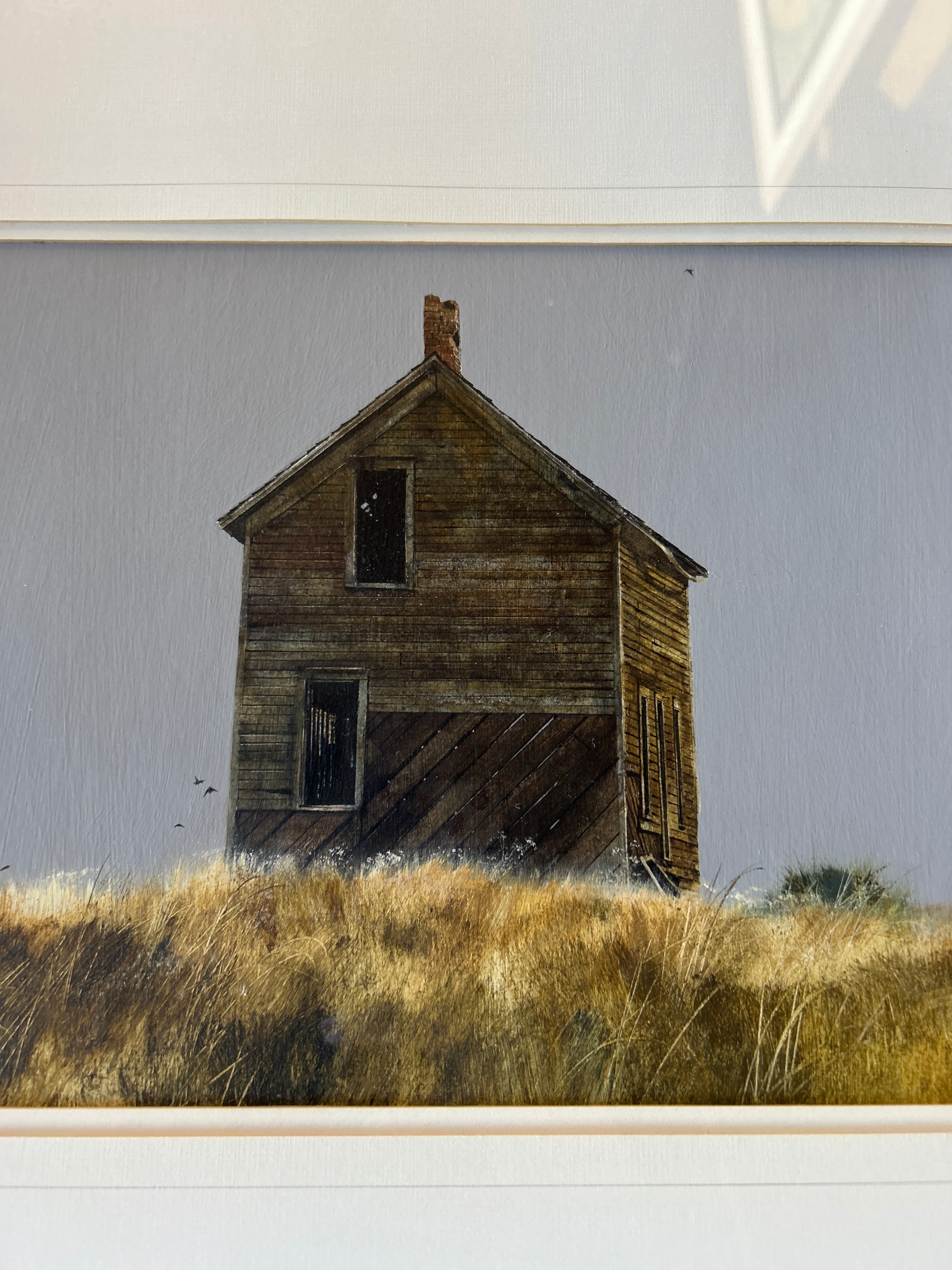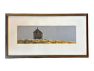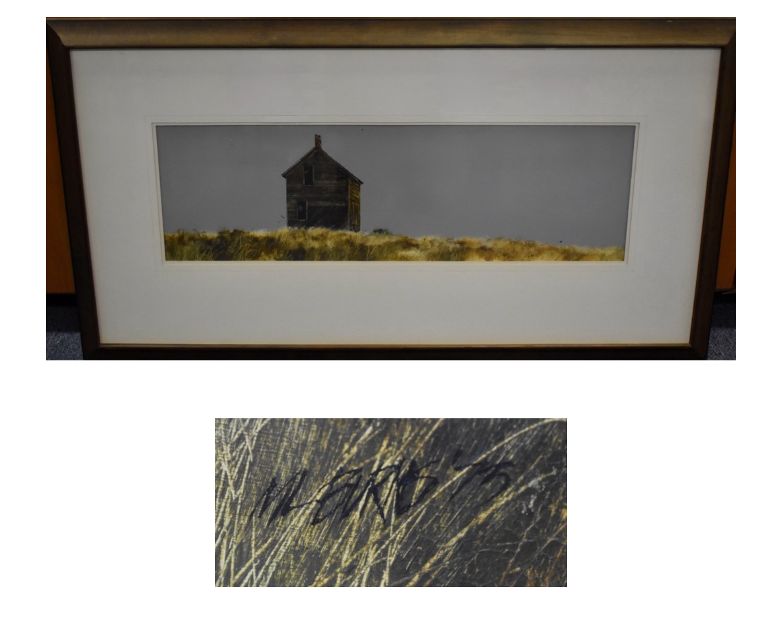 Title: Alone Artist: Burns, Mike (American, 1943 - 1991) Medium: Acrylic on paper Date: 1973 Dimensions: 9 inches high x 29.75 inches wide Dimensions Framed: 23.25 inches high x 43 inches wide Signature: Signed ML BURNS ’73 in black paint in the front lower left corner. Markings: On the verso of the frame notes in black ink state: “ALONE” BY MIKE BURNS 1973 Condition: Excellent, there is no apparent damage. Description: In this painting, a two story wood building emerges from a grass covered hill. The building has a sloped roof with a chimney and two windows on the side of the building facing the viewer. The grasses on the hill are yellow and brown tones. The sky beyond the building is gray. The painting has a white mat and gold colored frame.