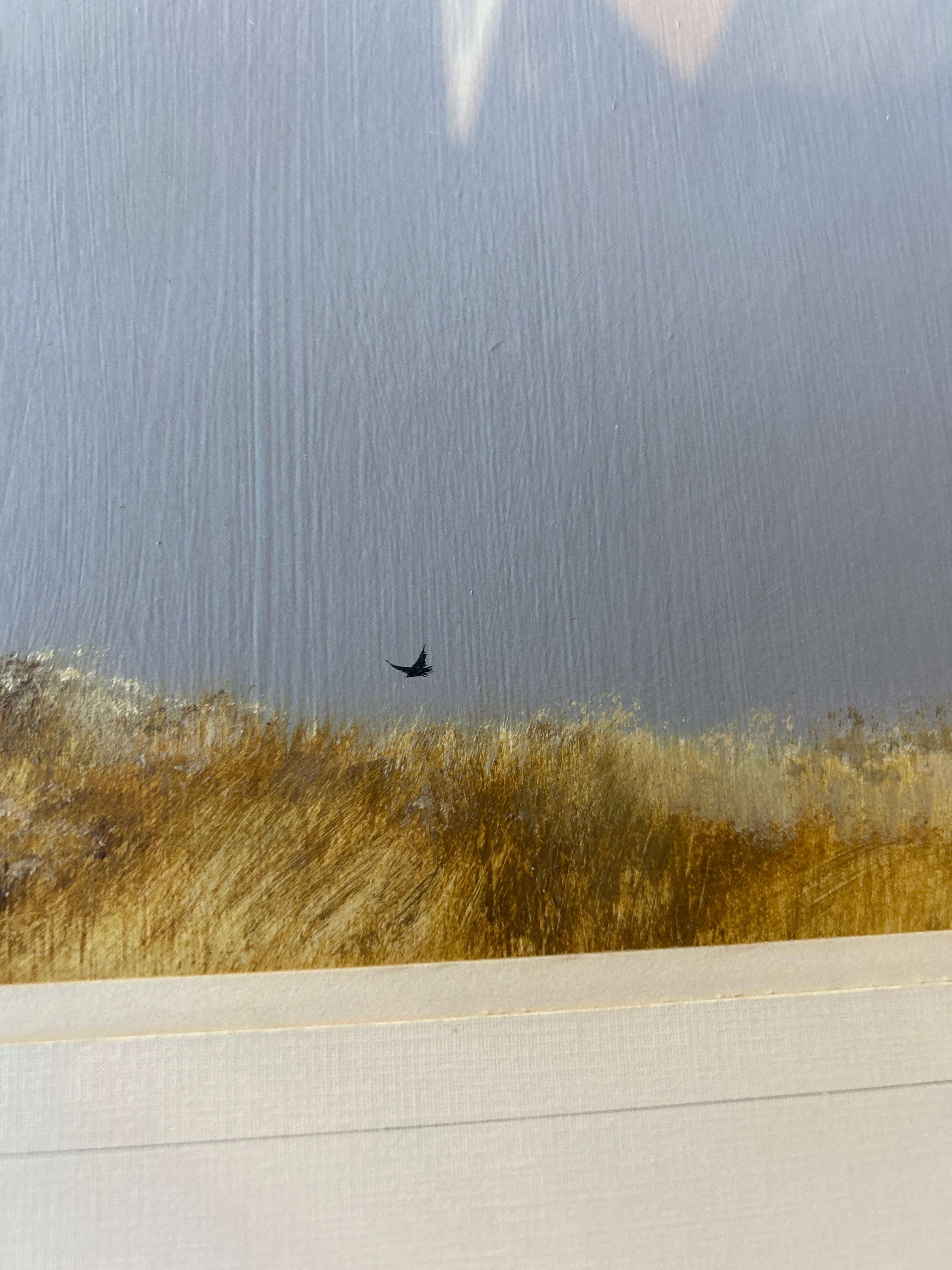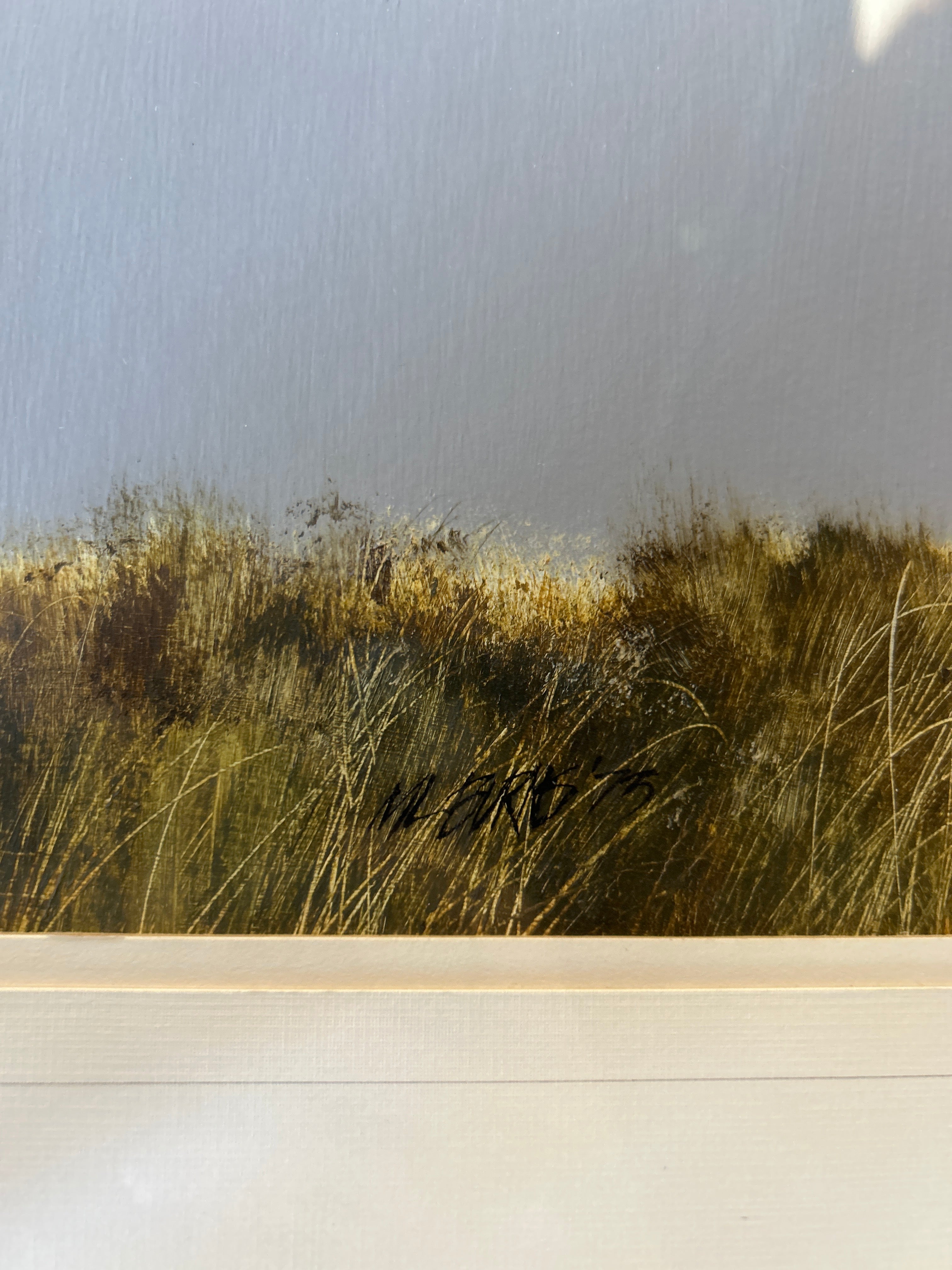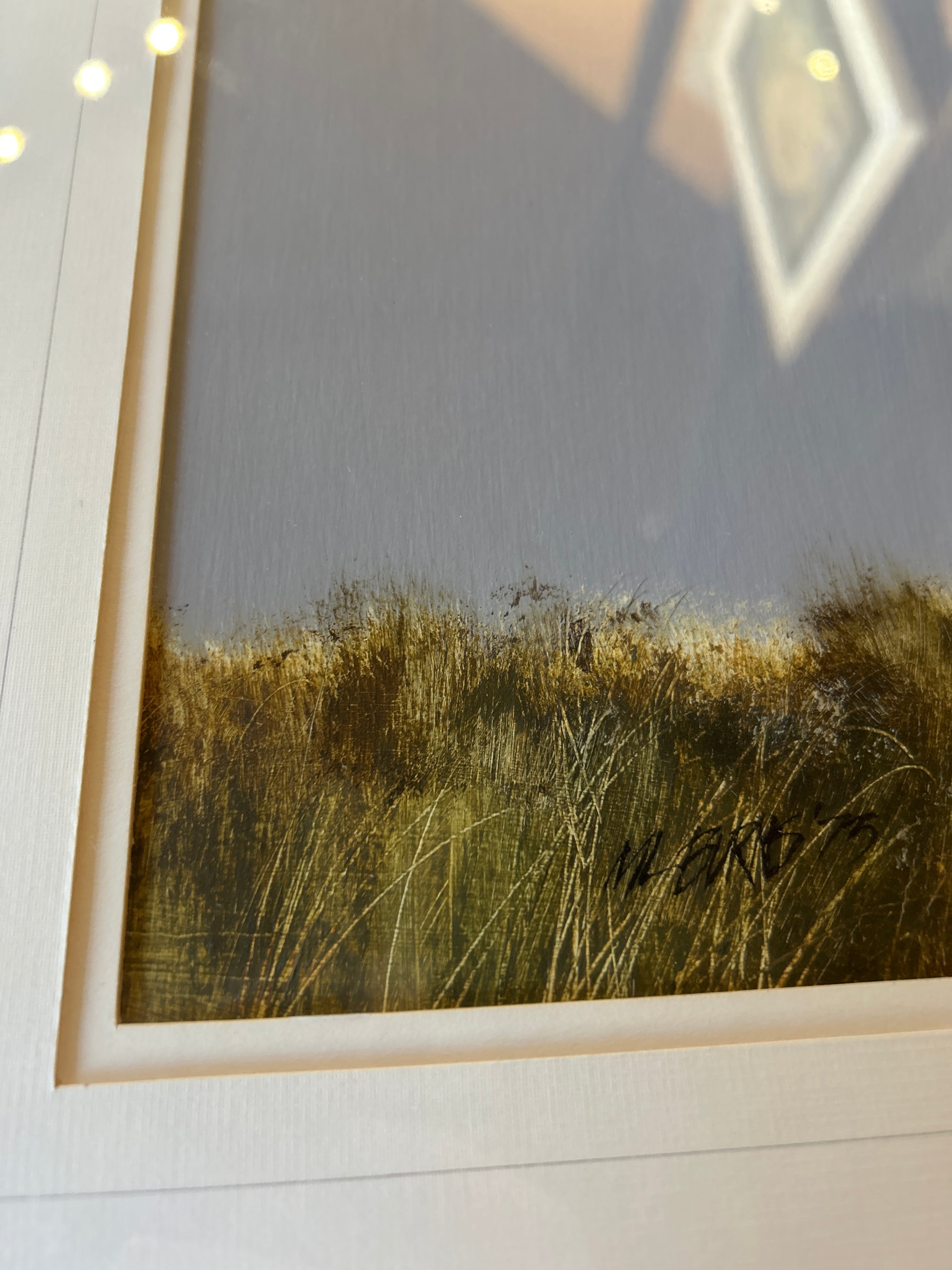 Title: Alone Artist: Burns, Mike (American, 1943 - 1991) Medium: Acrylic on paper Date: 1973 Dimensions: 9 inches high x 29.75 inches wide Dimensions Framed: 23.25 inches high x 43 inches wide Signature: Signed ML BURNS ’73 in black paint in the front lower left corner. Markings: On the verso of the frame notes in black ink state: “ALONE” BY MIKE BURNS 1973 Condition: Excellent, there is no apparent damage. Description: In this painting, a two story wood building emerges from a grass covered hill. The building has a sloped roof with a chimney and two windows on the side of the building facing the viewer. The grasses on the hill are yellow and brown tones. The sky beyond the building is gray. The painting has a white mat and gold colored frame.