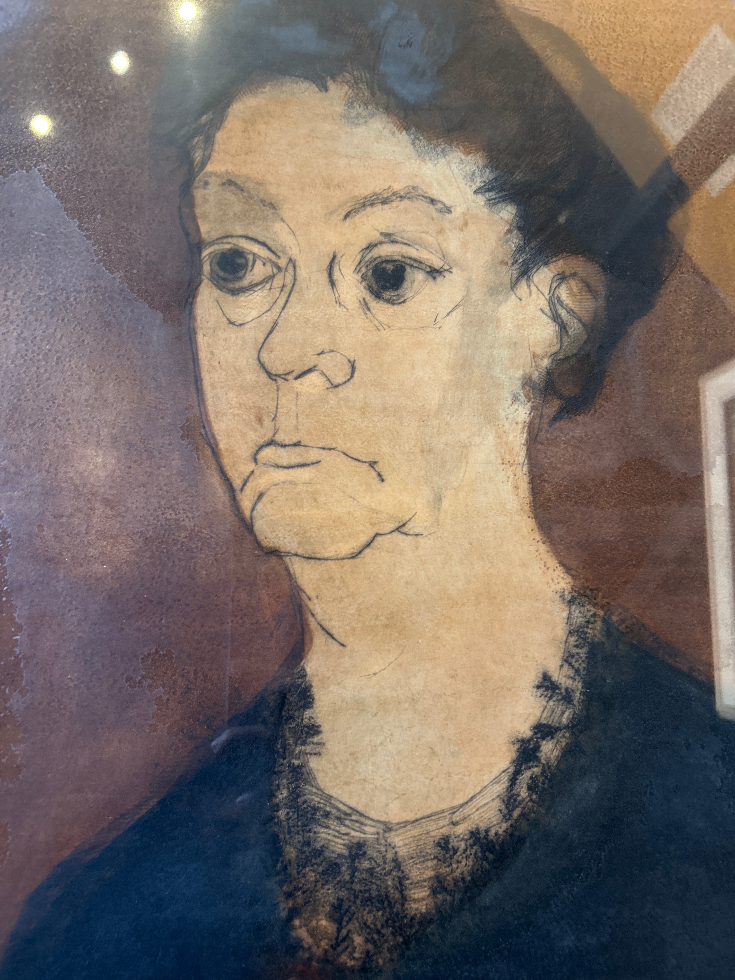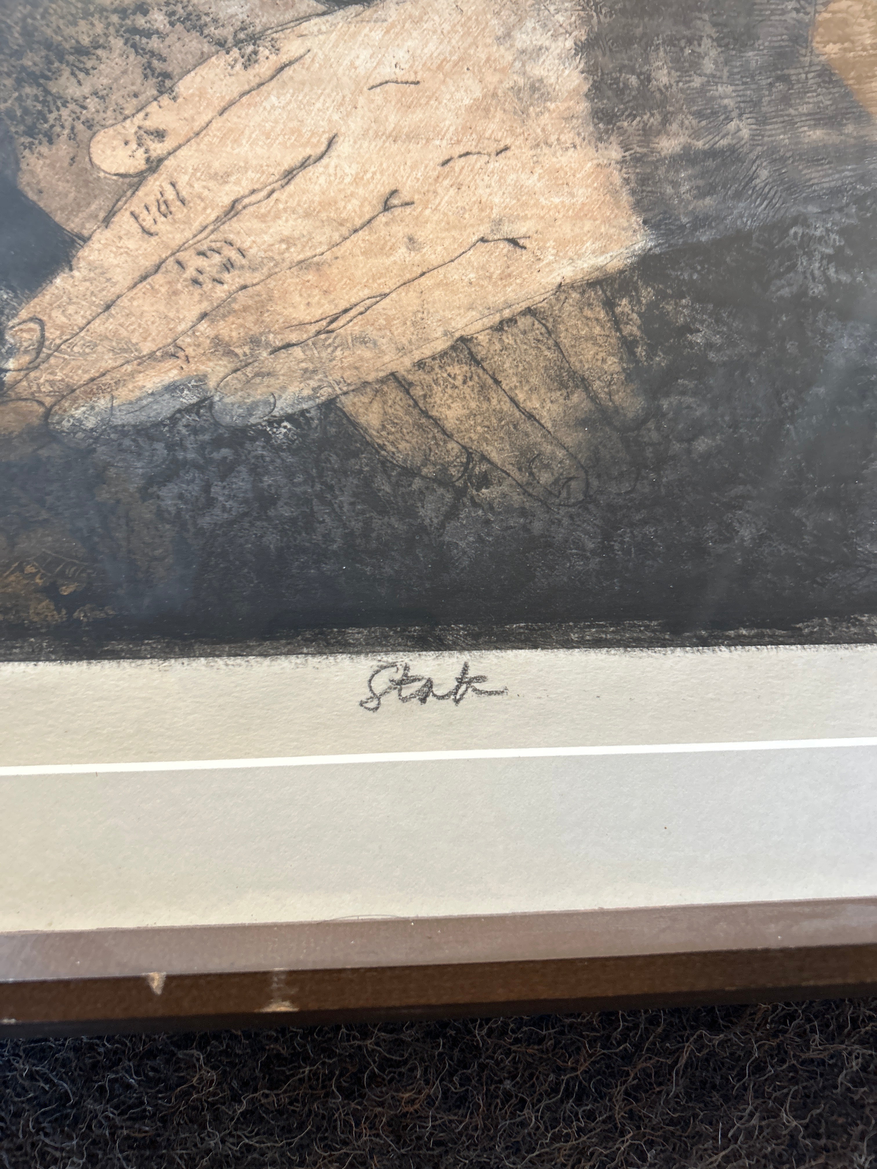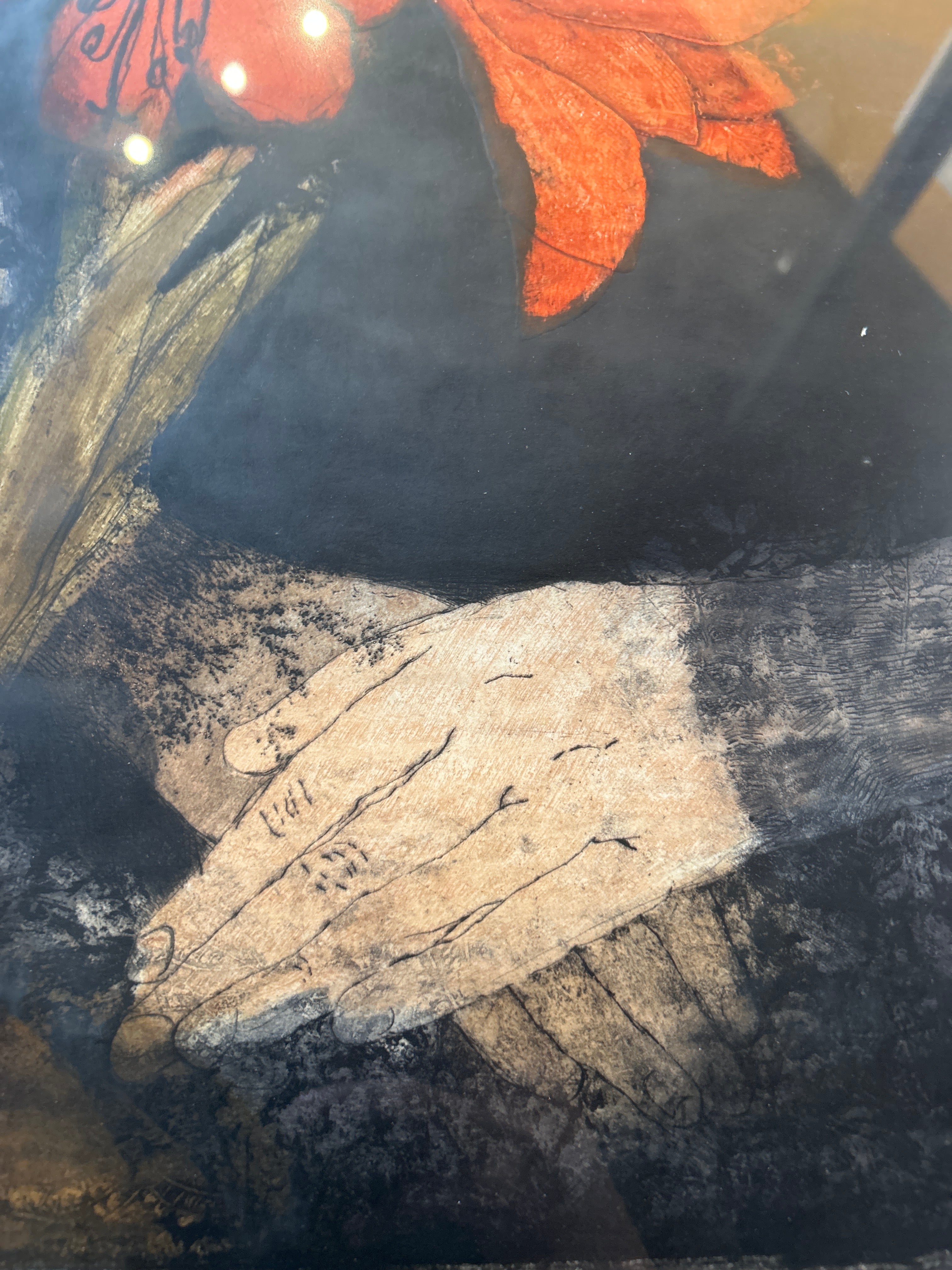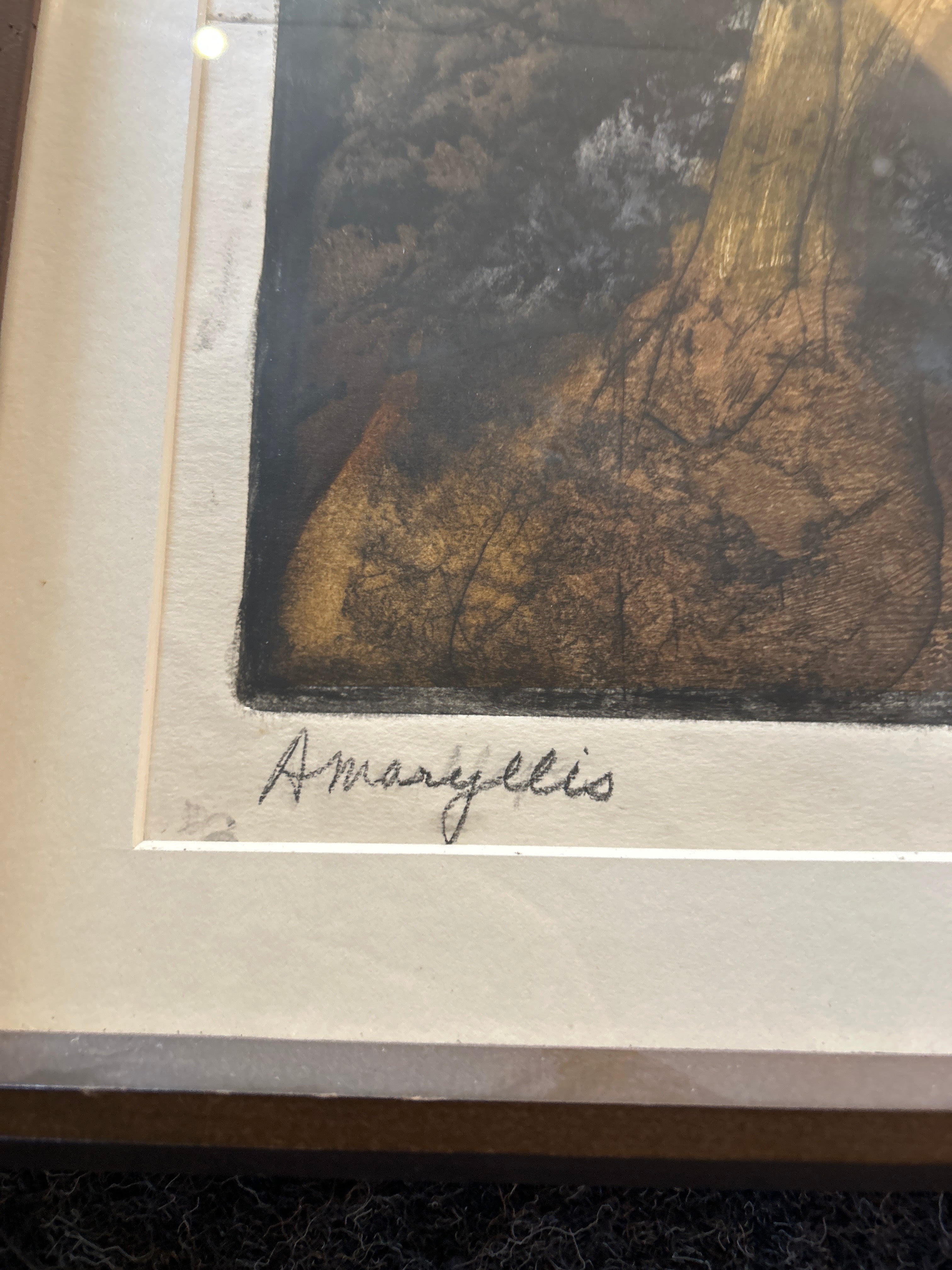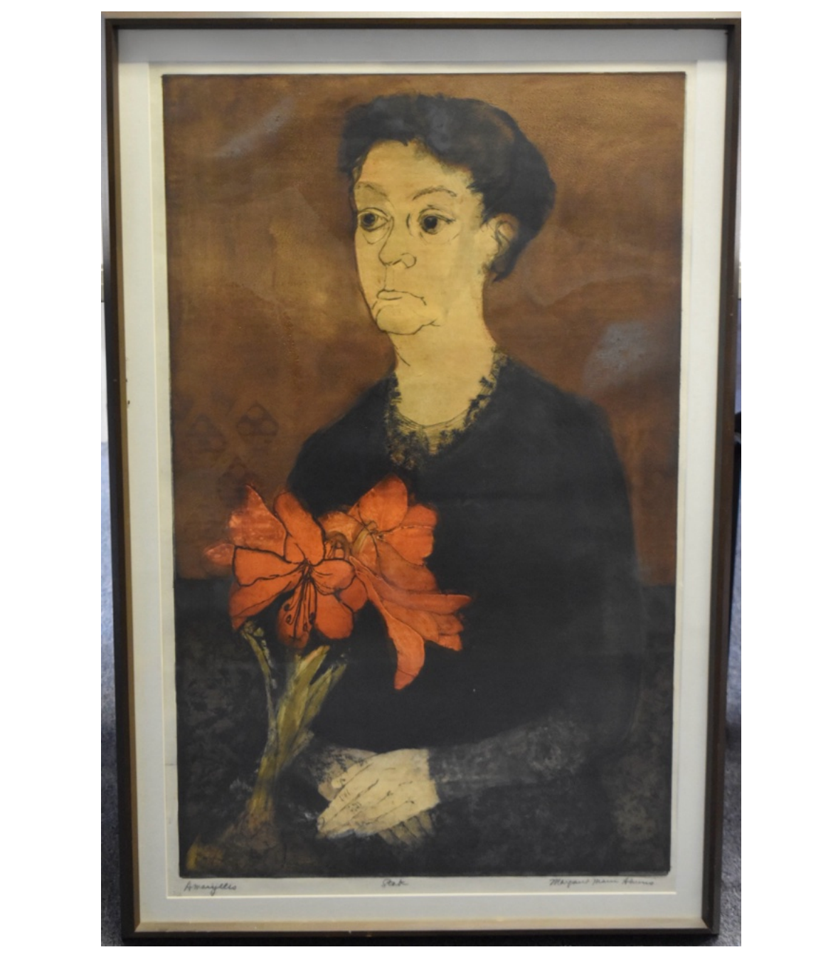 Title: Amaryllis Artist: Ahrens Sahlstrand, Margaret (American, 1939 - 2023) Medium: Color intaglio print on paper Date: 1966 Dimensions of Image: 35.25 inches high x 21.75 inches wide Dimensions Framed: 41 inches high x 27 inches wide Signature: Signed Margaret Marie Ahrens in pencil in the front lower right corner.14 Markings: The title is written in pencil in the front lower left corner. State is written in pencil under the center of the image. On the verso of the frame, text in black ink states: GEORGE BARNES RAFT ISLAND GIG HARBOR WASH. Condition: Excellent, there is no apparent damage. Description: In this color print, a seated woman clasps her hands in her lap and looks towards the left side of the composition. His expression is calm. She wears black long sleeved clothing and has dark hair, pulled back from her face. In the lower left corner of the composition, there are several red amaryllis plants. The background is a deep brown. The print has a white mat and a narrow wood frame.