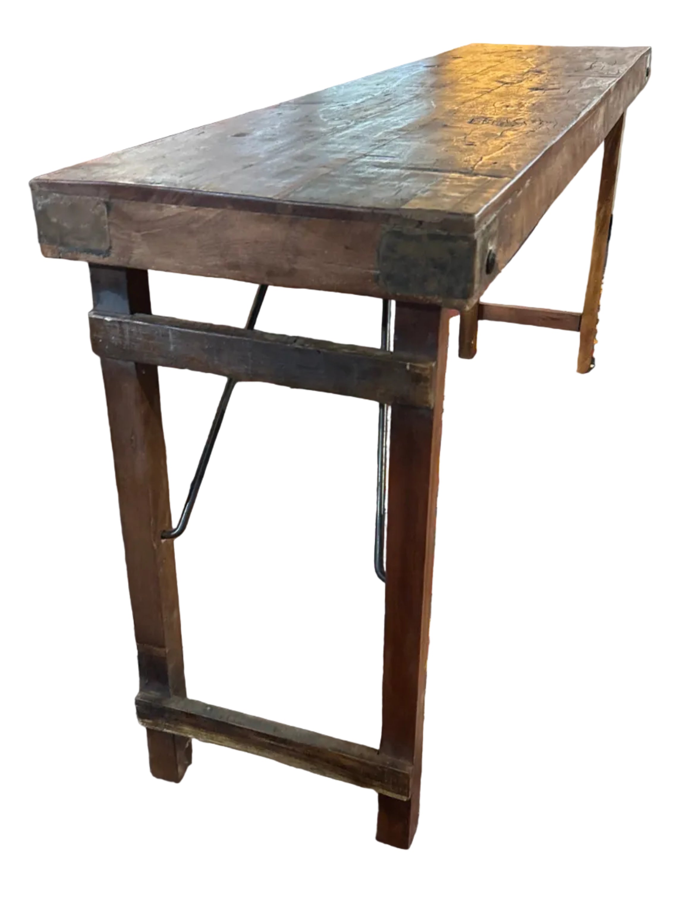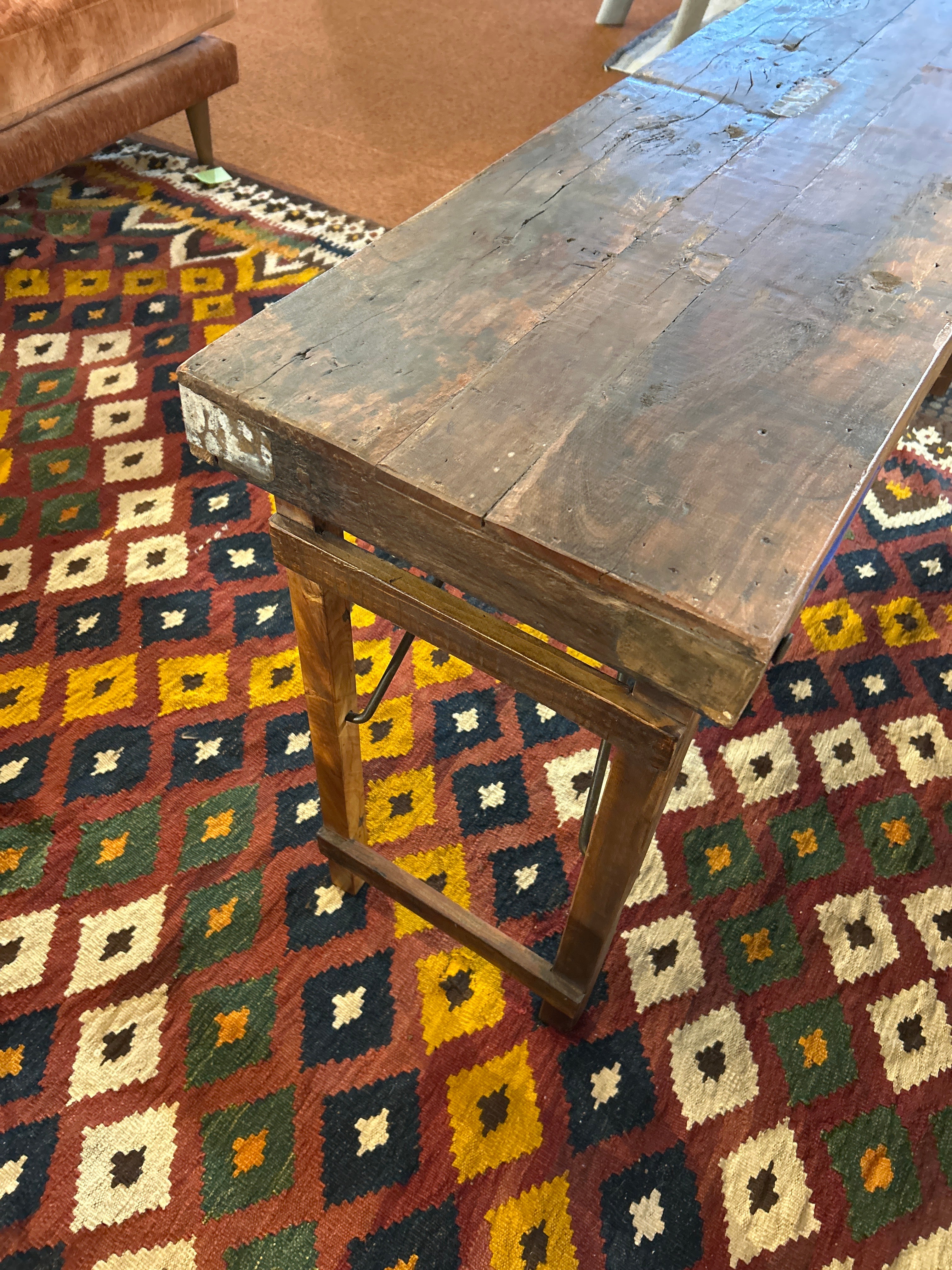 *The table made from old wood has wooden folding legs, metal bars for support.