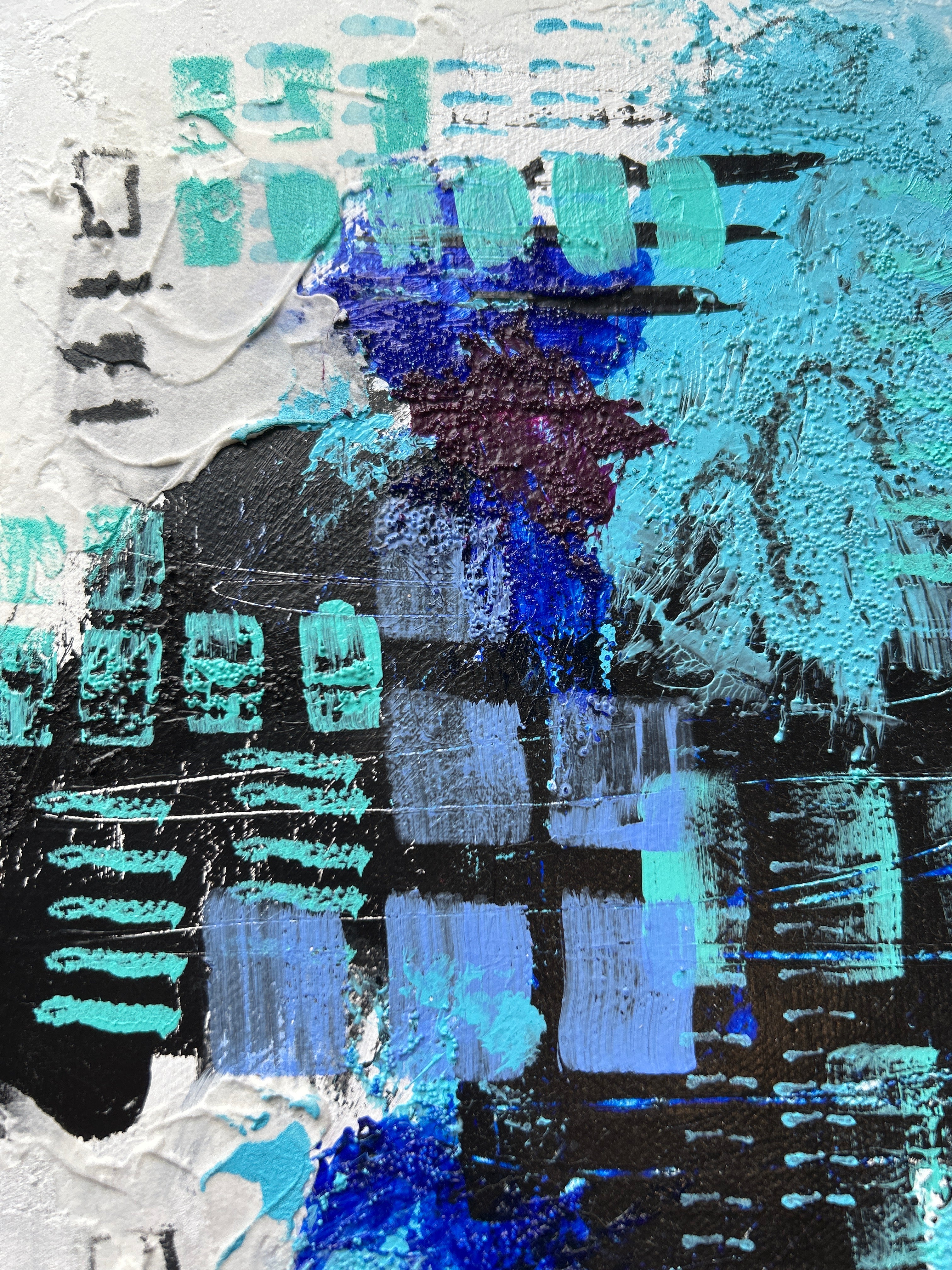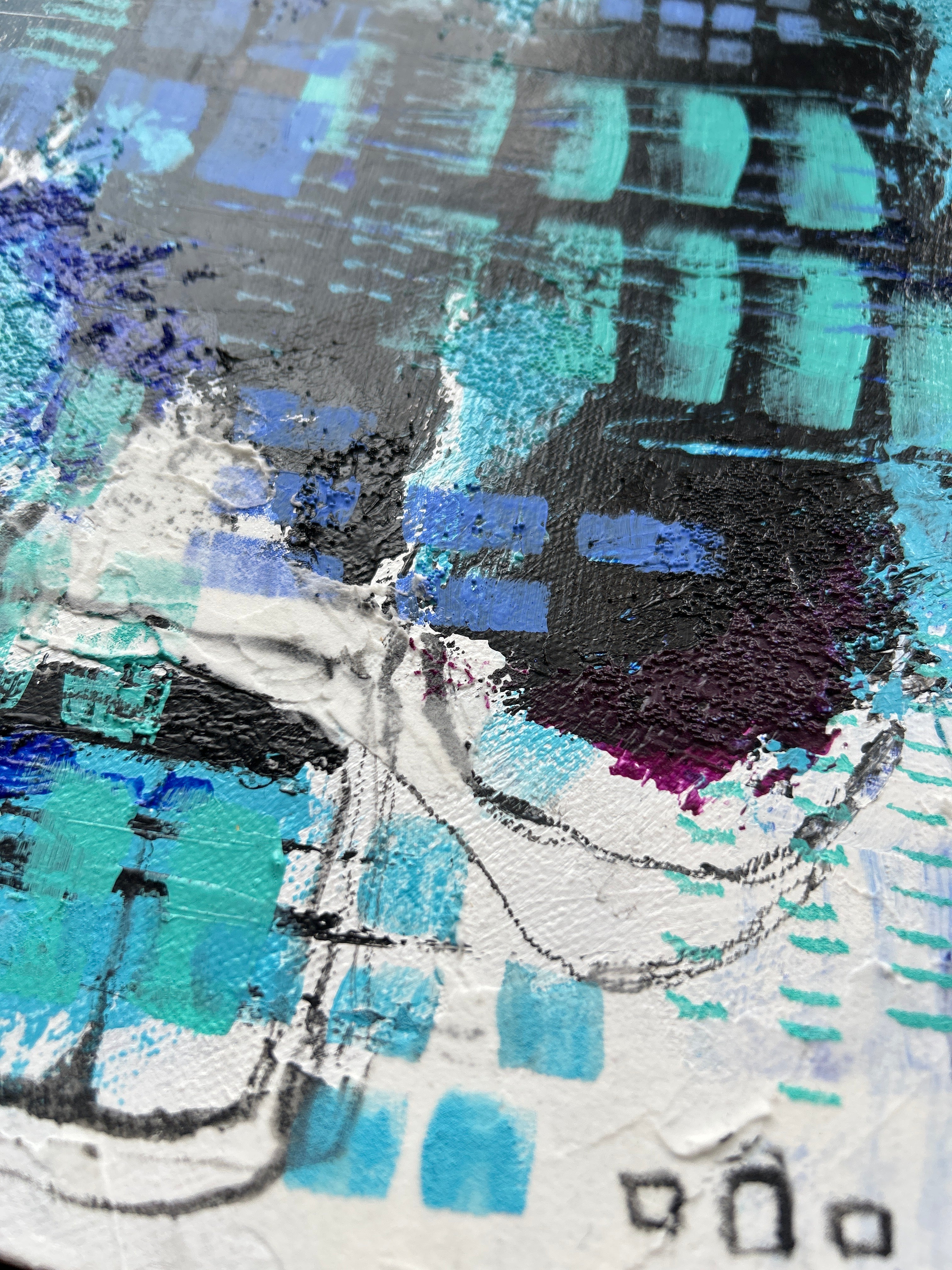 Dynamic interplay of navy/teal/turquoise/purple/white <acrylic> ORIGINAL on canvas; geometric/abstract art