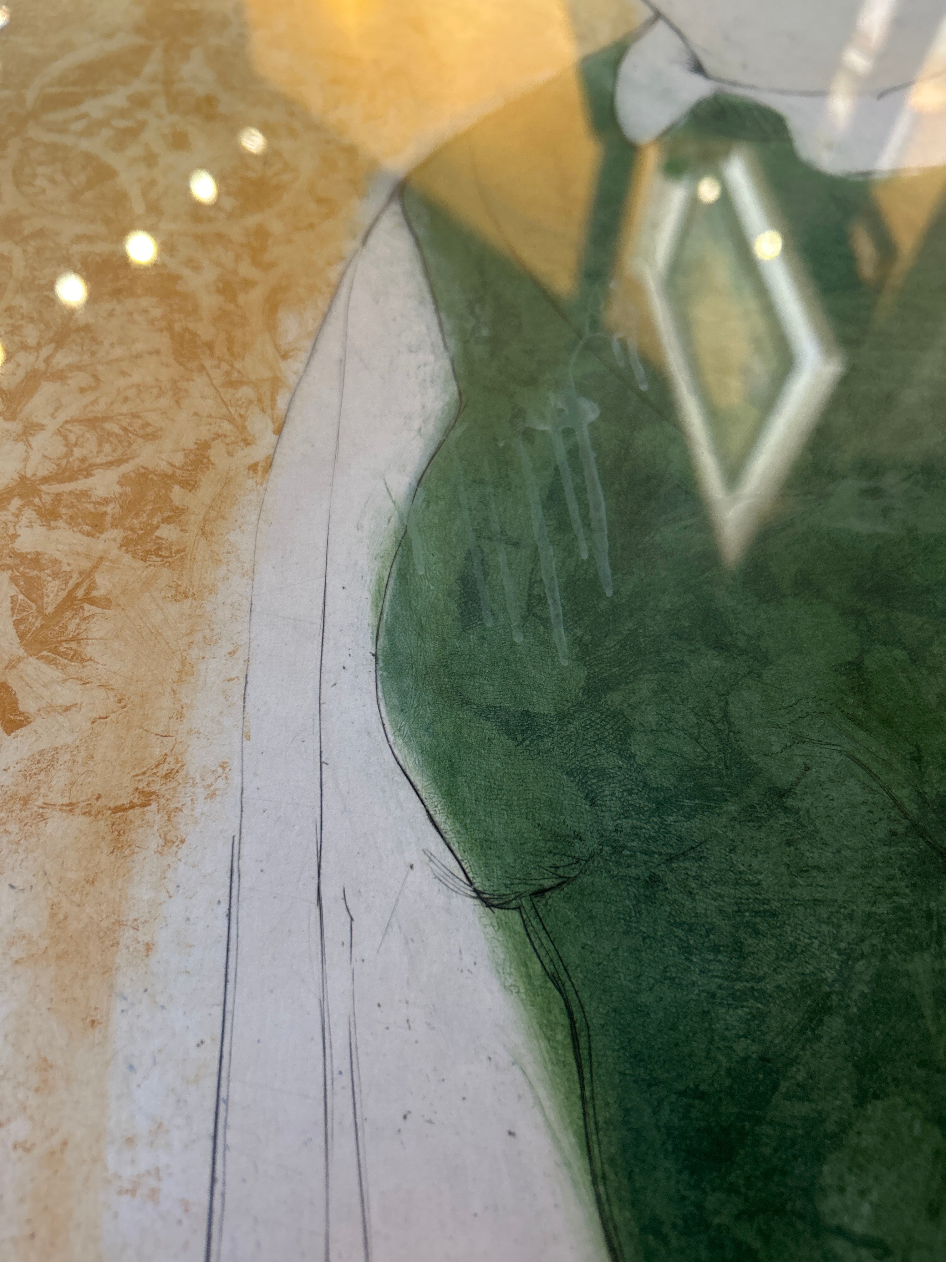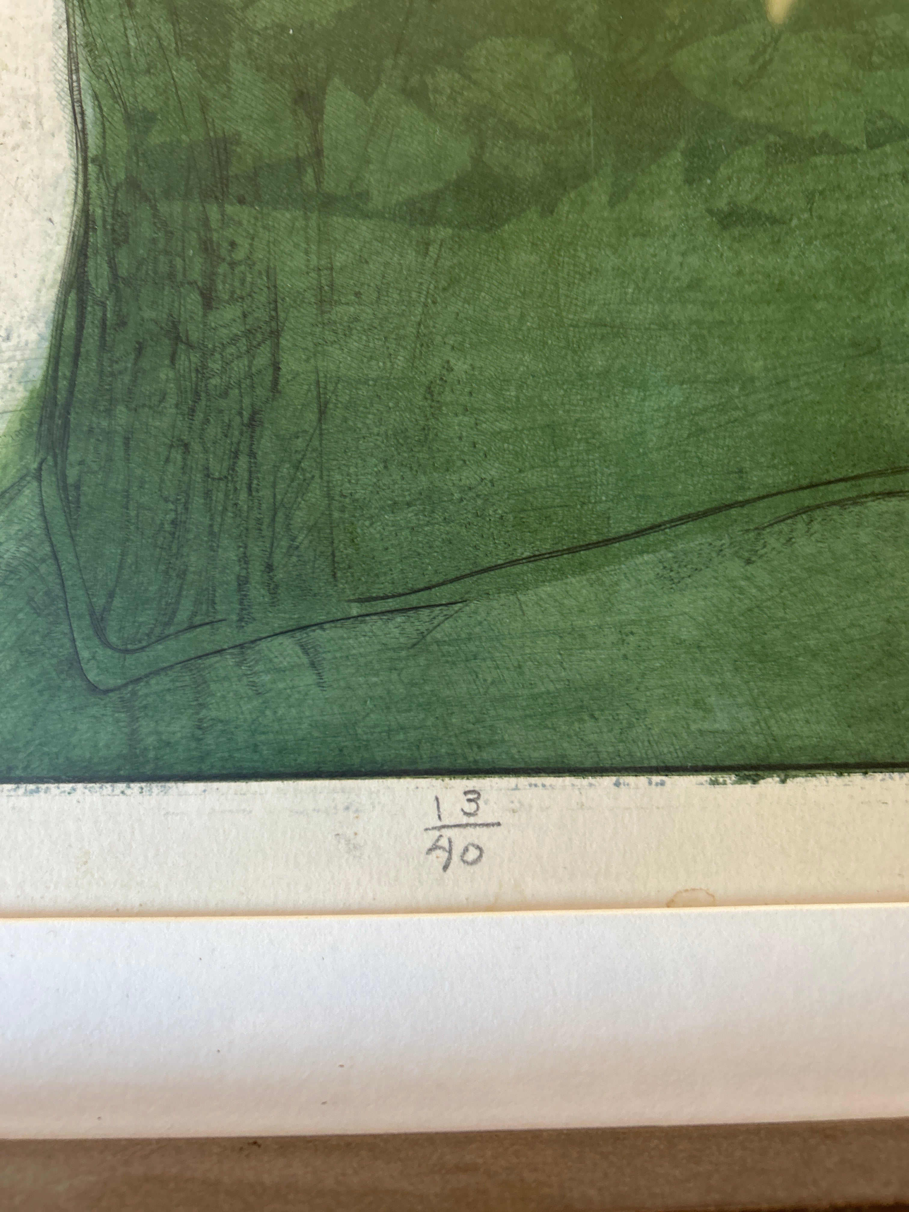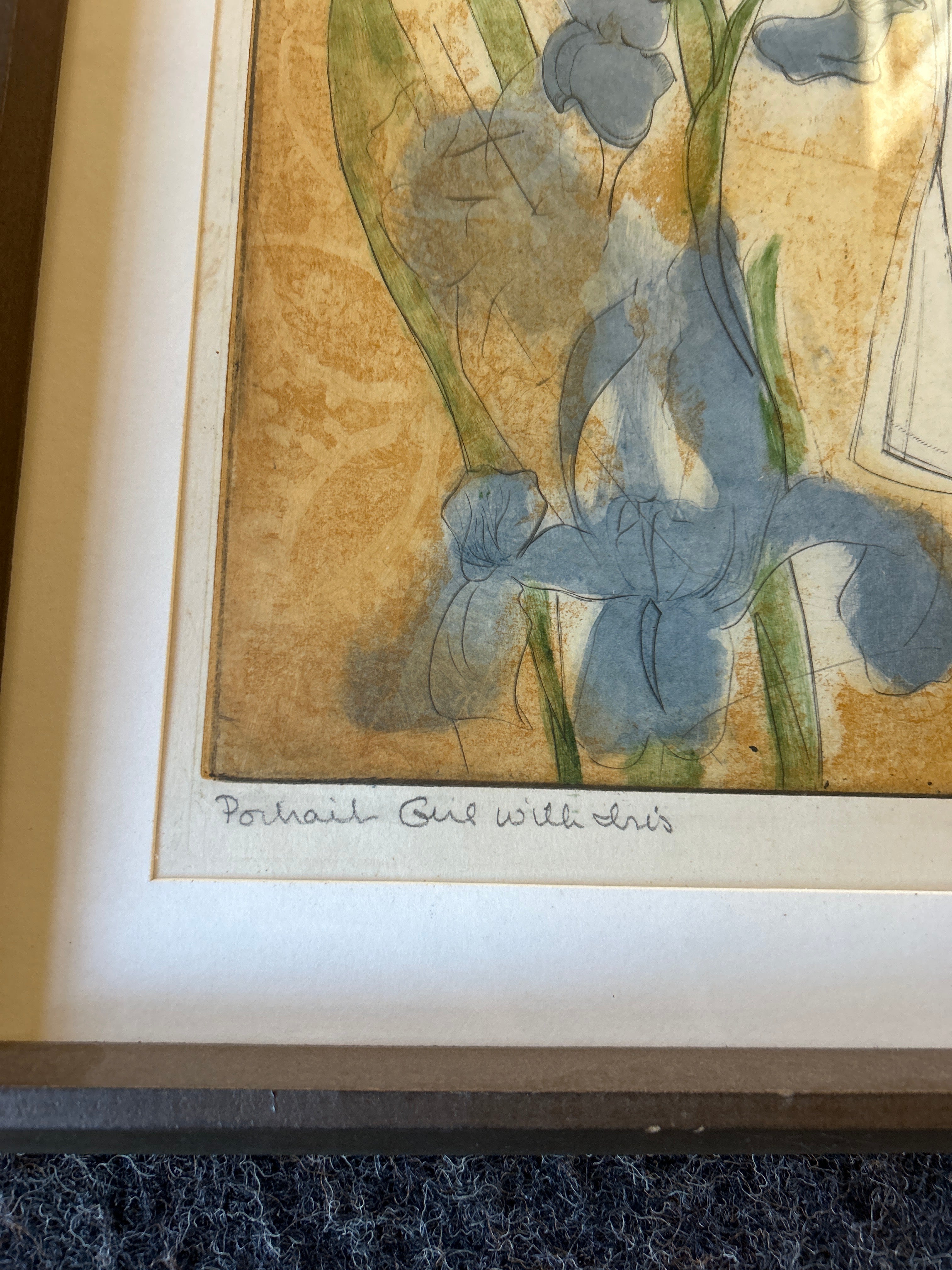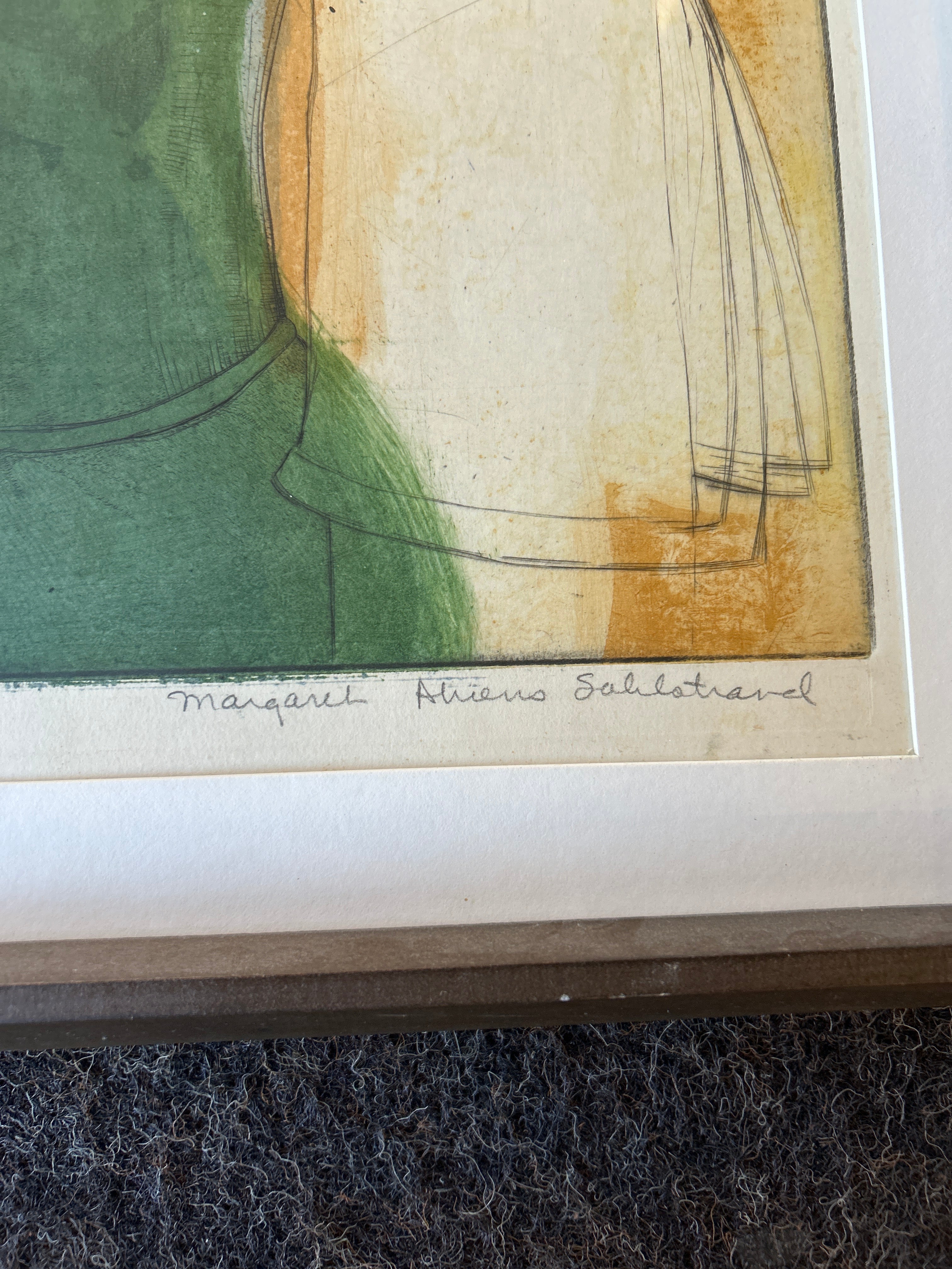Title: Portrait – Girl with Iris Artist: Ahrens Sahlstrand, Margaret (American, 1939 - 2023) Medium: Color intaglio print on paper Date: Not dated Dimensions of Image: 35.75 inches high x 23.625 inches wide Dimensions Framed: 41 inches high x 28.75 inches wide Signature: Signed Margaret Ahrens Sahlstrand in pencil in the front lower right corner. Markings: The title is written in pencil in the front lower left corner. The edition, 13/40, is written in pencil under the center of the image. On the verso of the frame, text in black ink states: GEORGE BARNES RAFT ISLAND GIG HARBOR WASH. Condition: Excellent, there is no apparent damage. Description: In this color print, a female stands and looks towards the viewer. She wears a white long sleeved and collared shirt with a black piece of clothing over the top. Her dark hair is pulled back and she wears a white headband. In the lower left corner of the composition, there are two pale purple irises. The background is yellow with a repeated pattern. The print has a white mat and a narrow wood frame