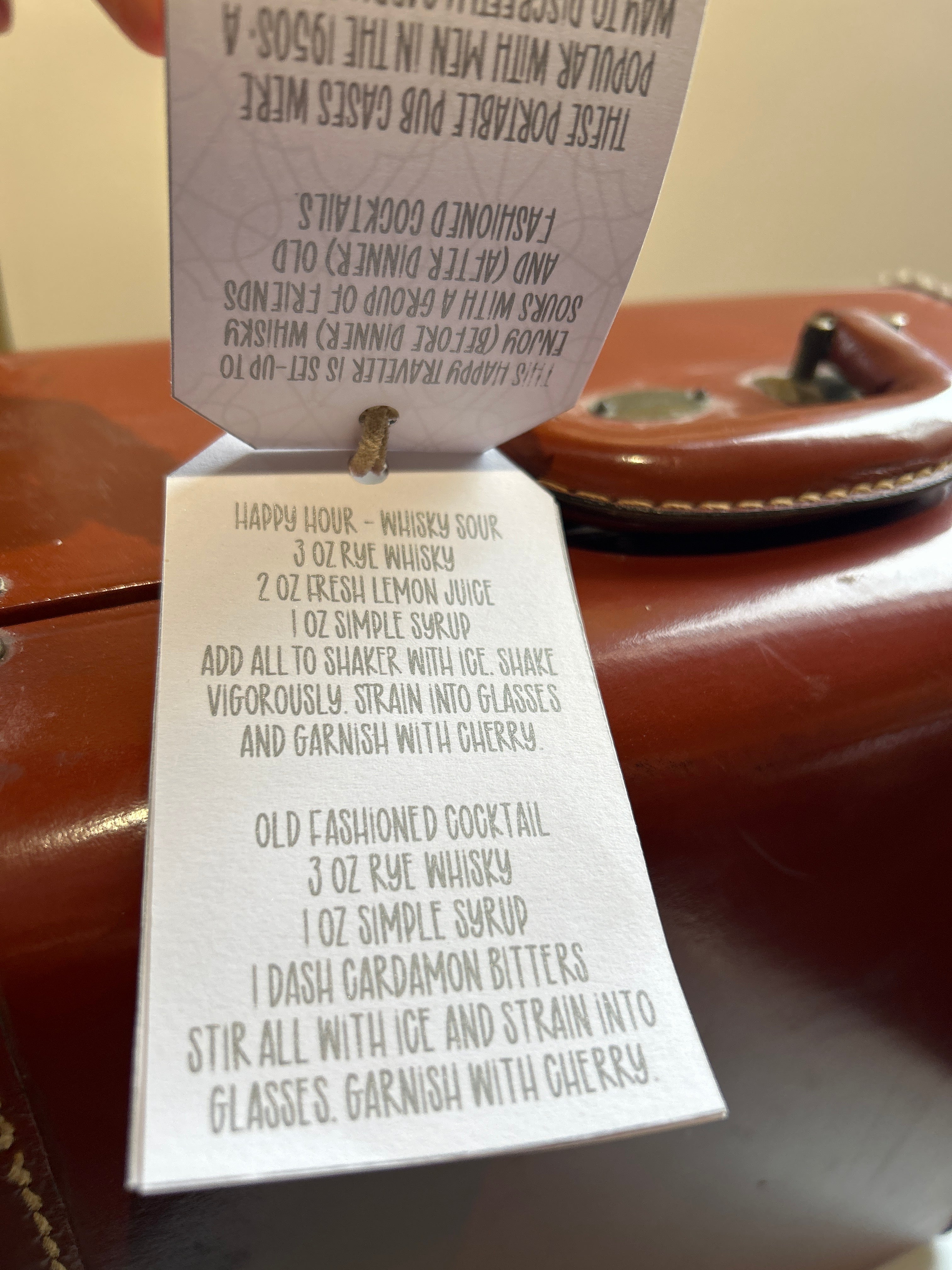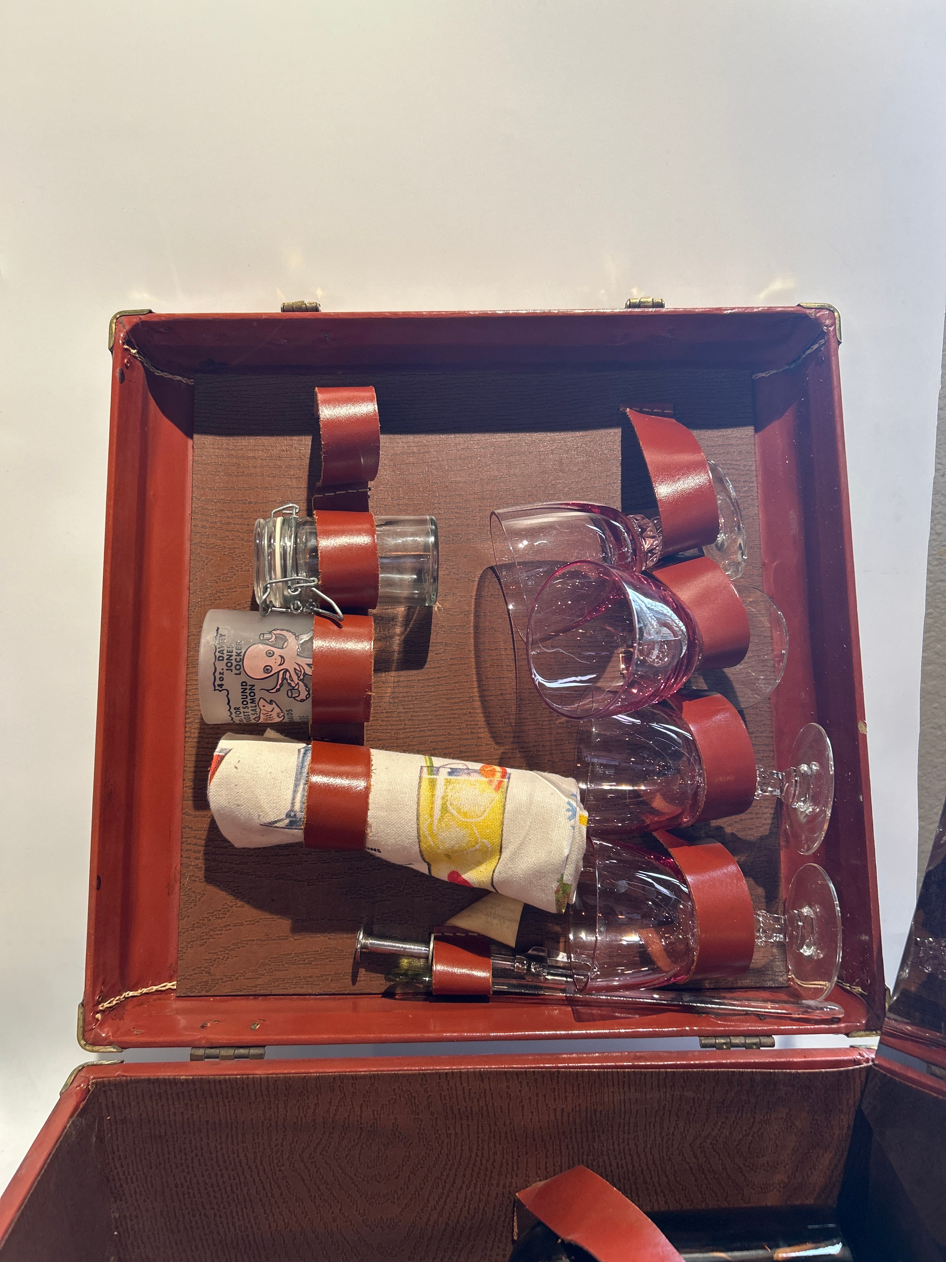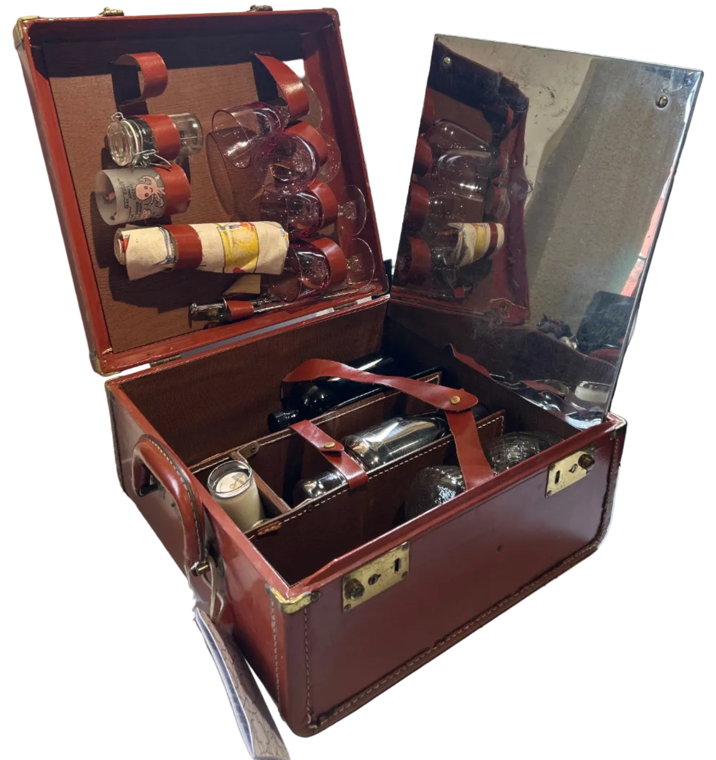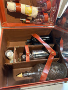 Chestnut brown genuine leather exterior has golden brass hardware and a gold monogram near the handle: E.F.M. The interior is lined with faux wood panel and is filled with various compartments and cocktail accessories.Β
