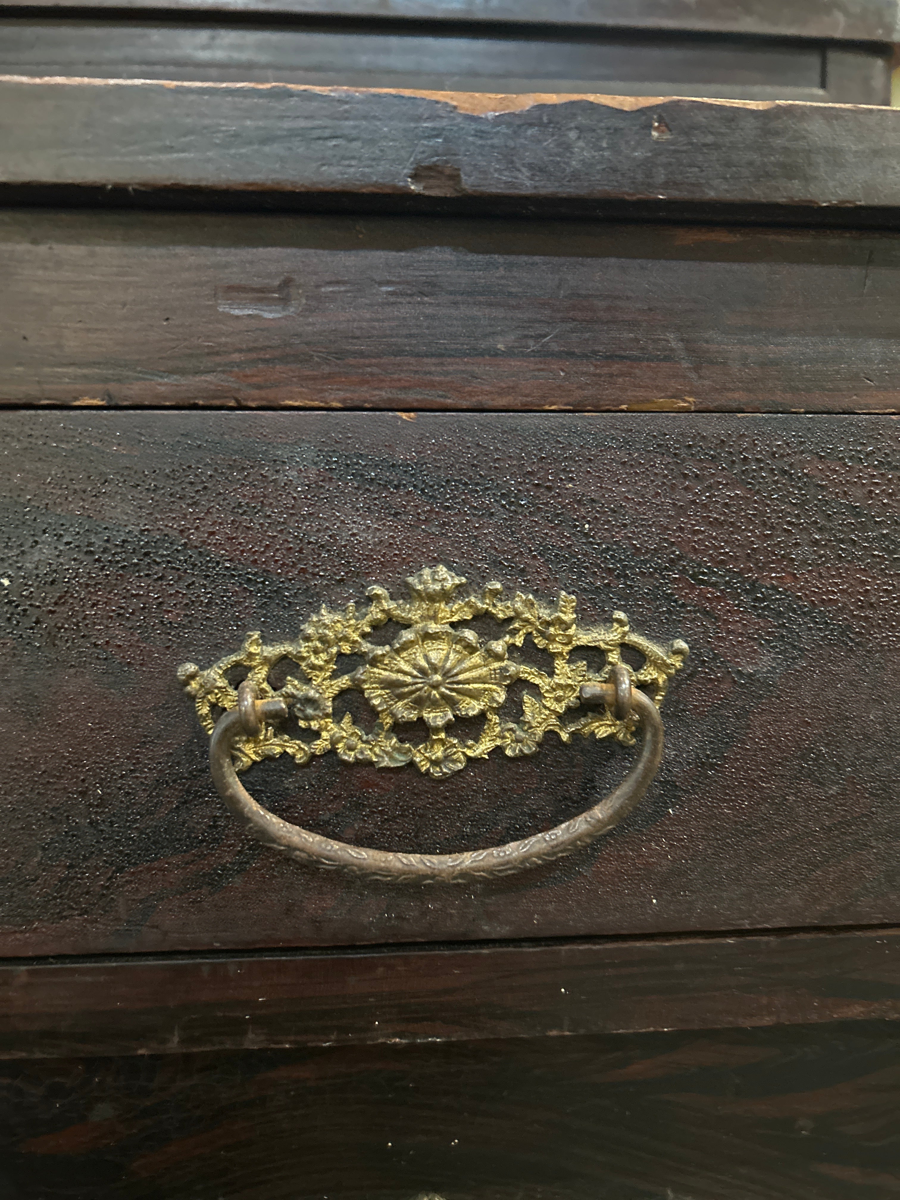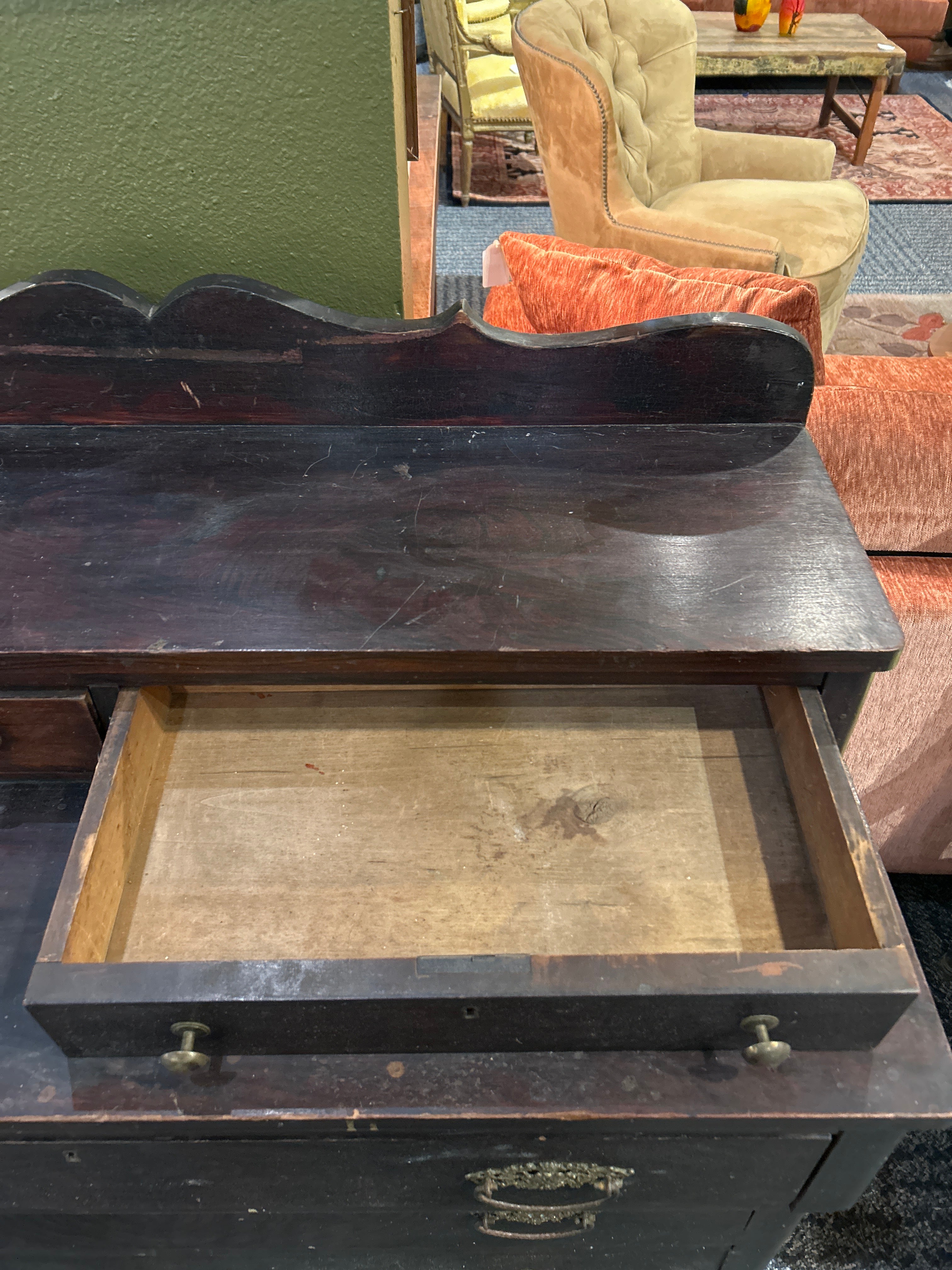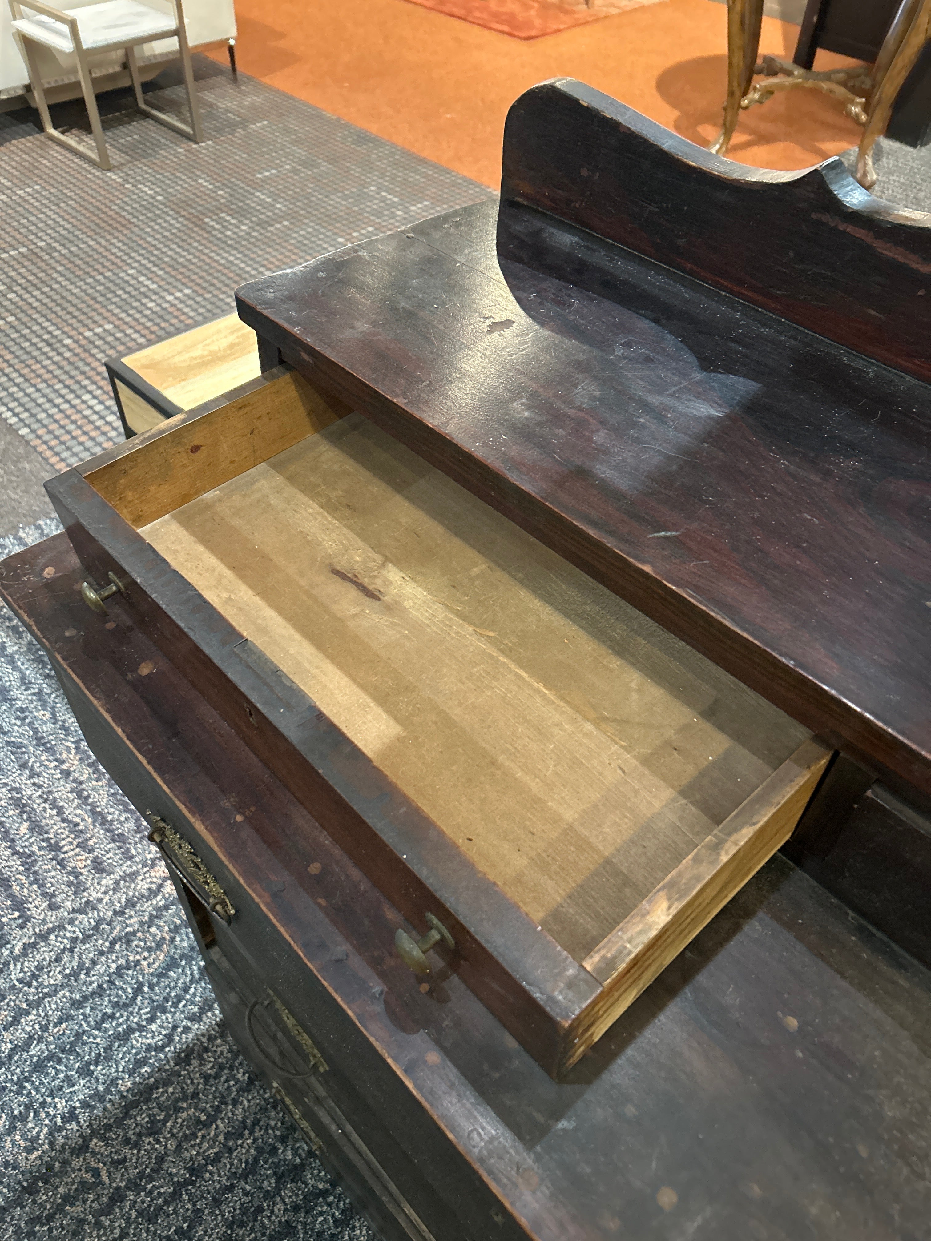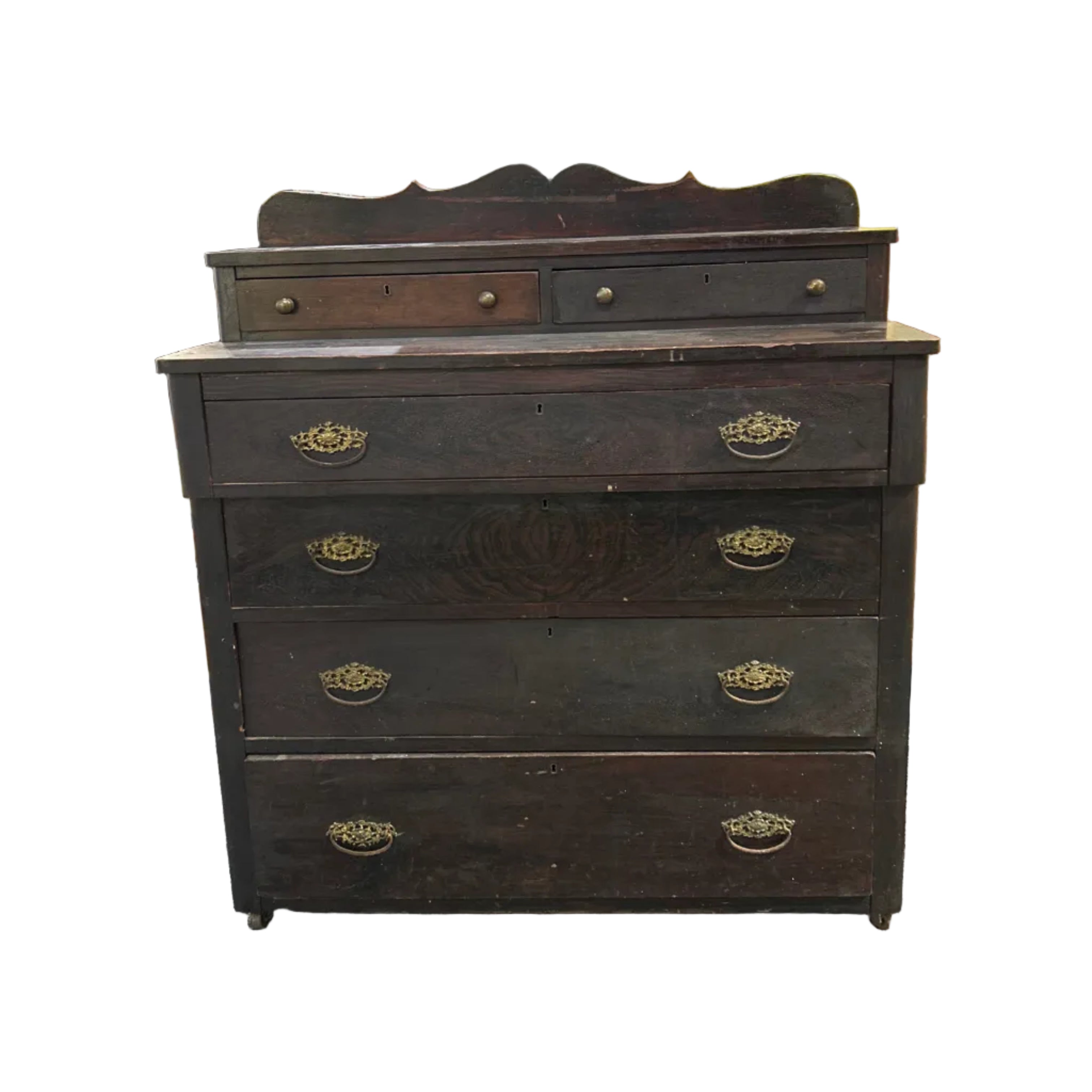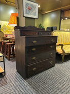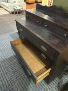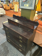 Characterized by its heavy, dark wood appearance, the dresser features a splashback (or gallery back) and ornate hardware, making it a remarkable piece of history that could elevate any room in your home!! (Probably a bedroom)Β