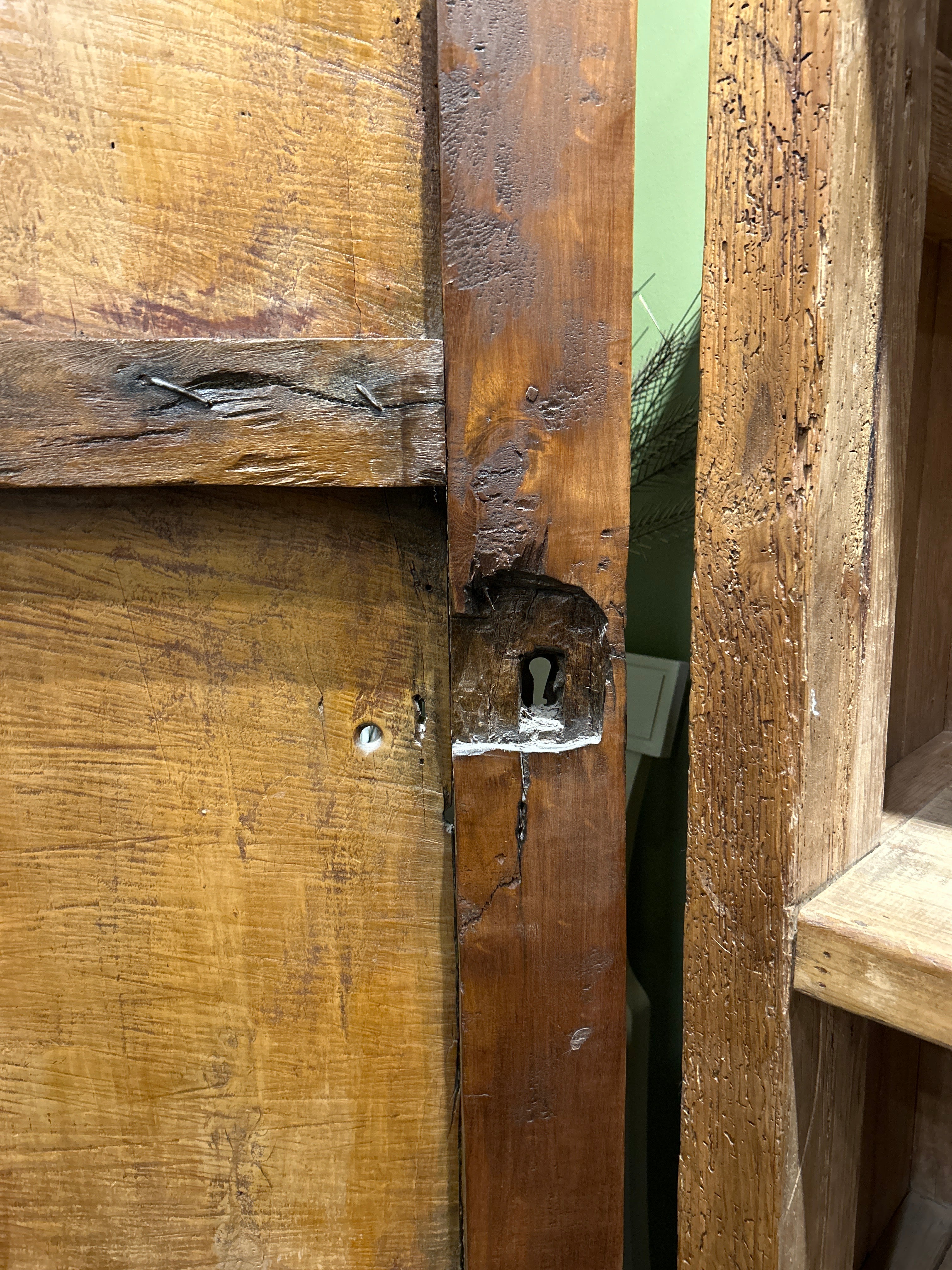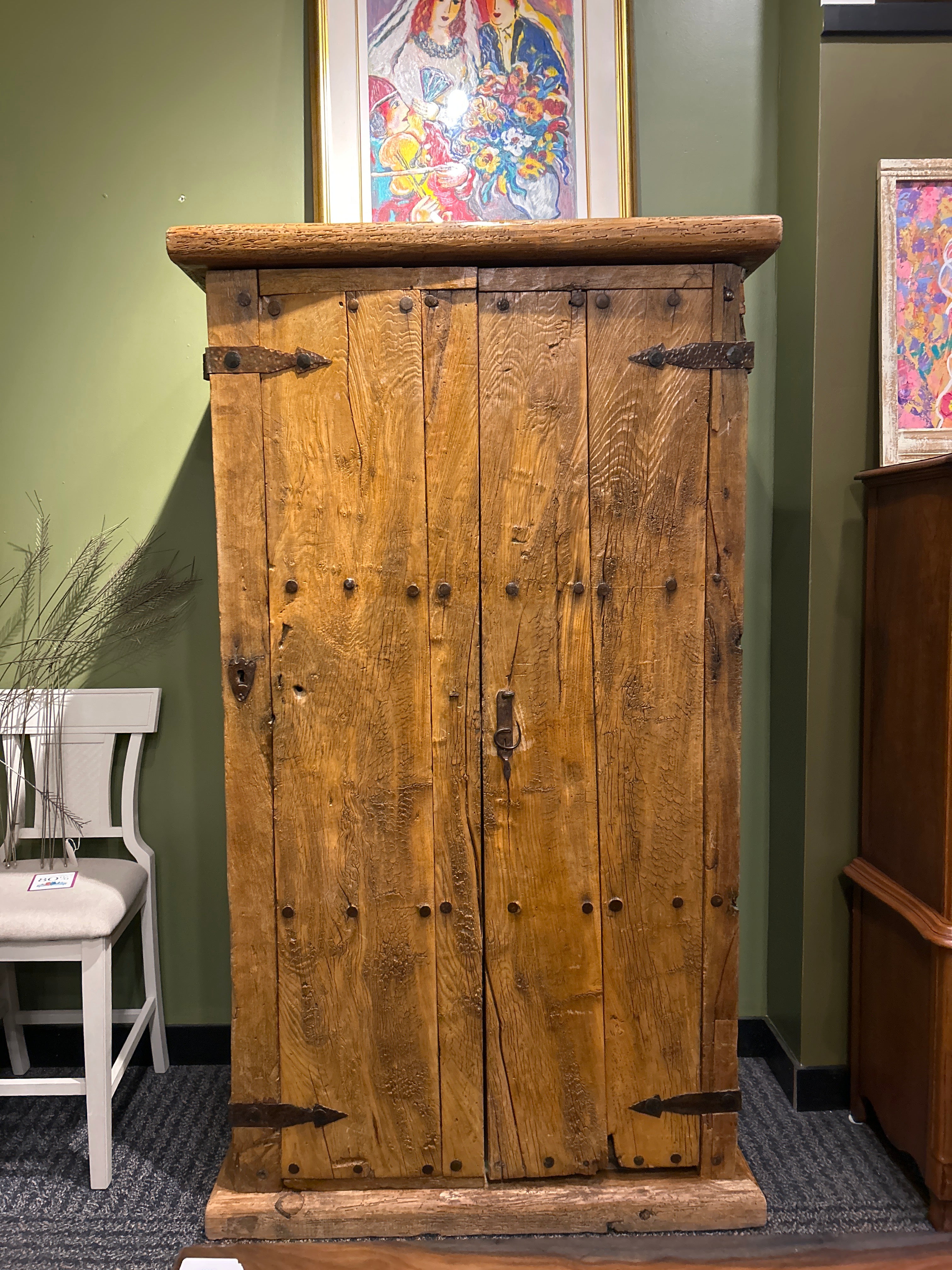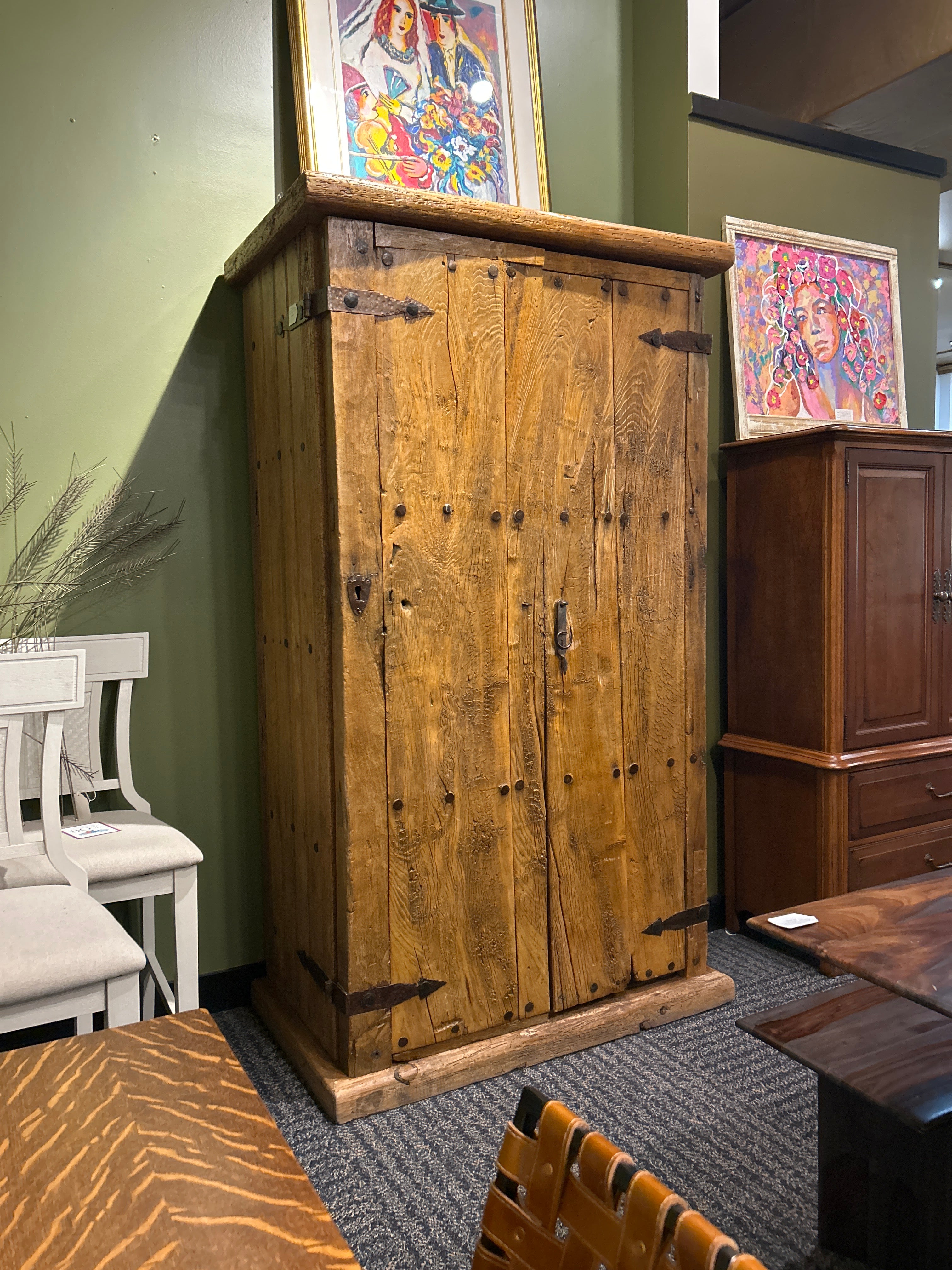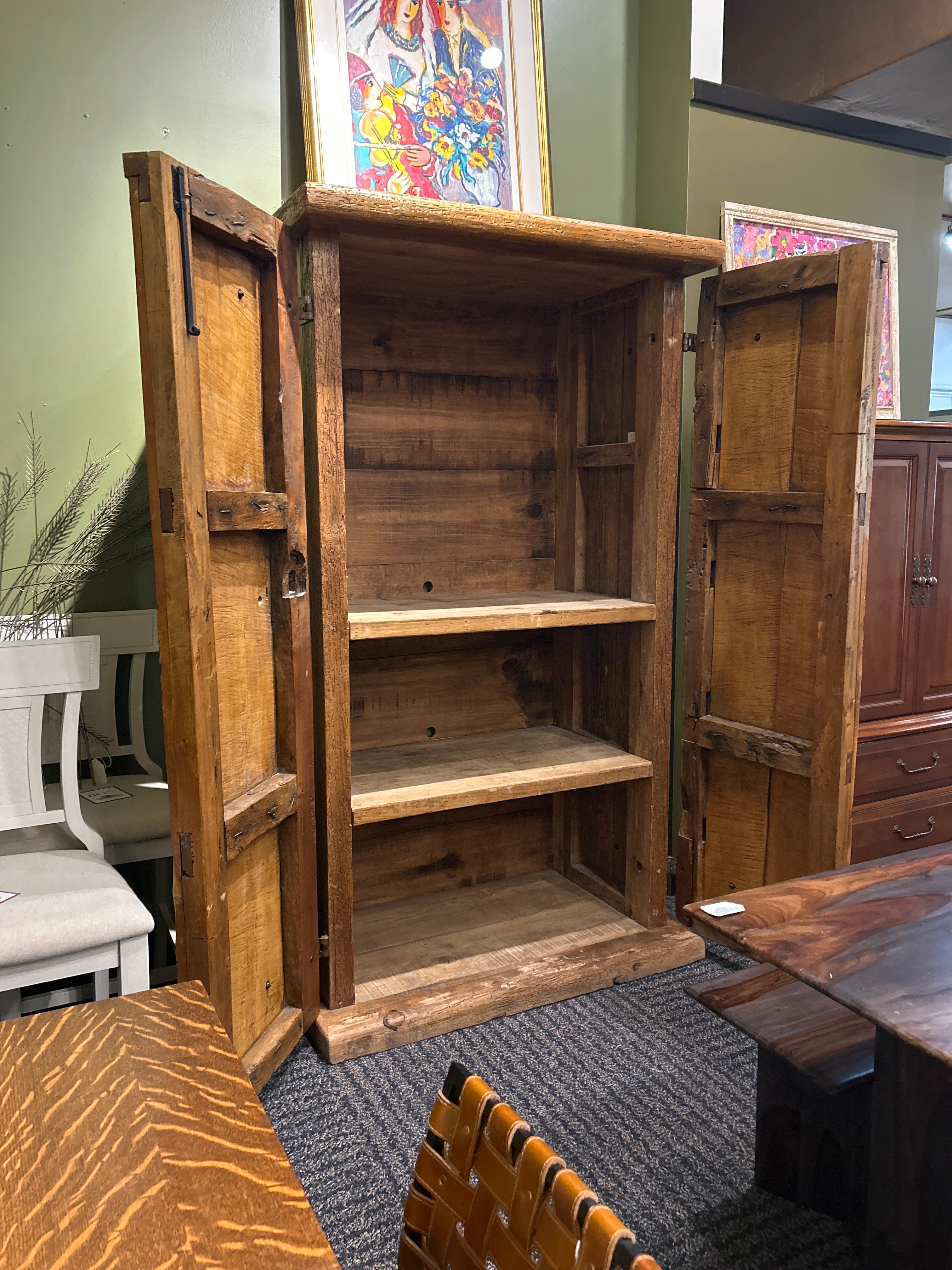 This extraordinary armoire comes with a story as captivating as its design, salvaged from an old church in Mexico, it carries with it a deep sense of history and character. Crafted from what appears to be oak wood (90% sure haha) it features beautifully aged wood, rich texture, and architectural presence that’s truly beyond unique.
