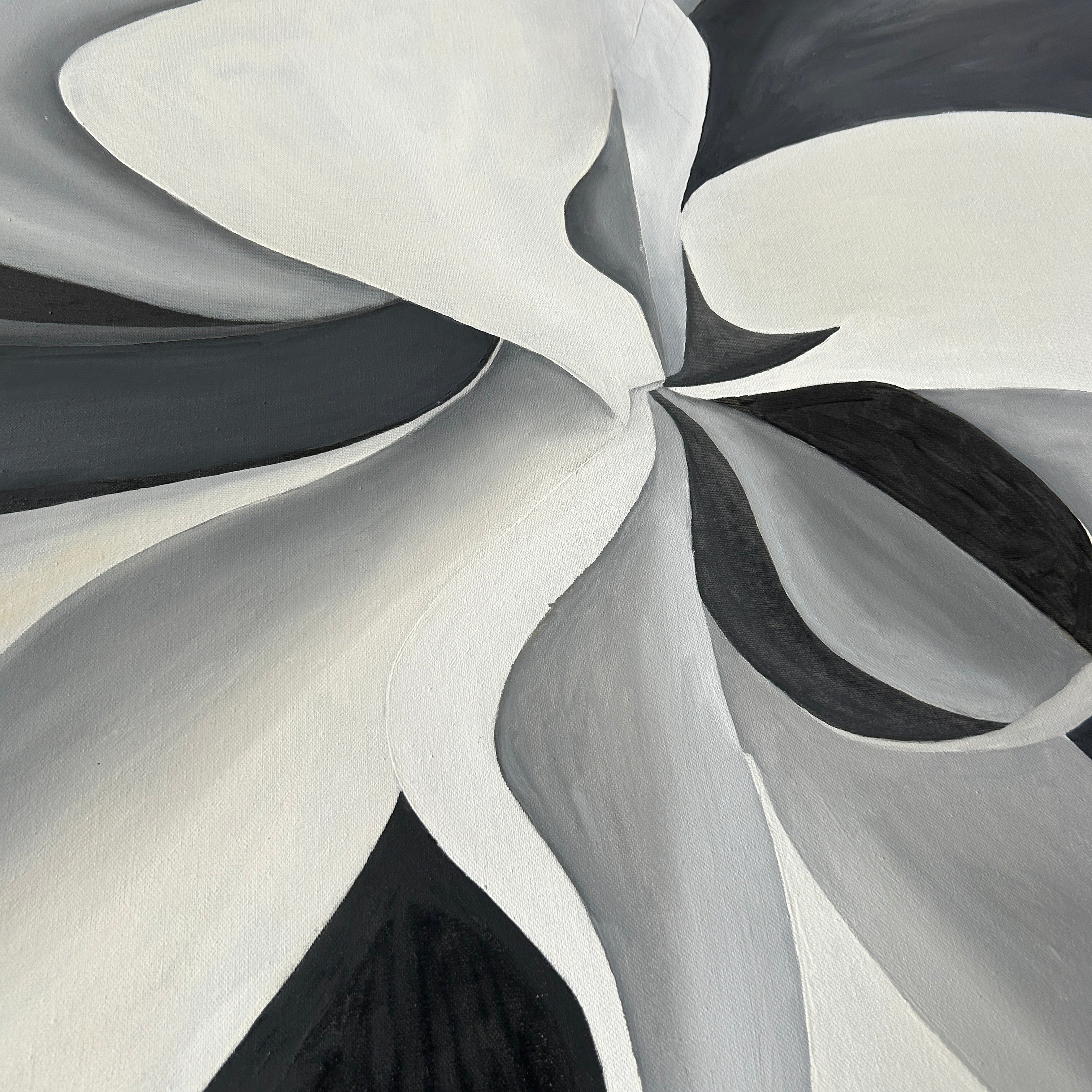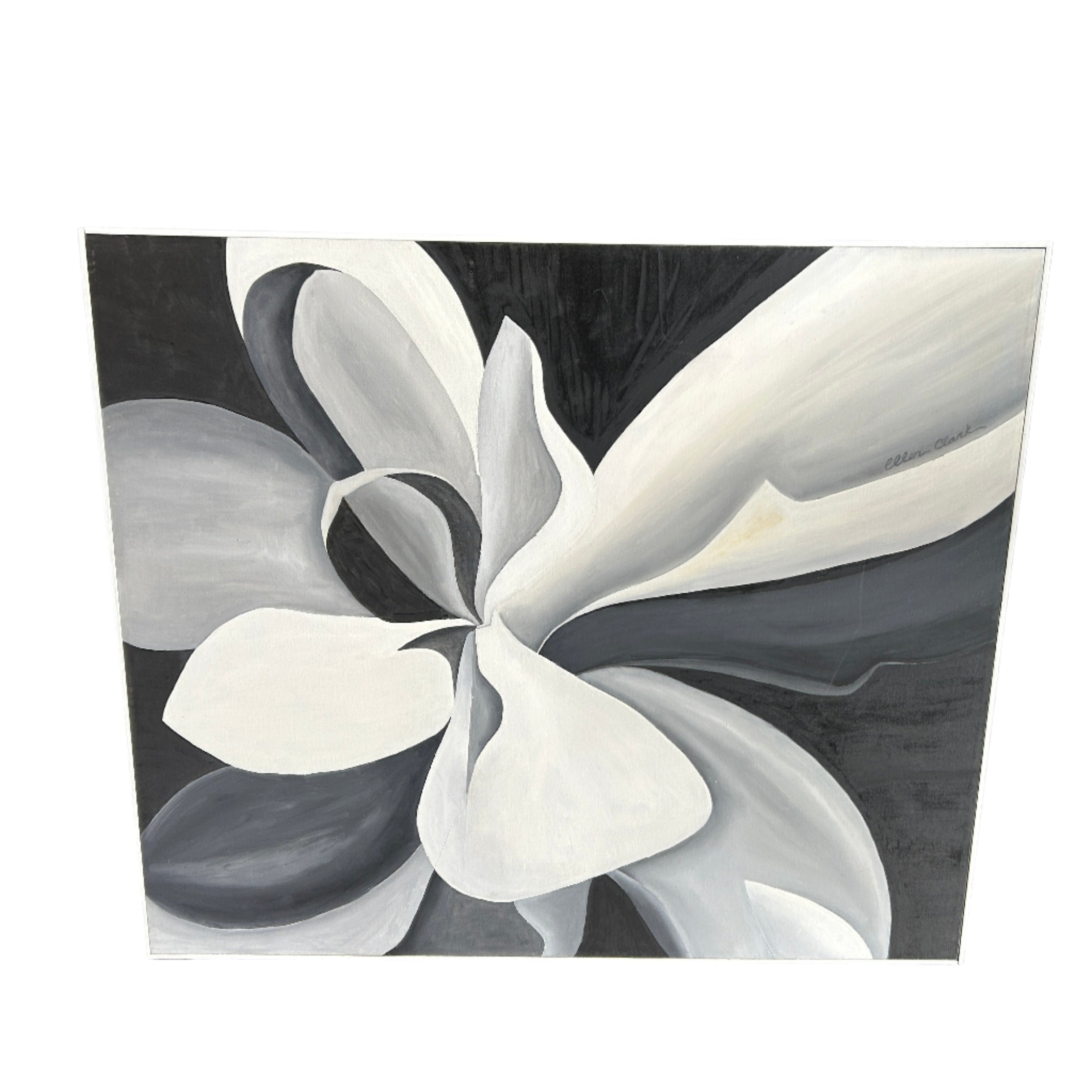 Bold and sophisticated, this original floral painting by Ellen Clark makes a striking statement in monochrome. Flowing abstract petals swirl gracefully across the canvas in shades of black, white, and gray, blending elegance with modern design. At 42.5 inches wide, this large-scale artwork brings dramatic contrast and a sense of movement to any contemporary space. A stunning focal point for living rooms, offices, or minimalist interiors