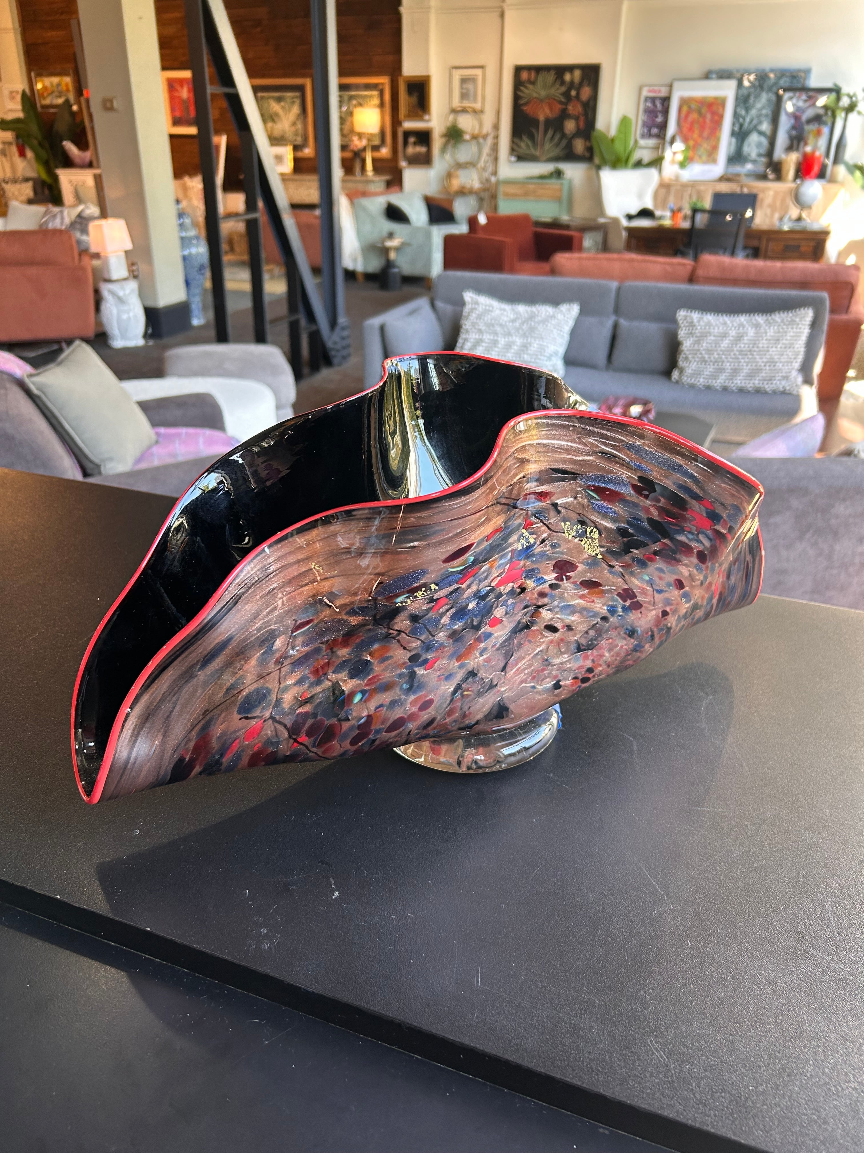 This black rainbow confetti splattered Folded Glass Vase with a red trim landing is shaped with eye-catching curves and folds that evoke organic forms and imbue the piece with a feeling of motion.