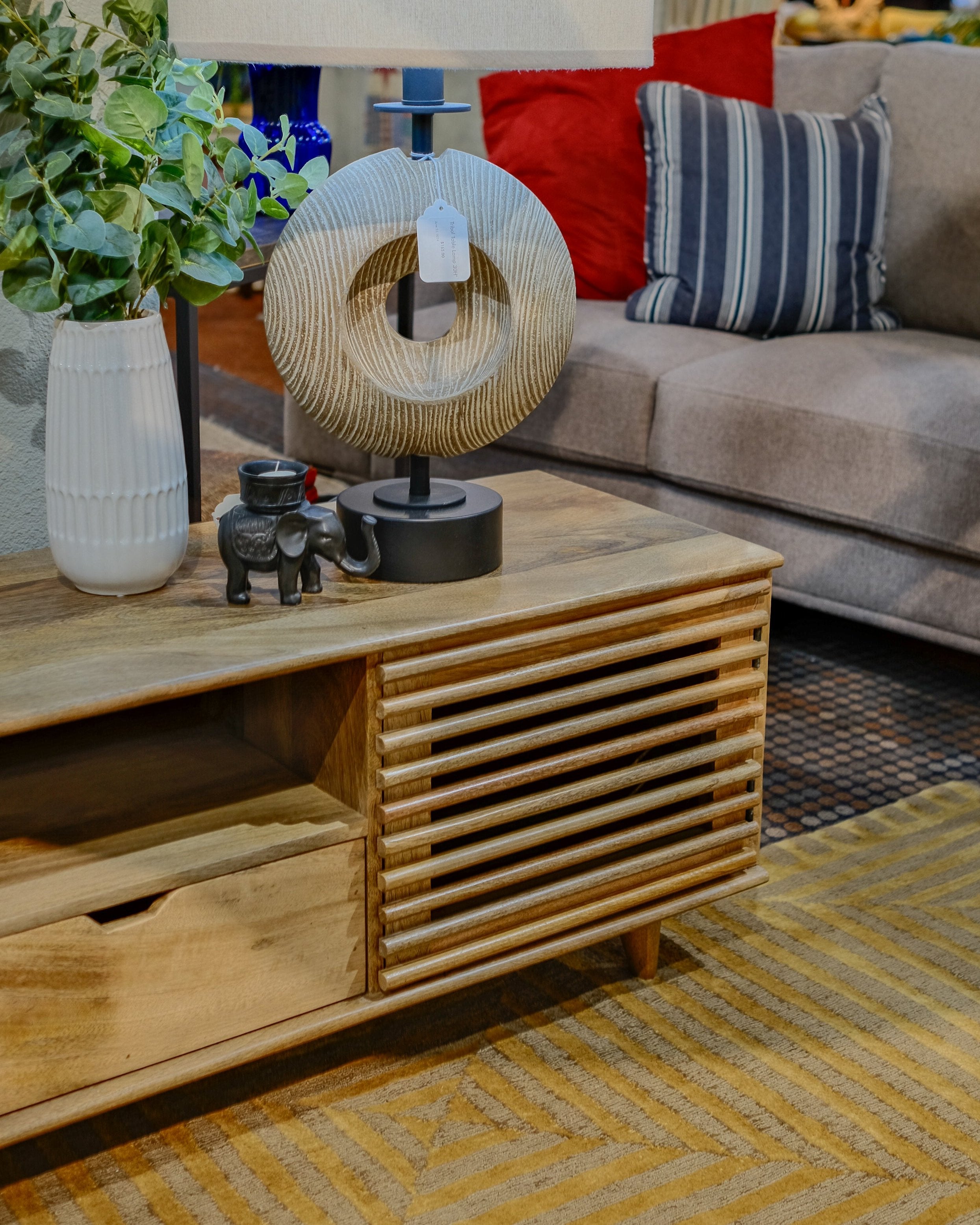 This sleek media console combines functionality with a timeless mid-century modern aesthetic. Featuring a unique slatted design and natural wood tones, it brings warmth and character to any space. The piece includes spacious storage options with open shelving and a pull-out drawer, perfect for organizing electronics, decor, or essentials. Its compact yet stylish profile makes it a versatile addition to living rooms, offices, or entertainment spaces. Complete your setup with this elegant and practical piece!