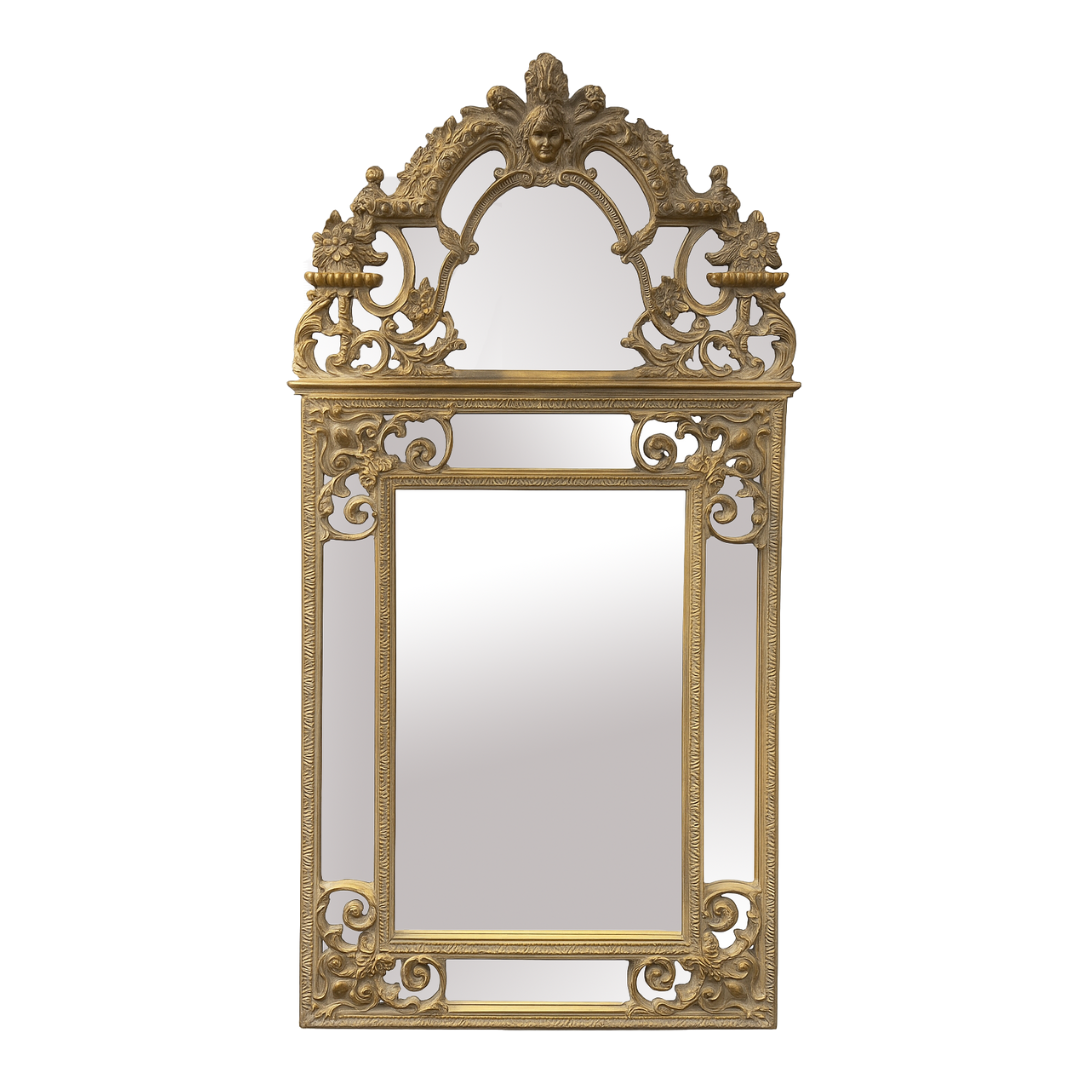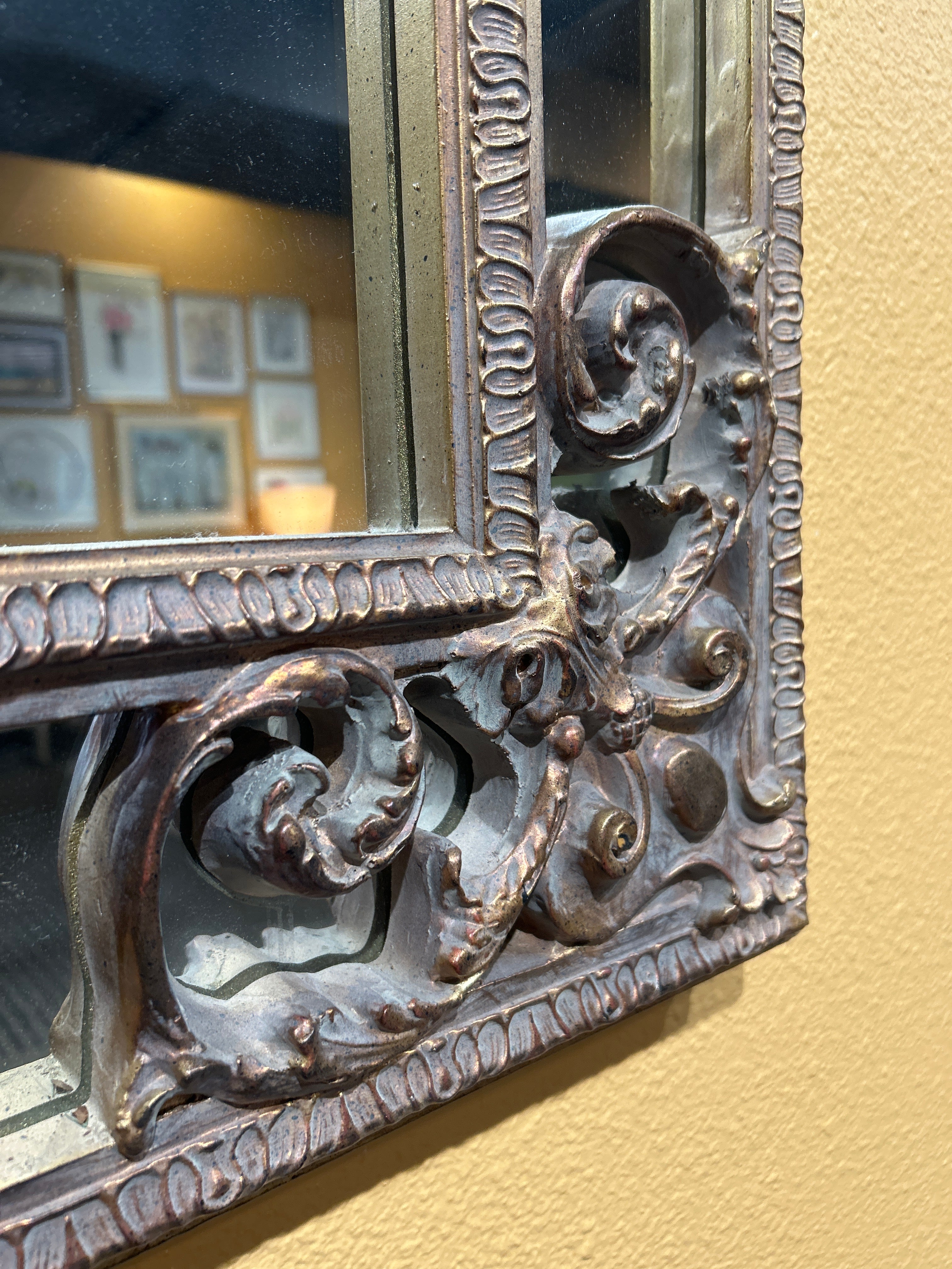 This stunning Continental Rococo carved giltwood mirror, measuring 29" x 58", beautifully captures the elegance of gothic architecture with a continental Regency flair. Its intricate design is reminiscent of the grandeur found in Notre Dame, making it a striking statement piece that adds timeless charm and sophistication to any room. Perfect for those who appreciate classic artistry and refined style.