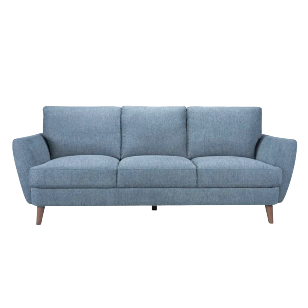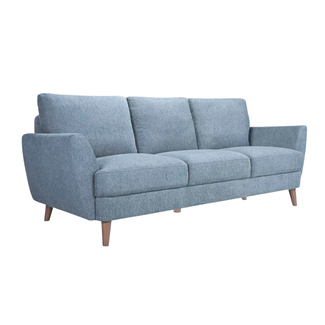 Elevate your living space with our contemporary BROOKLYN sofa set, featuring a three-seater sofa and a matching loveseat and chair that blend modern design with classic comfort. The pieces boast flared arms and tapered pegged legs, creating a sleek silhouette that exudes sophistication. Upholstered in a soft blue fabric, the set invites relaxation while making a bold statement. The durable construction promises enduring style and support.