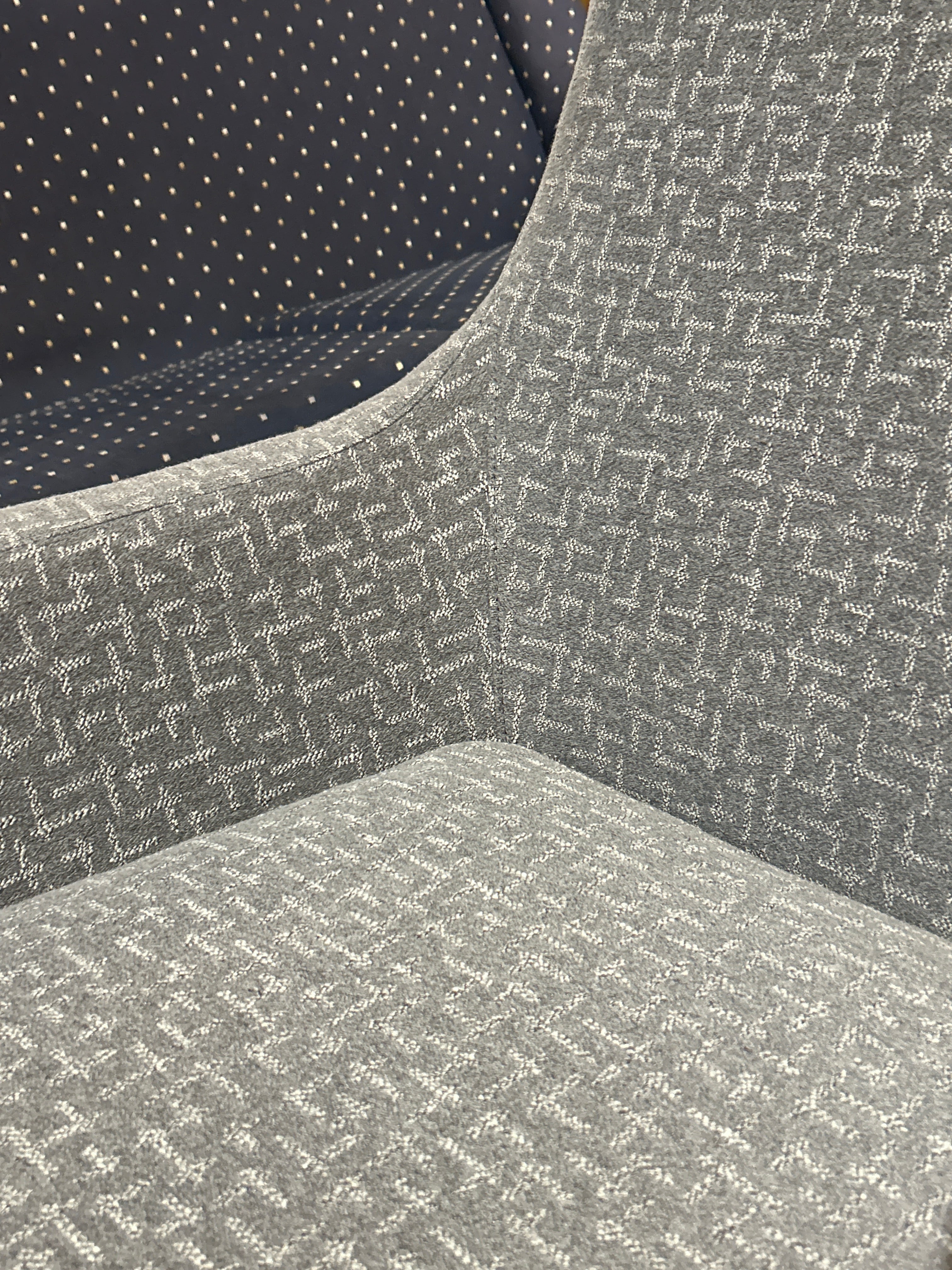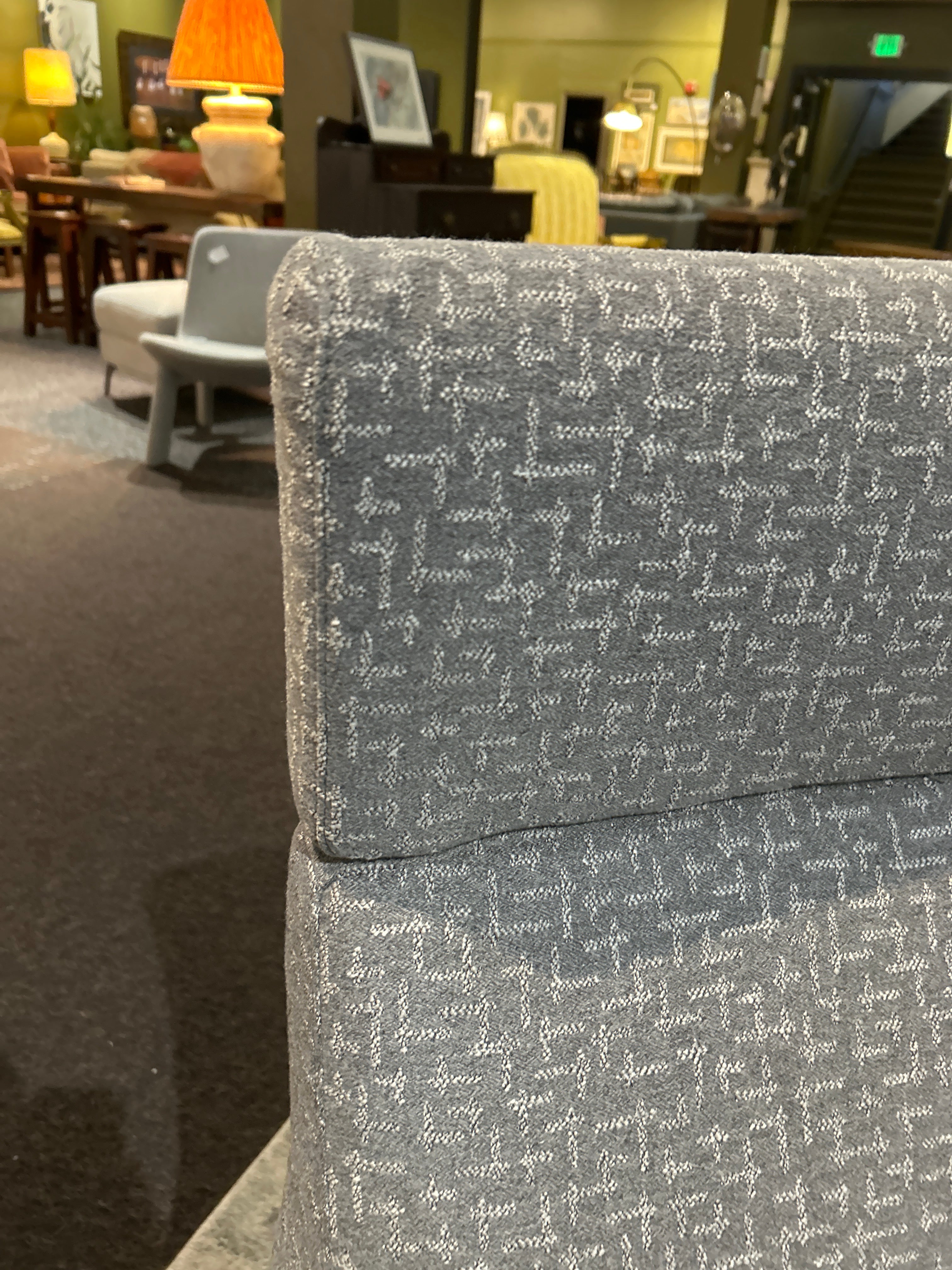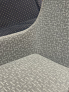 The upholstery features a subtle yet intricate gray and white geometric weave, offering a textured look that hides wear beautifully while remaining soft to the touch. Its high-back design provides excellent support, transitioning into integrated sloping armrests for a streamlined, "winged" aesthetic.
