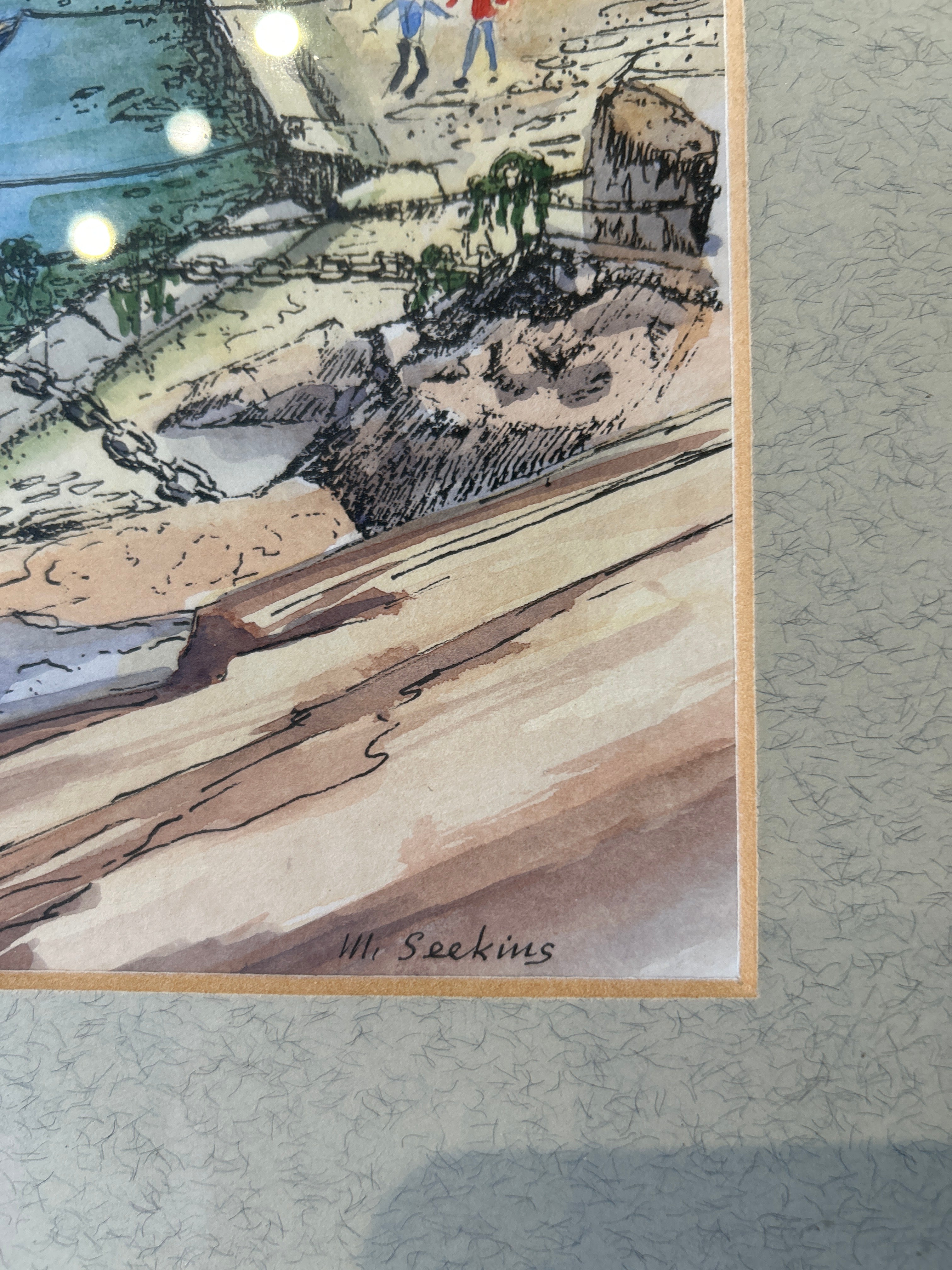 A captivating watercolor rendering of the picturesque Yorkshire coastline at Robin Hood's Bay, beautifully executed and authenticated with the artist's signature by M. Seekins. This charming seascape brings timeless English coastal beauty into your space.