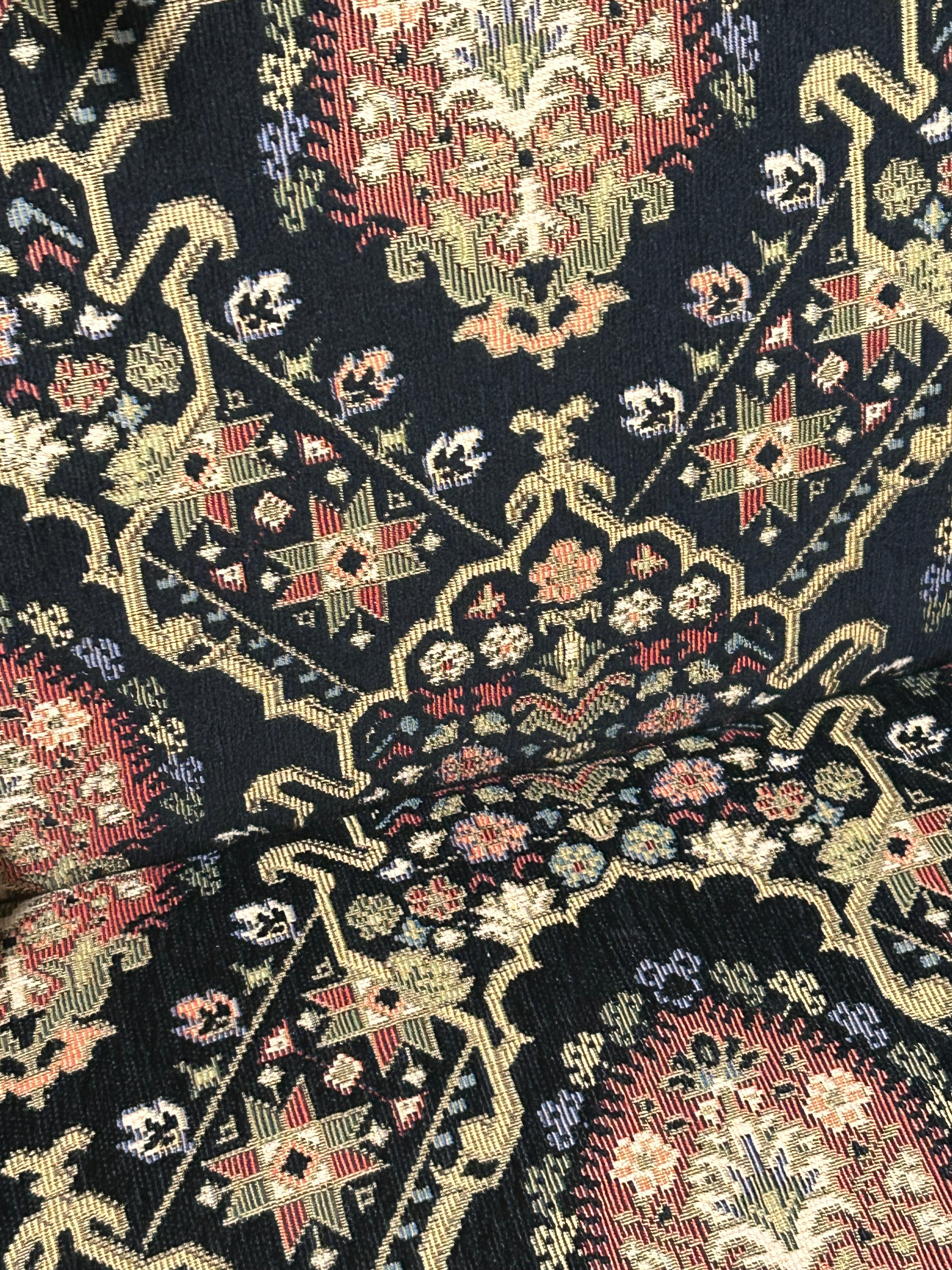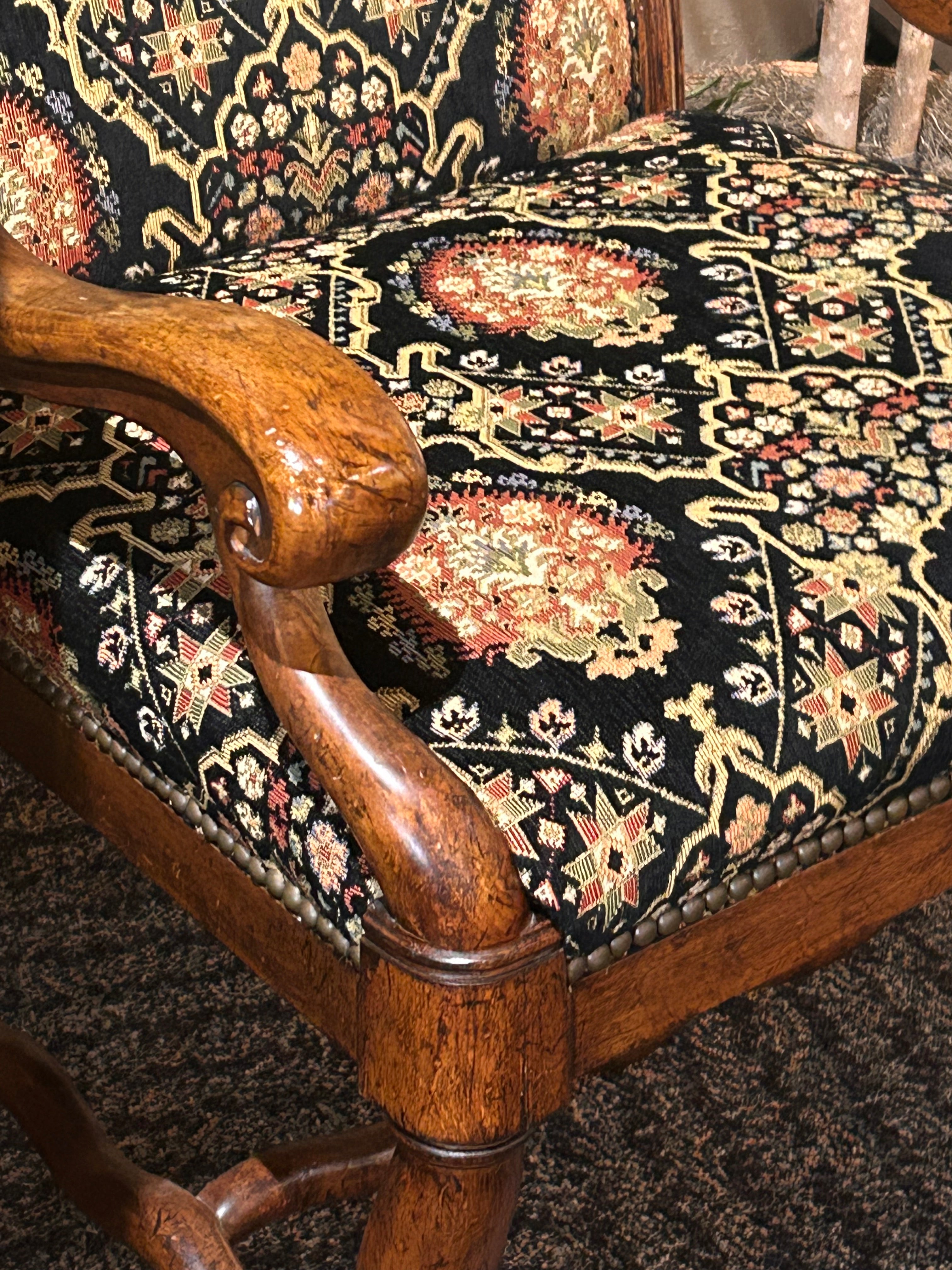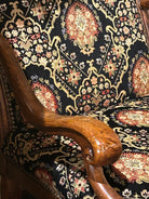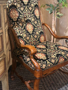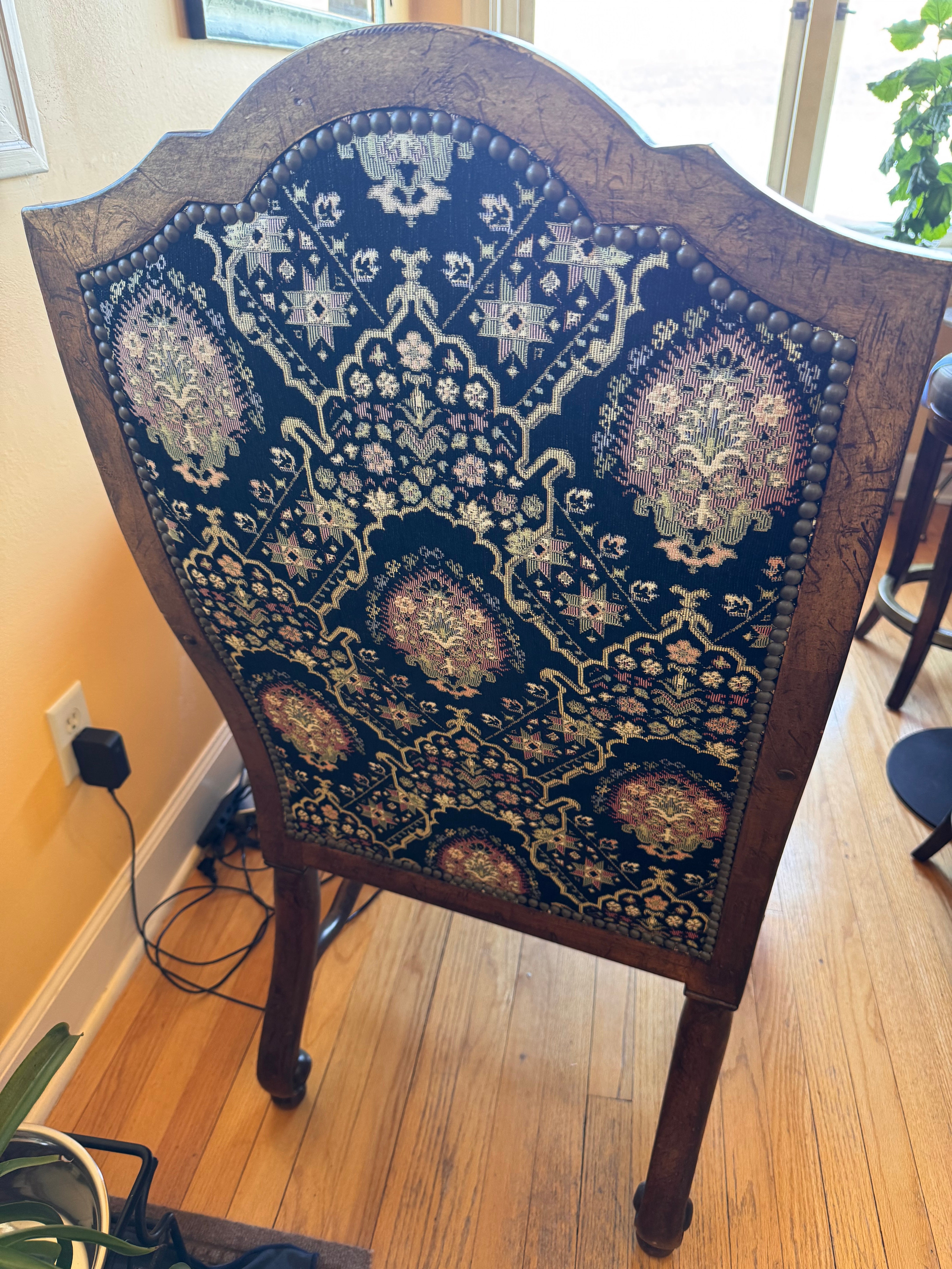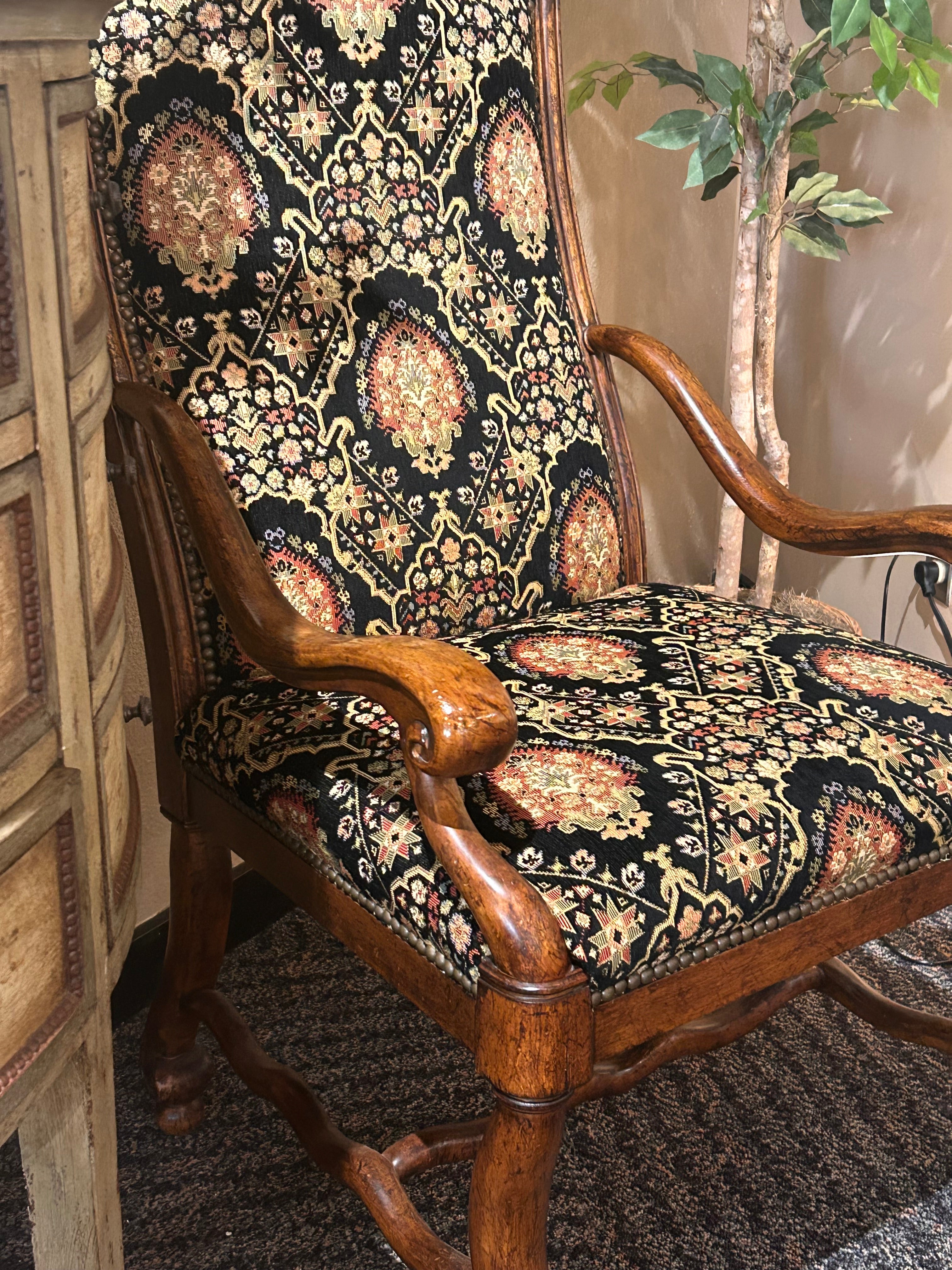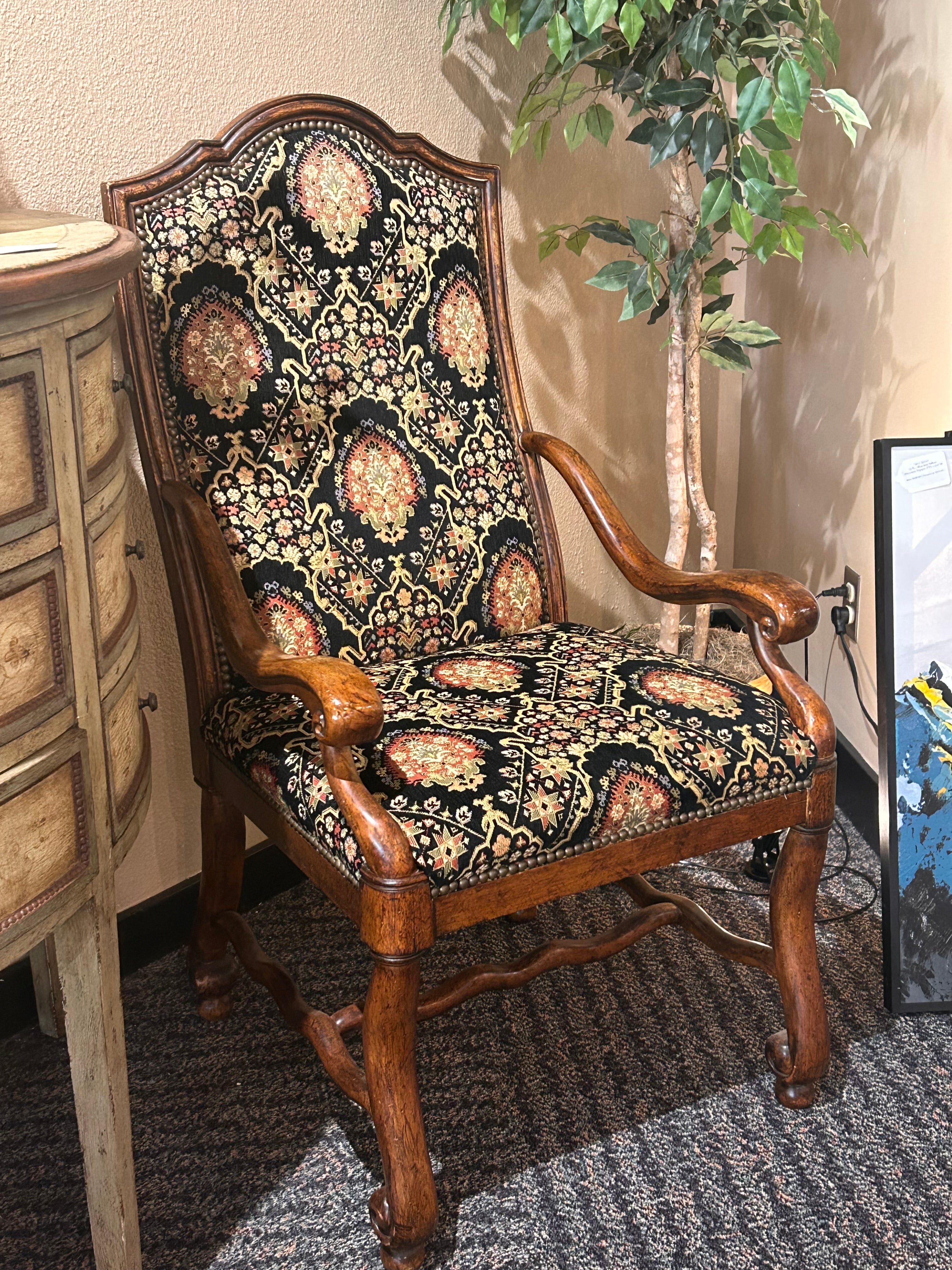 Drexel Heritage Tuscany Upholstered Chair, a stunning piece that combines classic craftsmanship with botanical charm. Upholstered in a high-quality fabric featuring a rich, botanical pattern, this chair is in perfect condition—a true gem for any room in your home.