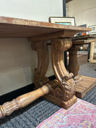 The Italian Oak Handcrafted Specialty Table is a masterpiece of artisanal craftsmanship, spanning 74" in length, 26" in width, and standing 31" tall. This imposing, heavy table features intricately carved legs inspired by classical Doric and Ionic columns, their sweeping curves and fluted details adding a grand architectural presence to any dining space.