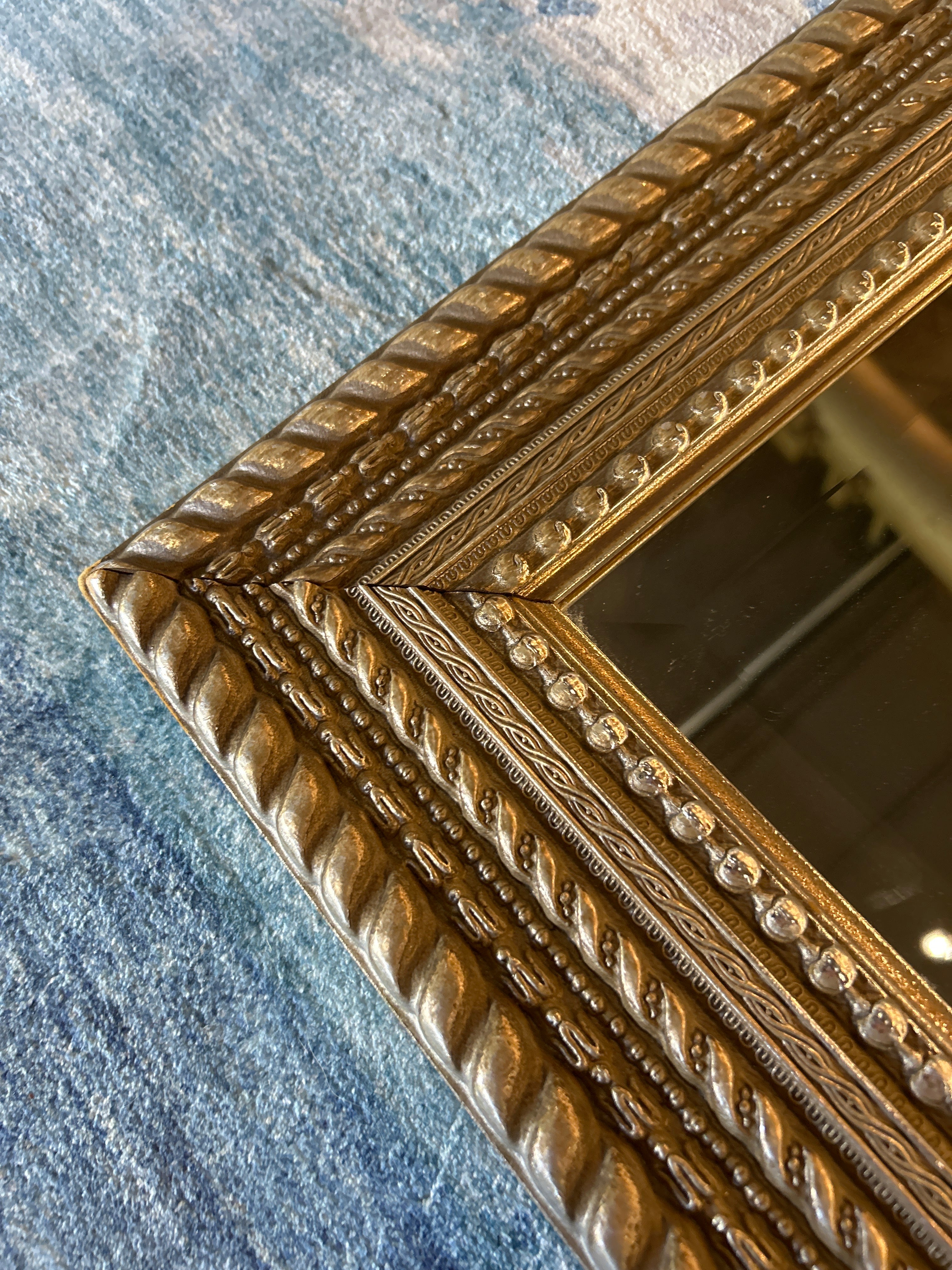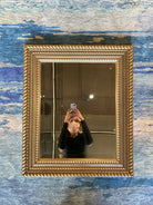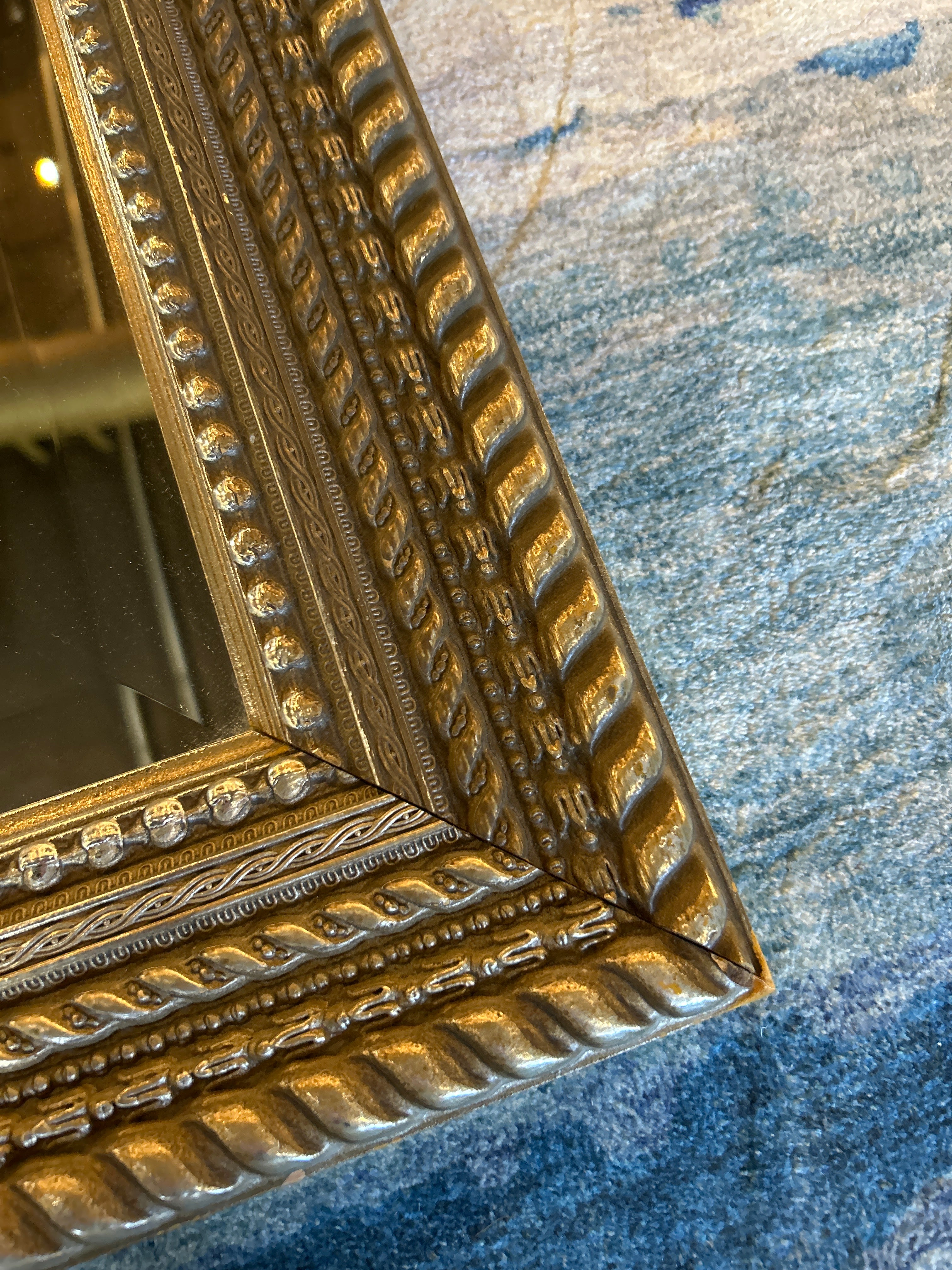 This elegant 22" x 27" vintage mirror features a brushed silver finish with a beveled edge, enhancing its sophisticated appeal. The ornate frame is detailed with a distinctive rope pattern, combining classic craftsmanship with timeless style. Perfect for adding refined character and depth to any room.