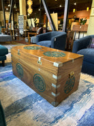 This exquisite trunk features inlaid brass decor on all corners, demonstrating impeccable craftsmanship. It is free from scratches, stains, or damage, ensuring its premium quality. The clear finish enhances the natural beauty of the muted teak color, making it a stunning addition to any home dΓ©cor.