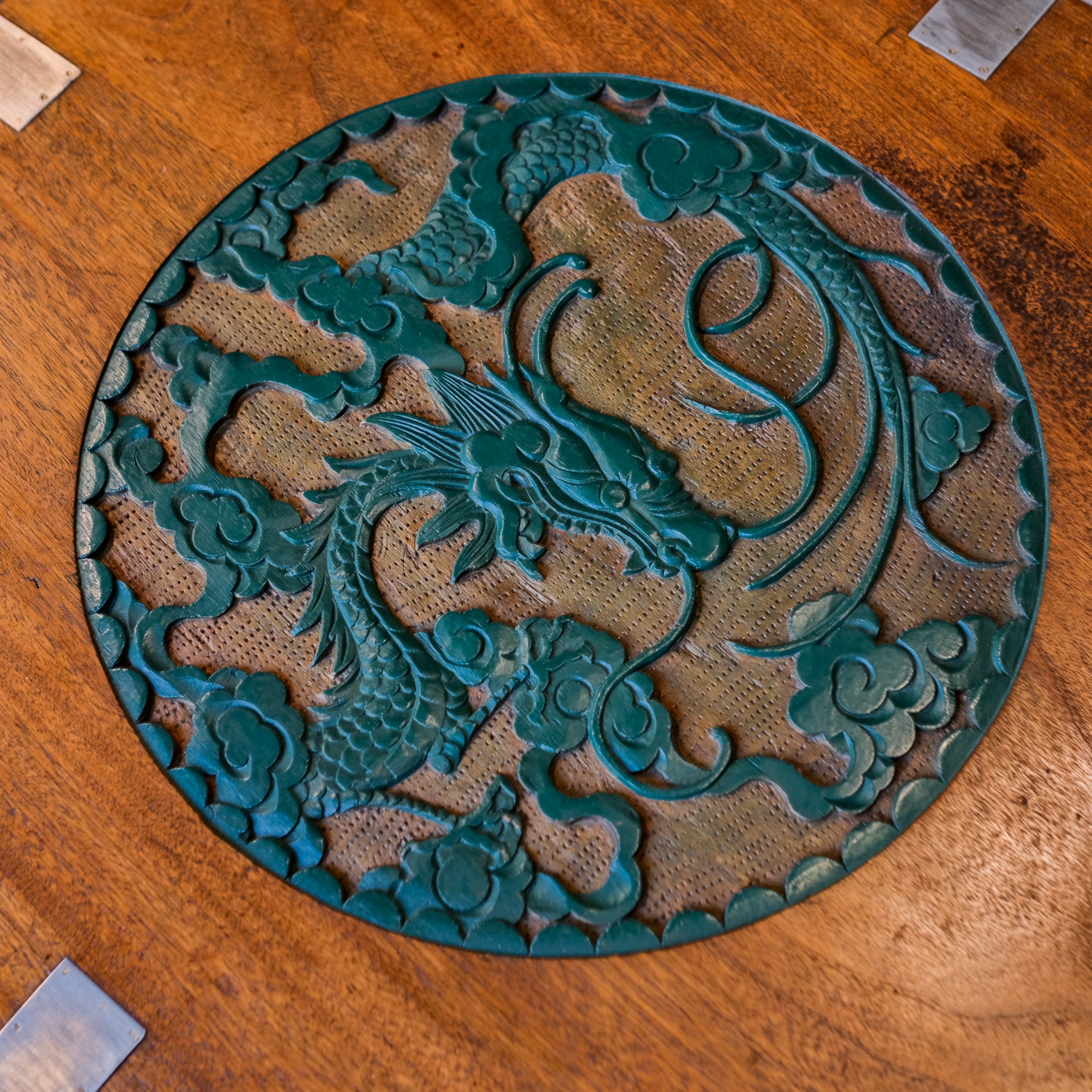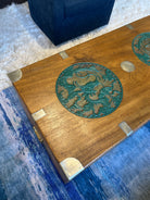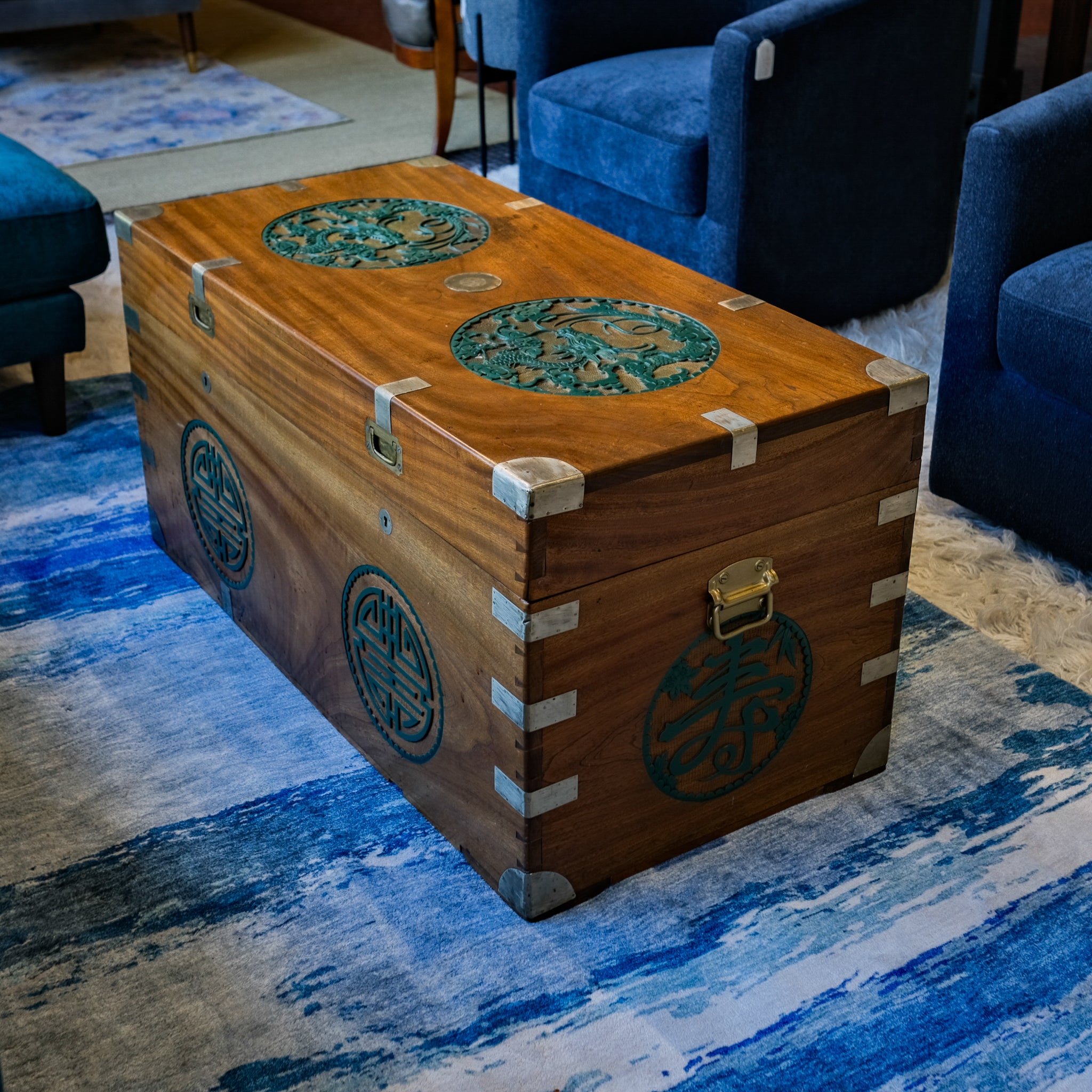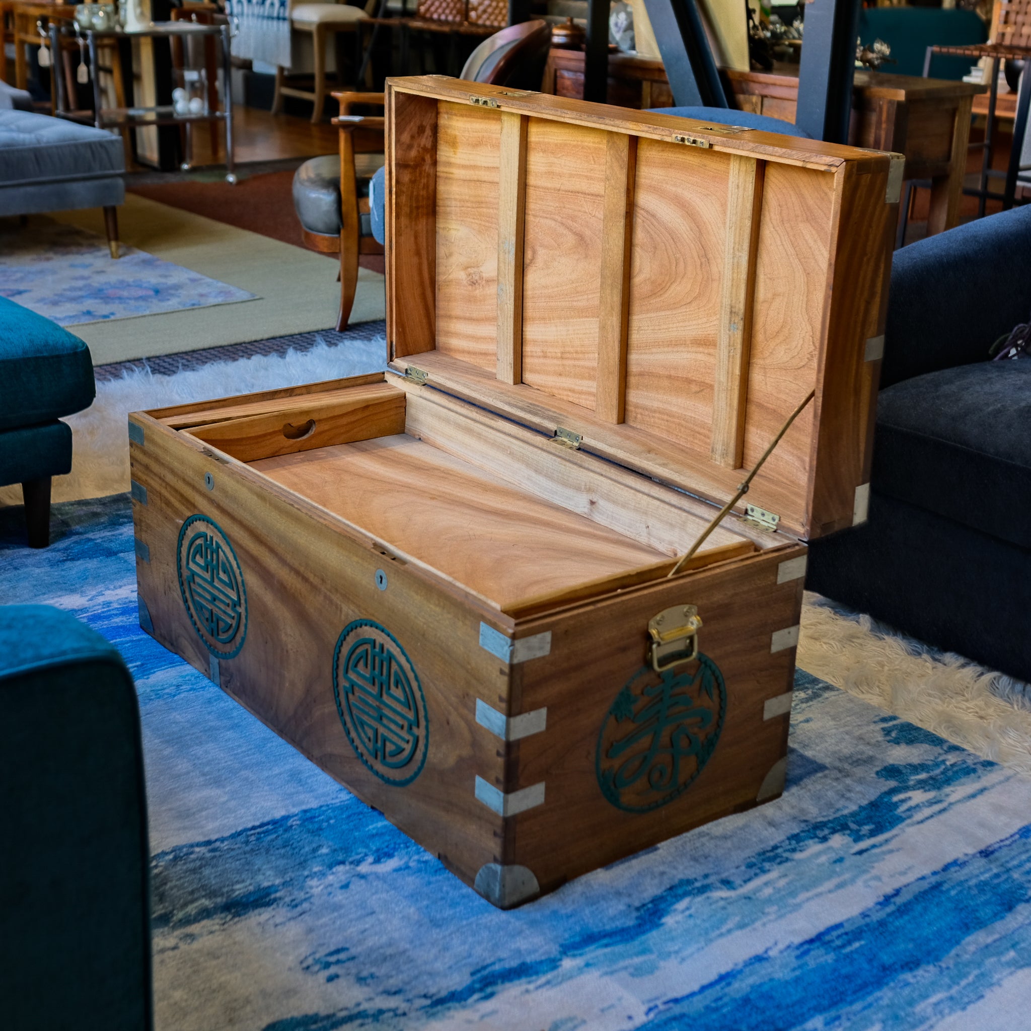 Experience the charm and history of the open seas with our Chinese Camphor Wood Sailor's Sea Chest. Made of durable camphor wood, this 41" L x 20" W x 20" H trunk is beautifully accented with jade and brass inlays. Perfect for storing your treasures and adding a touch of exotic elegance to any space.Β Teak Trunk