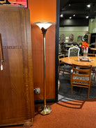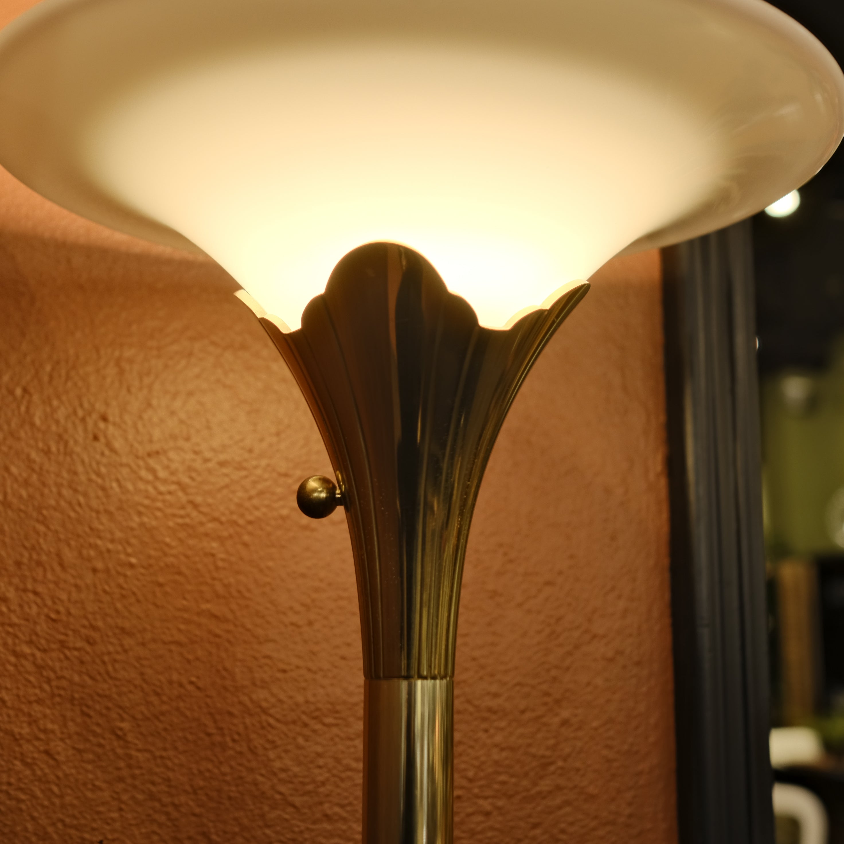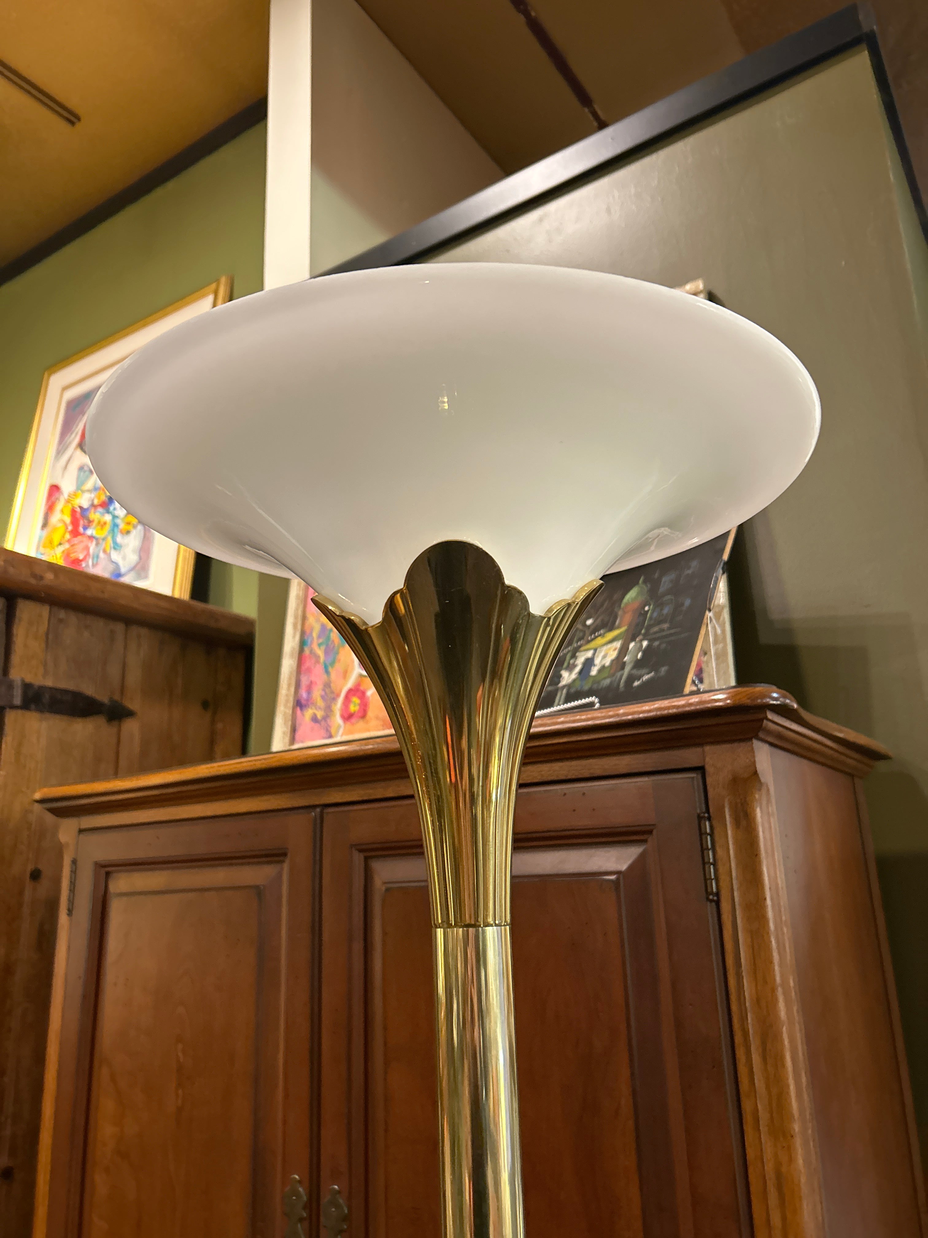 Solid Brass Tulip Torchiere Floor Lamp. The sturdy brass base gives it a timeless, high-quality feel, while the tulip-shaped glass shade softens the light just right; perfect for cozy corners, reading nooks, or anywhere you want to add a bit of style.