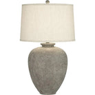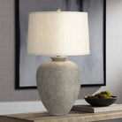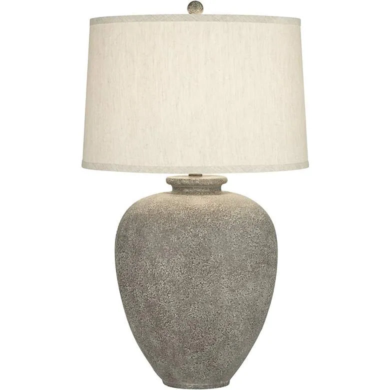 Elegant tapering creates a chic silhouette for this transitional table lamp. Its gray stone finish pairs with a drum shade to offer a modern palette in a living area or bedroom. A round finial is the perfect finishing touch for an elegant but earthy design.