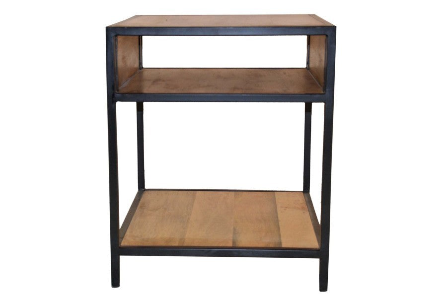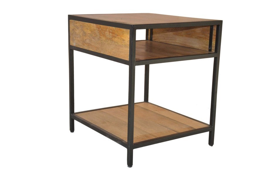 This has a clean, industrial feel. Made from richly grained solid mango wood and supported by a black metal frame, it has sleek architectural lines. With an open drawer and lower shelf it has plenty of functional storage space!