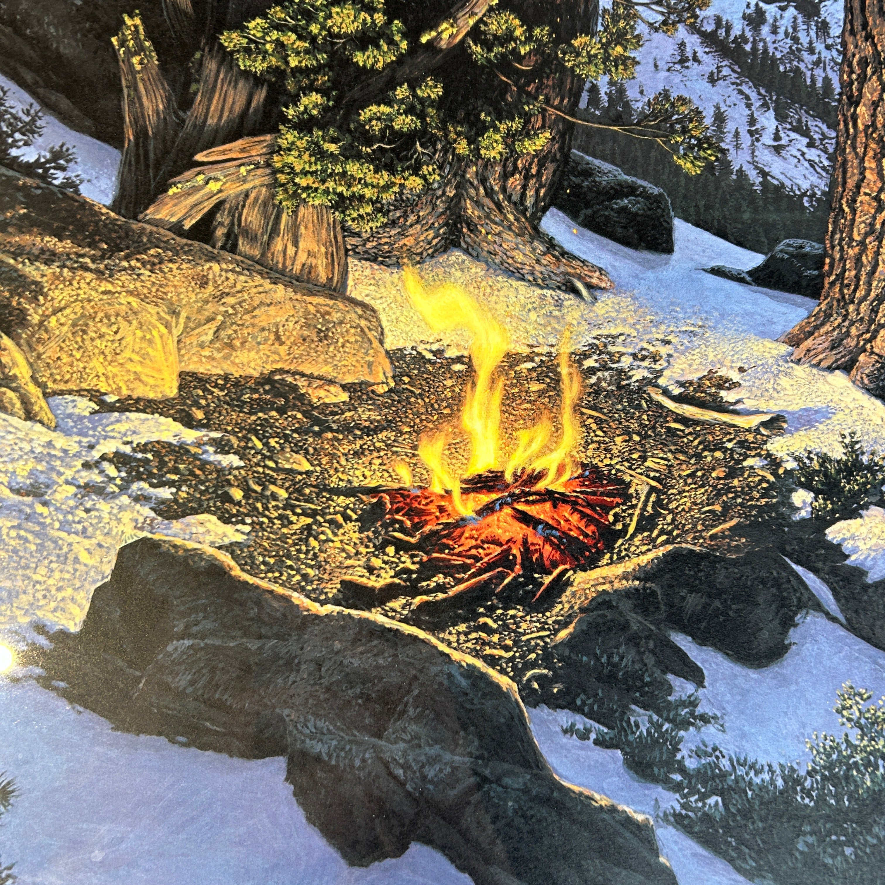 I made a conscious decision to make this image different from the other two campfire prints, A Mountain Campfire and Embers at Dawn. It’s not the same size. The season is different. You’re not looking at it in the same way. I’ve placed this campfire in a larger landscape. My approach this time was to see the campfire’s place in the environment around it. It’s not like you’re sitting there warming your hands, as in the other two. You’re on the next ridge over, looking across the gap.