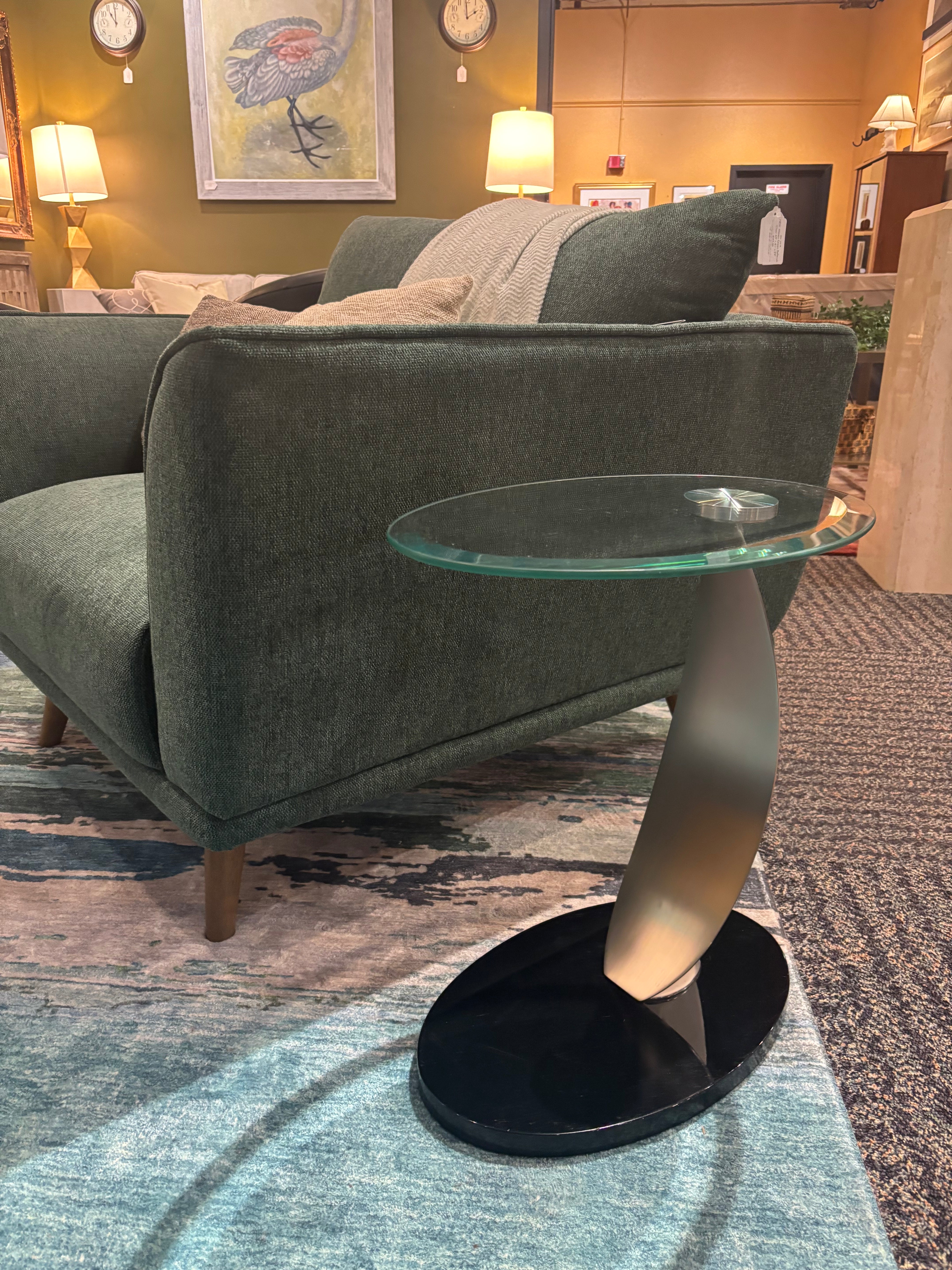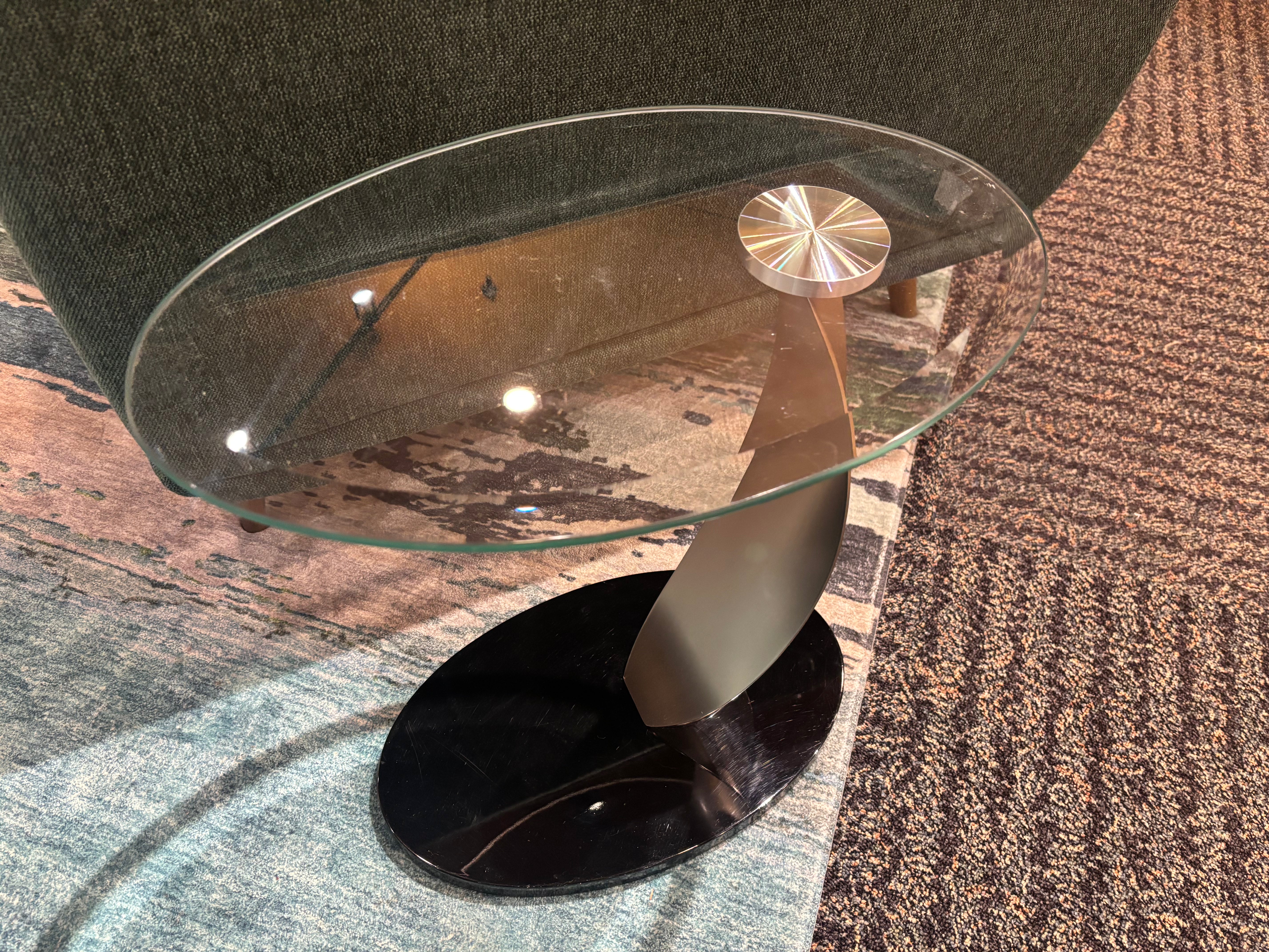 This elegant and highly functional accent table is perfect for supporting anything from a prized photo to a light snack or even a laptop computer. A dramatic Champagne-plated steel curve supports a cantilevered oval glass top. Heavy gauge steel base is available in any Elite durable powder-coat finish.