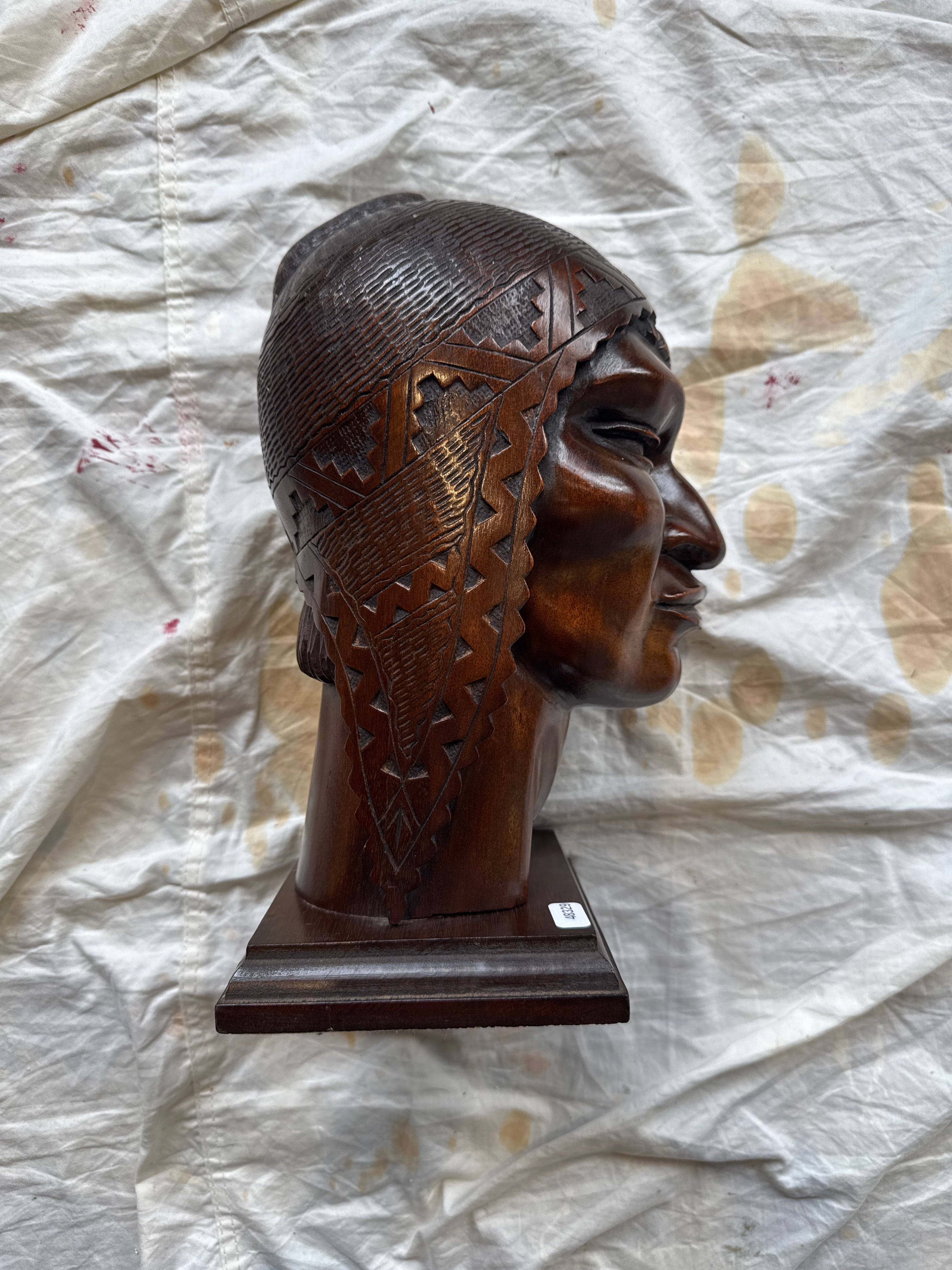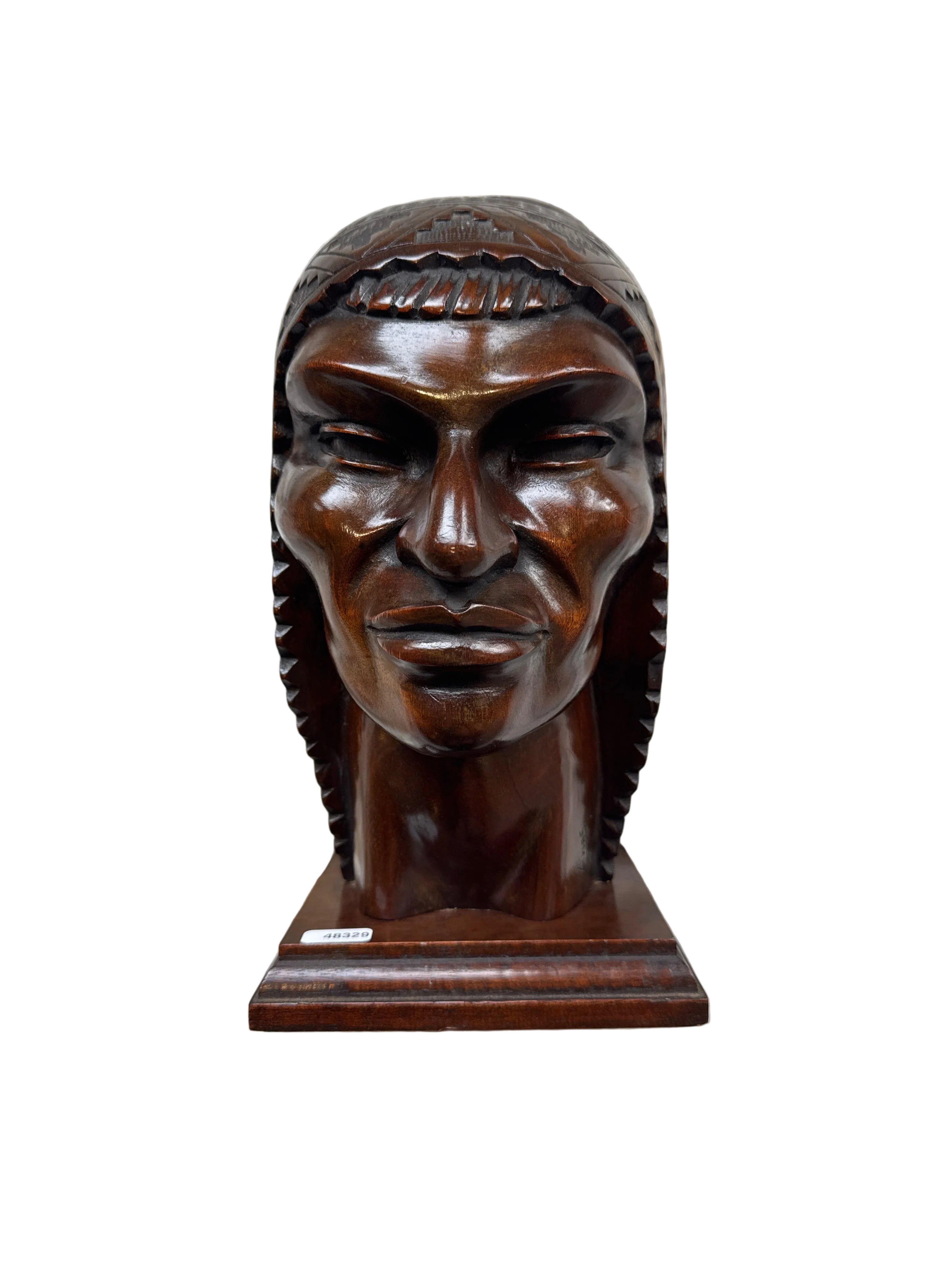 Exotic Indian Art Deco Sculpted Head in Wood by Arias 8" W x 12 " H