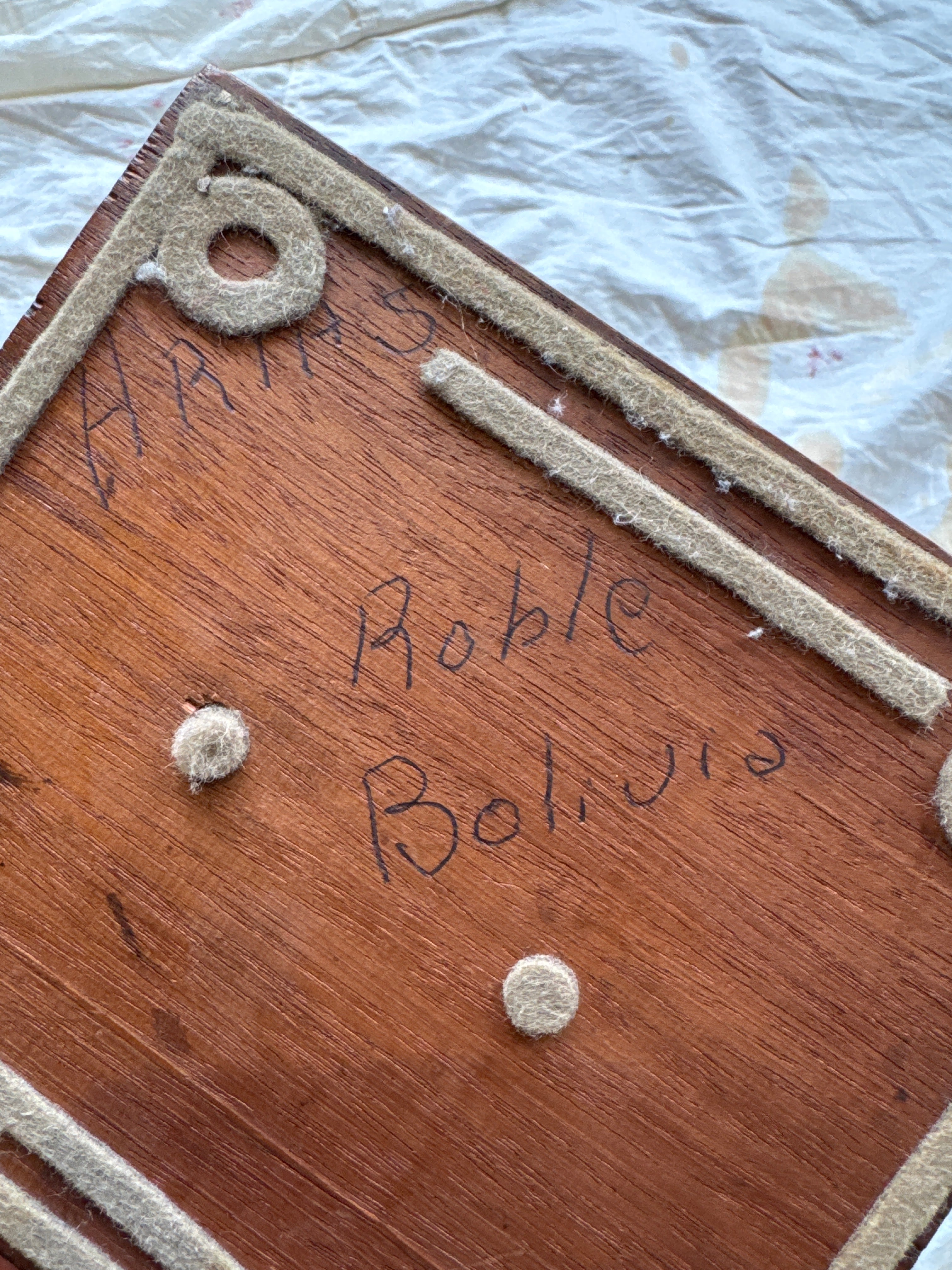 Original wood carved Peruvian Indian head in the Art Deco style. Lots of geometric and triangular details integrated within the head-dress. Interesting history imagines the face characteristics seem to be from a South American Indian origin. The piece somehow found its way to Israel where it was purchased on my behalf. The condition is excellent and the pose is very serious and intense. The artist Arias, Inca art in mahogany wood from this region.