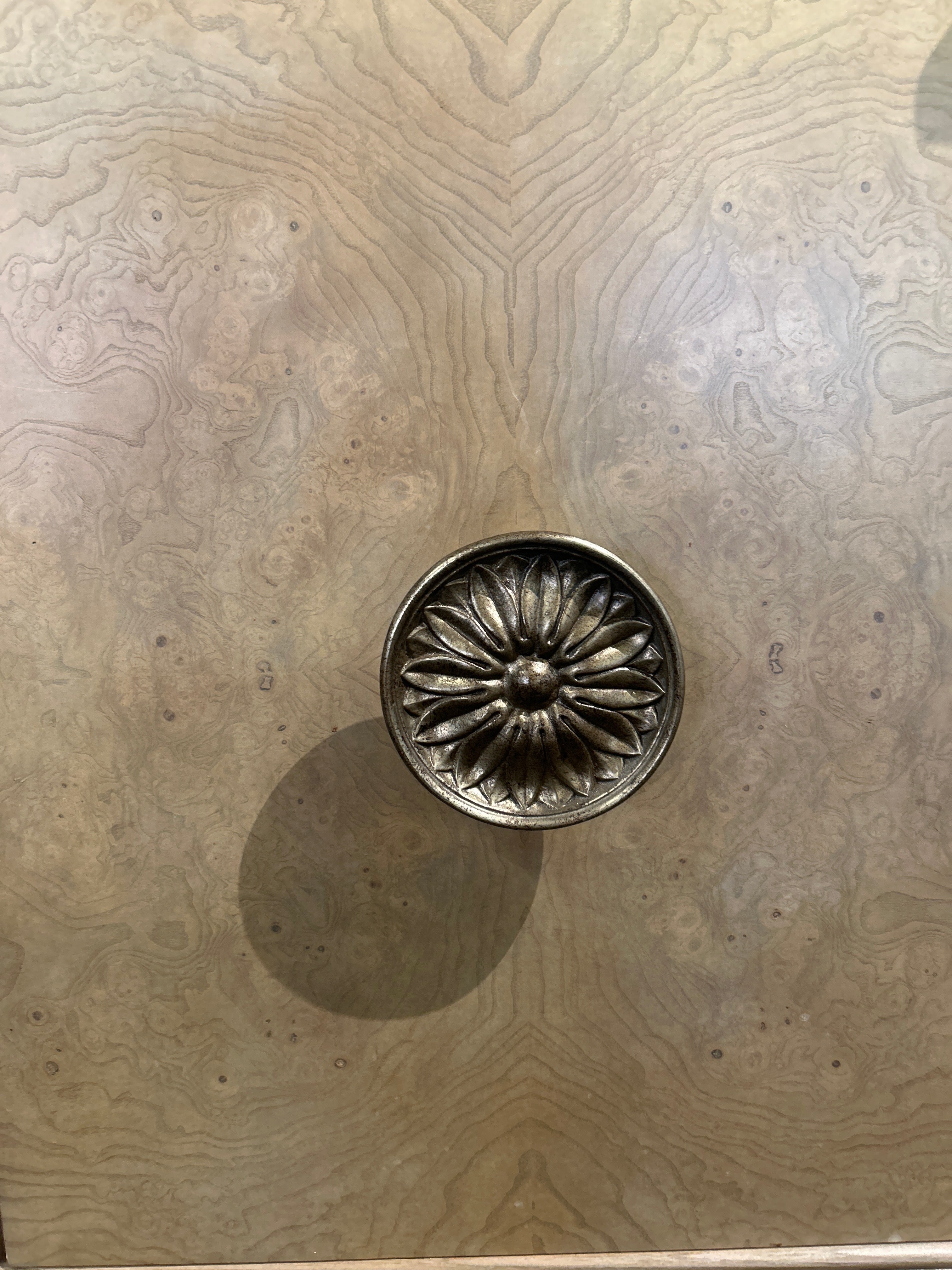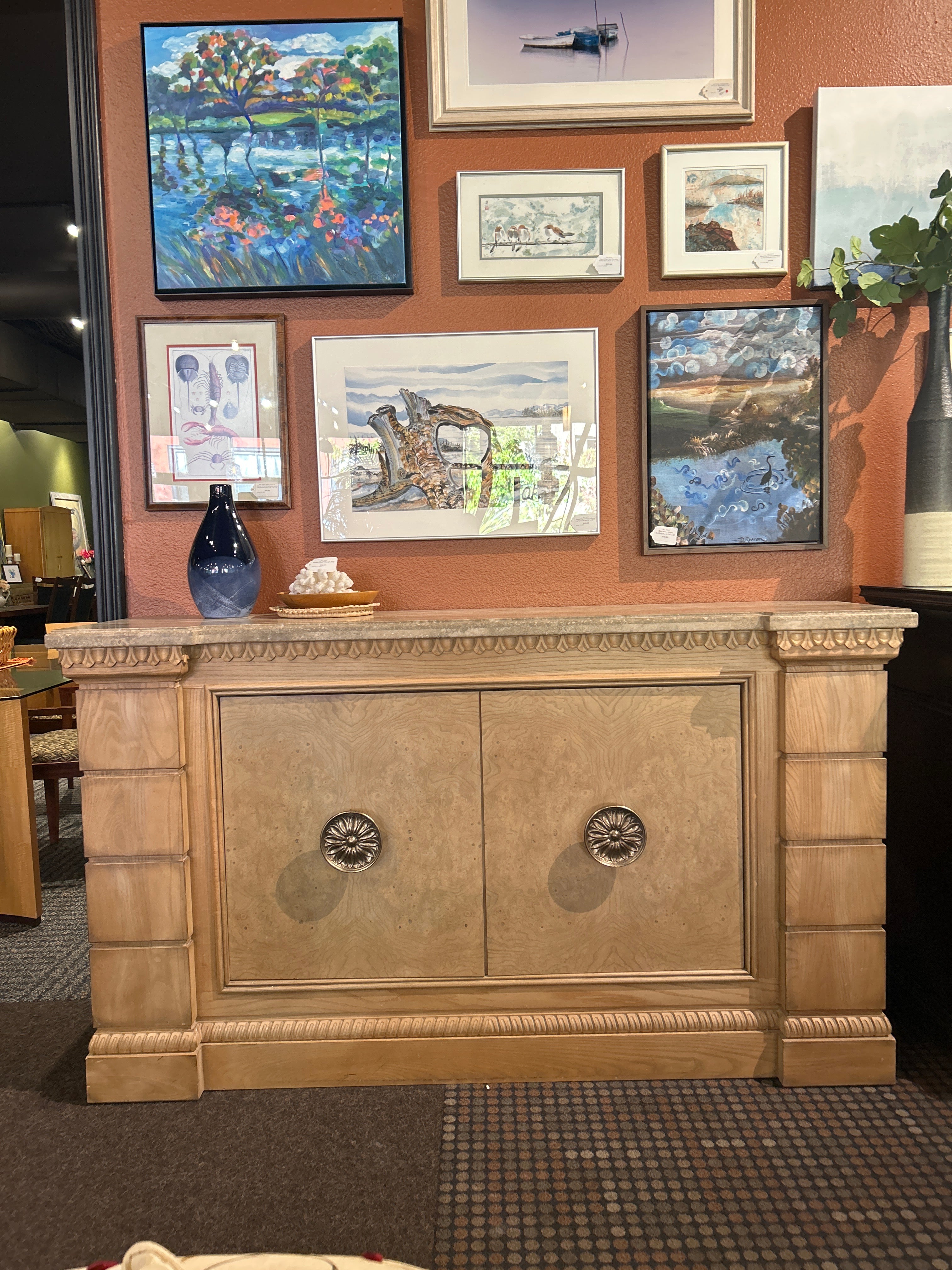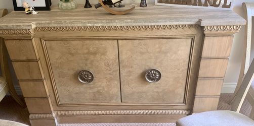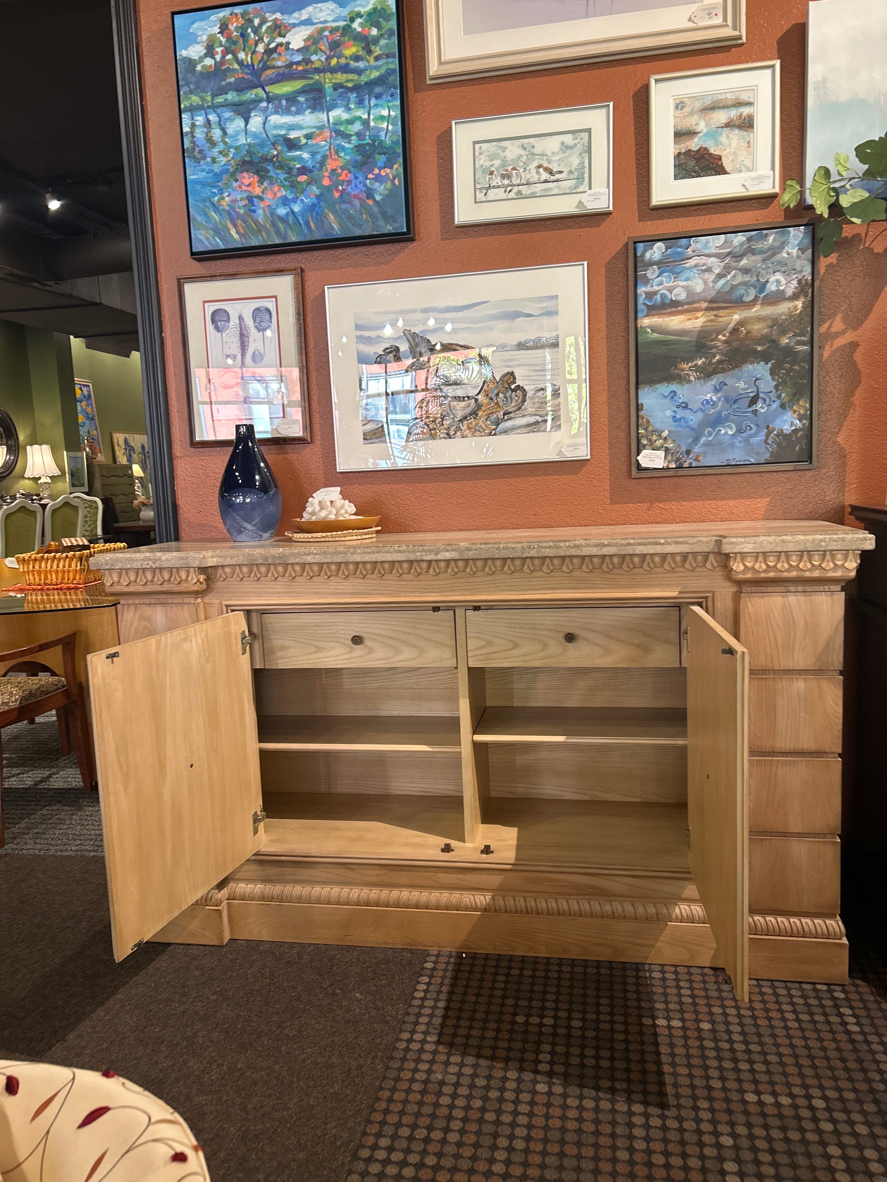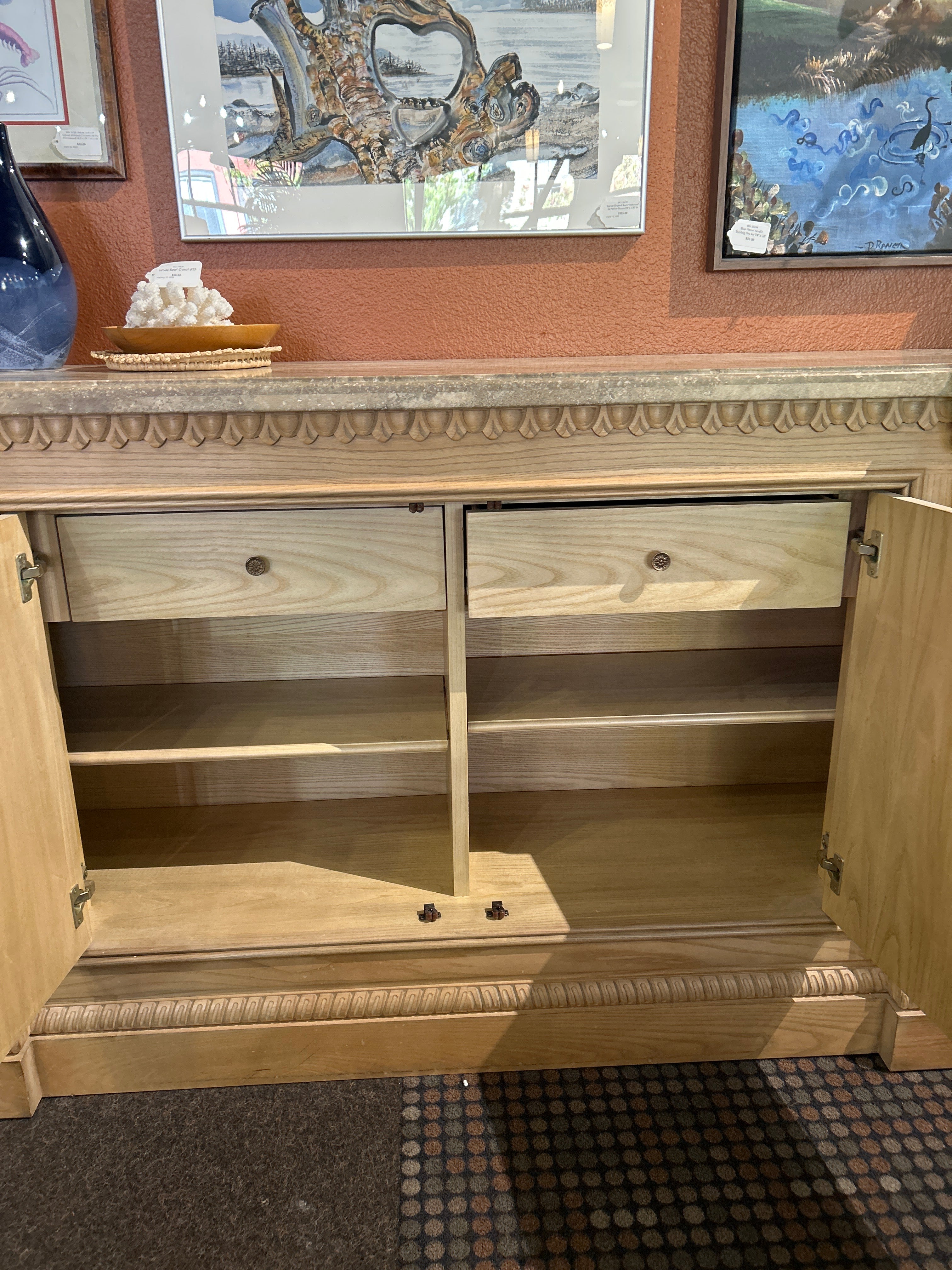 Drexel Heritage credenza in a light finish with stone top. Just gorgeous! There are two drawers and two shelves behind the doors in the center.