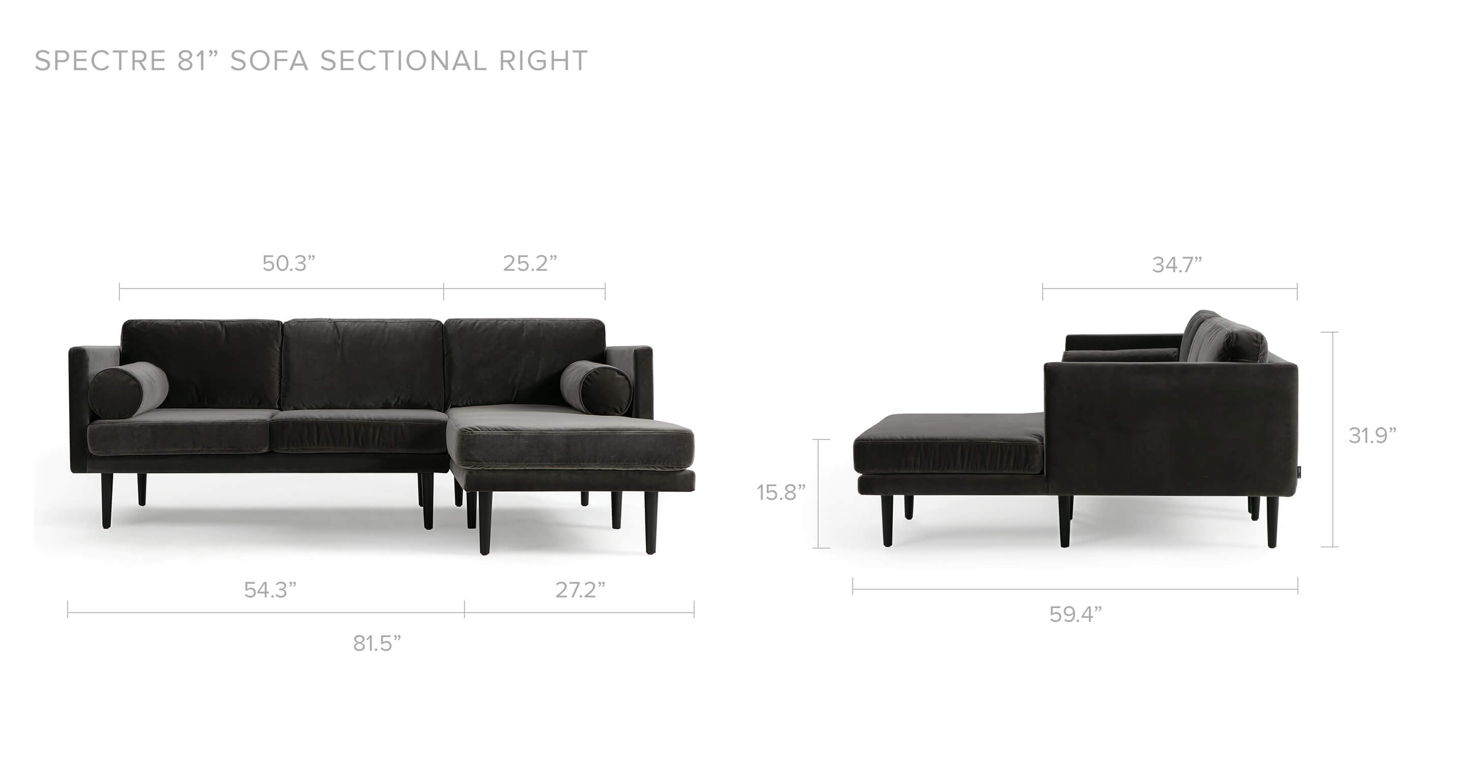 NEW Kardiel Spectre Obsidian Velvet Fabric Sofa Sectional Right 81.5" x 59.4" x 31.9"