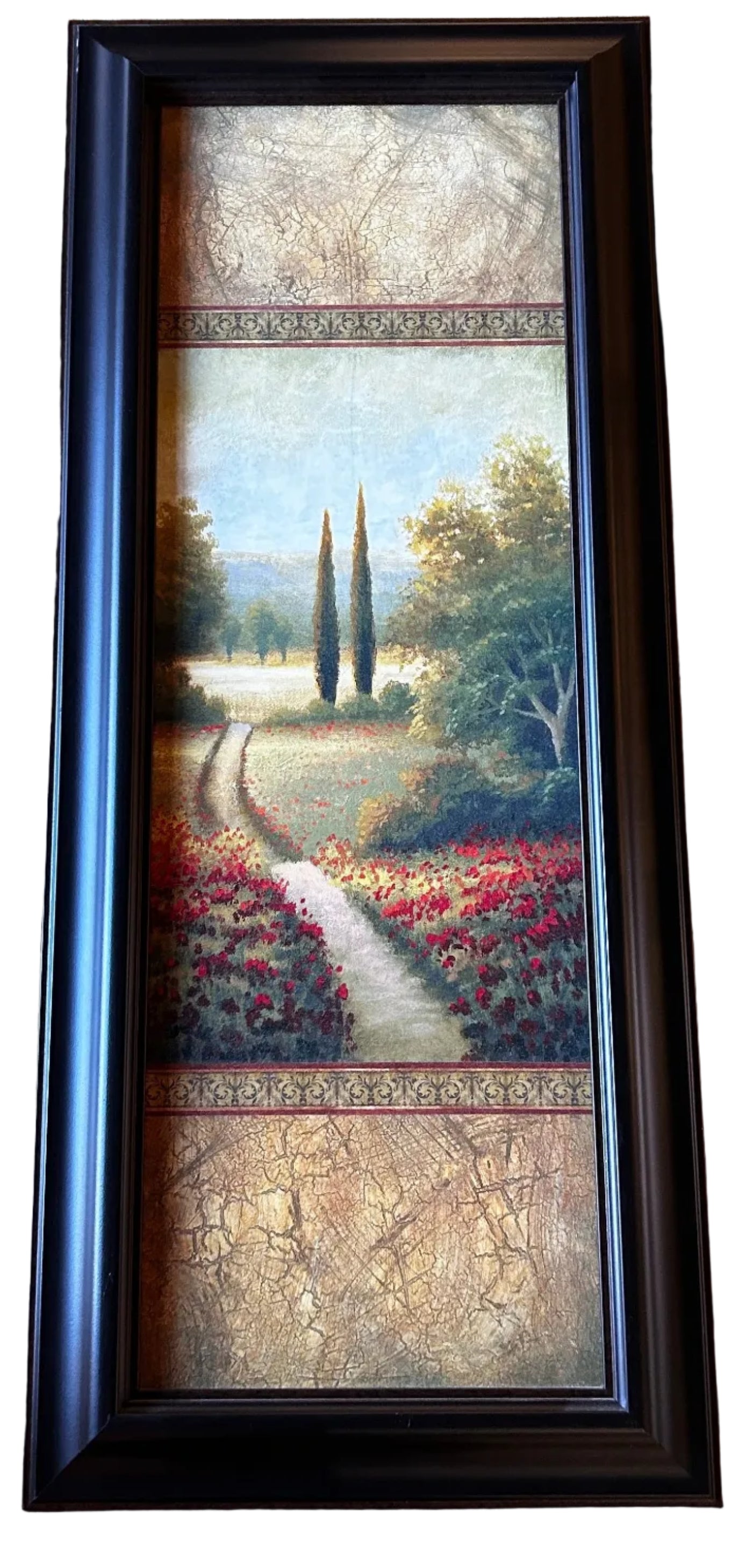 pathway through a field of red flowers, framed in a black decorative frame.