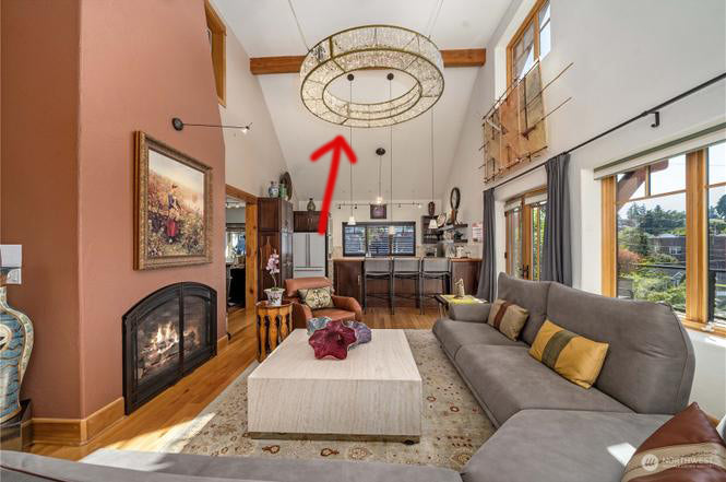 This is an extremely large (over 6 feet wide) ring-shaped chandelier with bright twinkle lights. This would work well in a great room or a commercial space. Right now it's wired with a long cord to plug into an outlet.