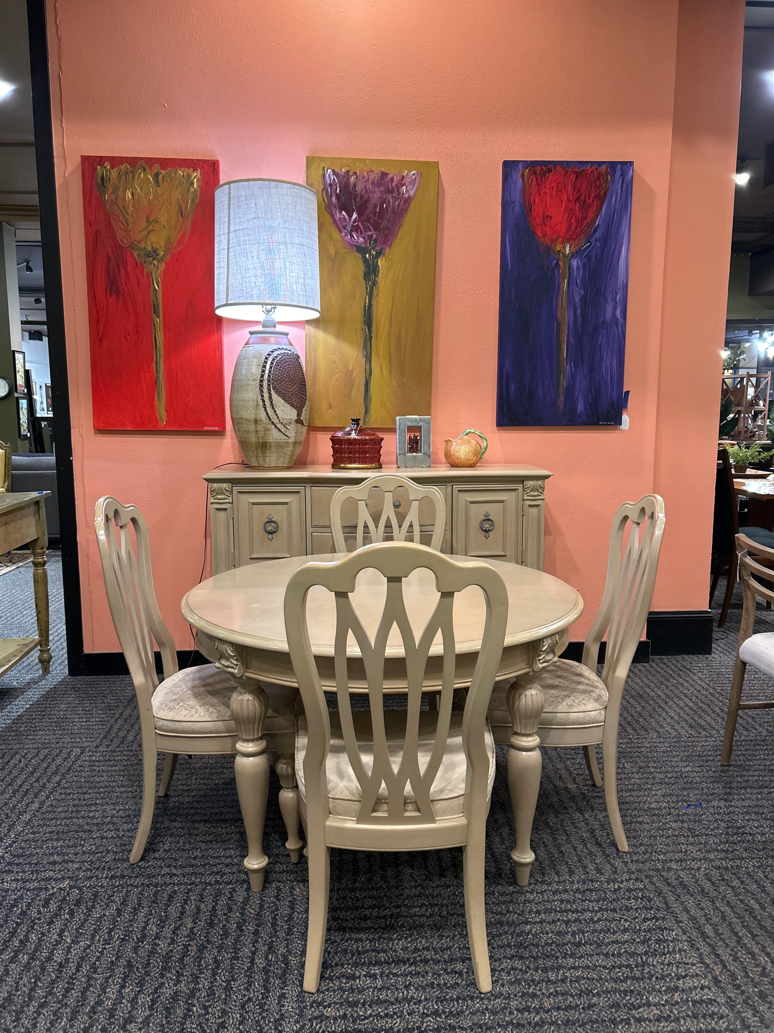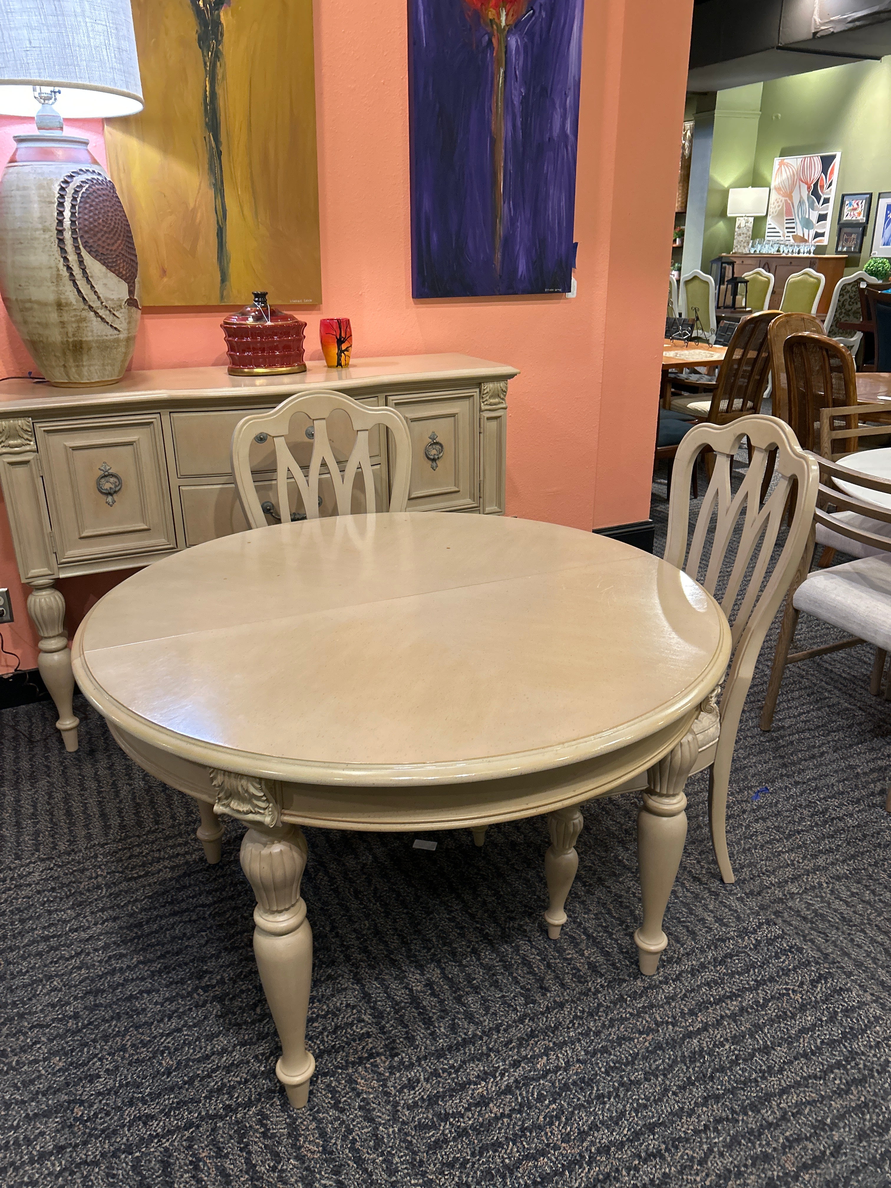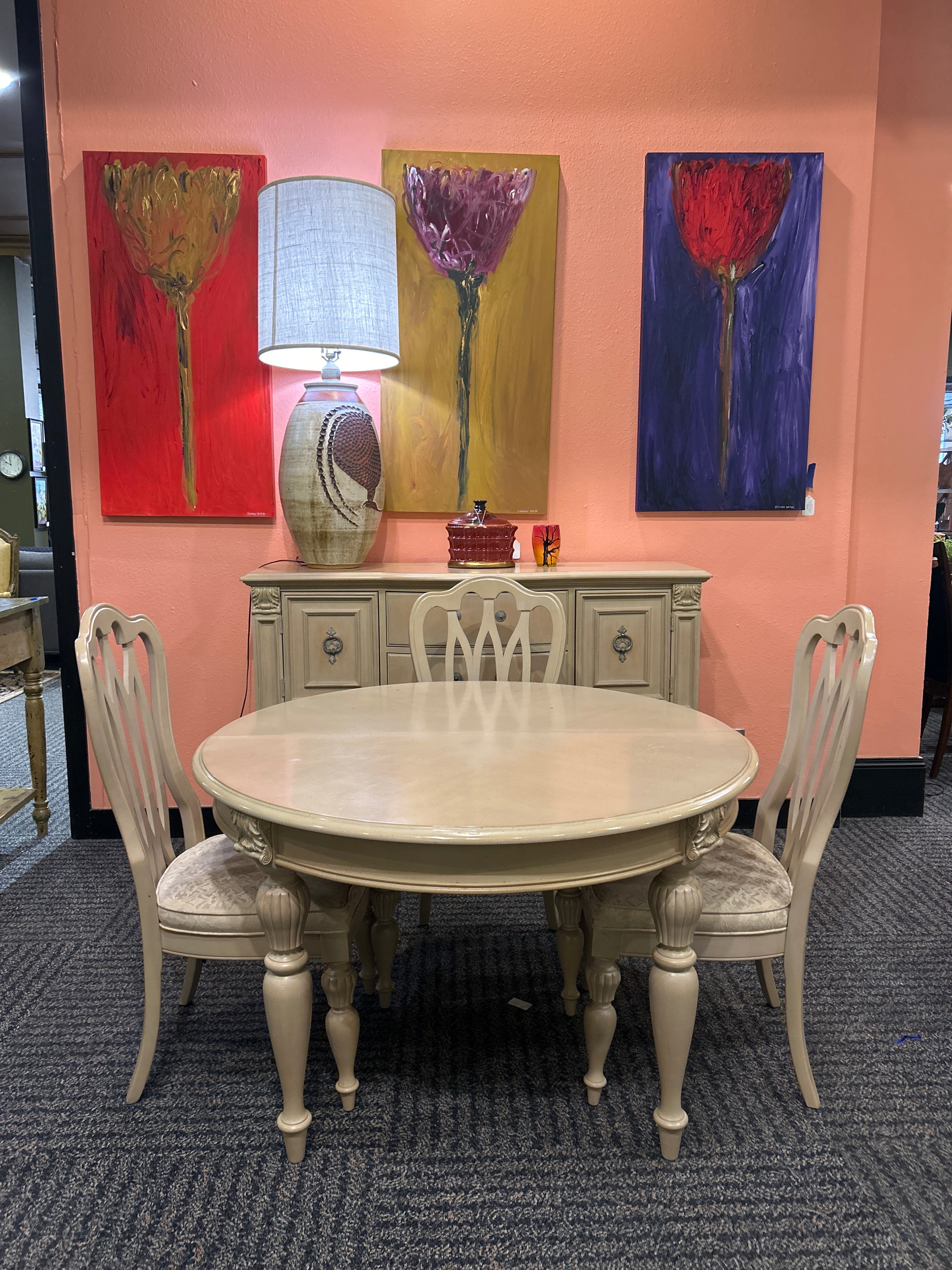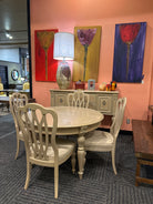 This elegant 4' Dining Set comes with 2 additional 2' leaves, offering flexibility for various dining occasions. Alongside the dining set, the matching sideboard provides ample storage and an impressive aesthetic.