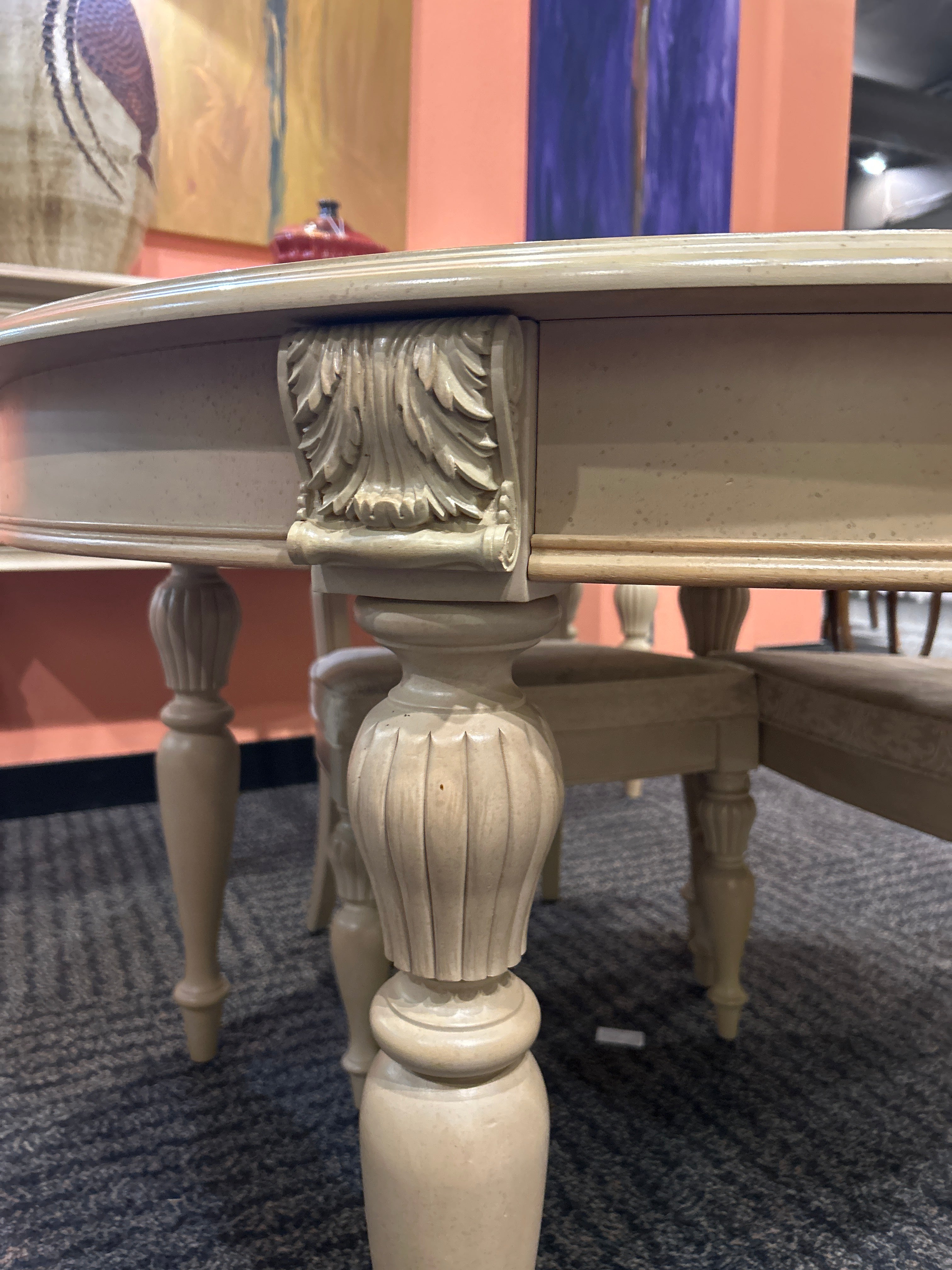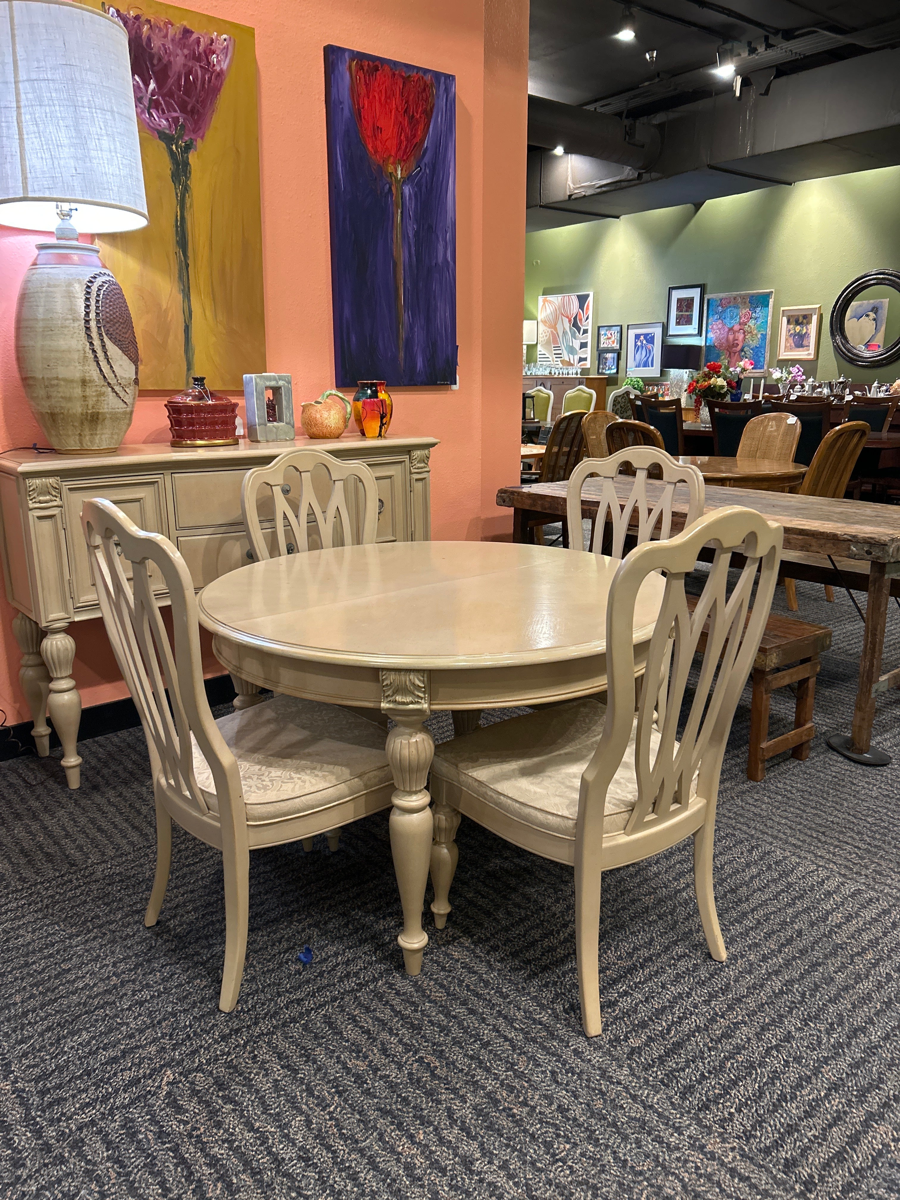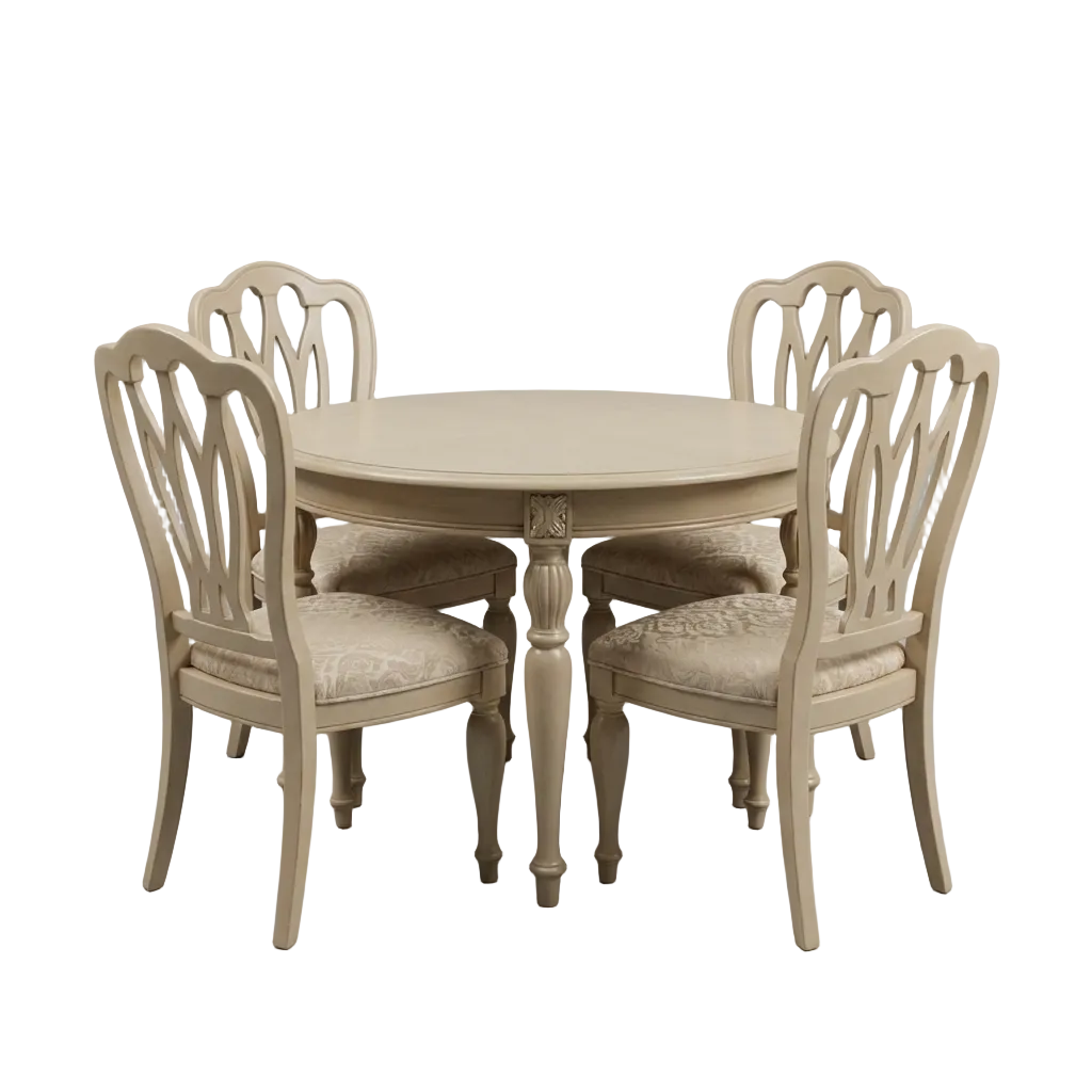 This elegant 4' Dining Set comes with 2 additional 2' leaves, offering flexibility for various dining occasions. Alongside the dining set, the matching sideboard provides ample storage and an impressive aesthetic.