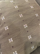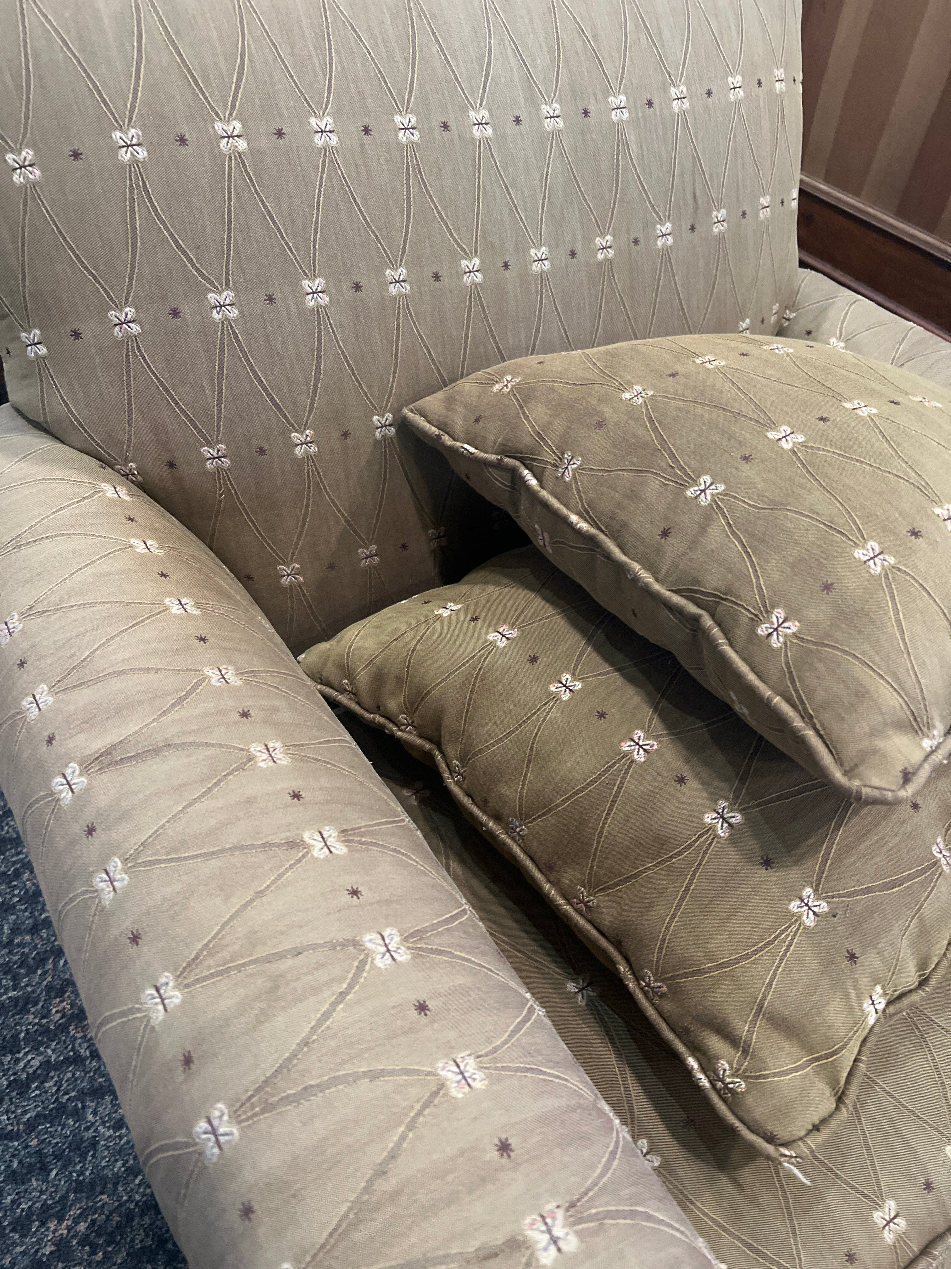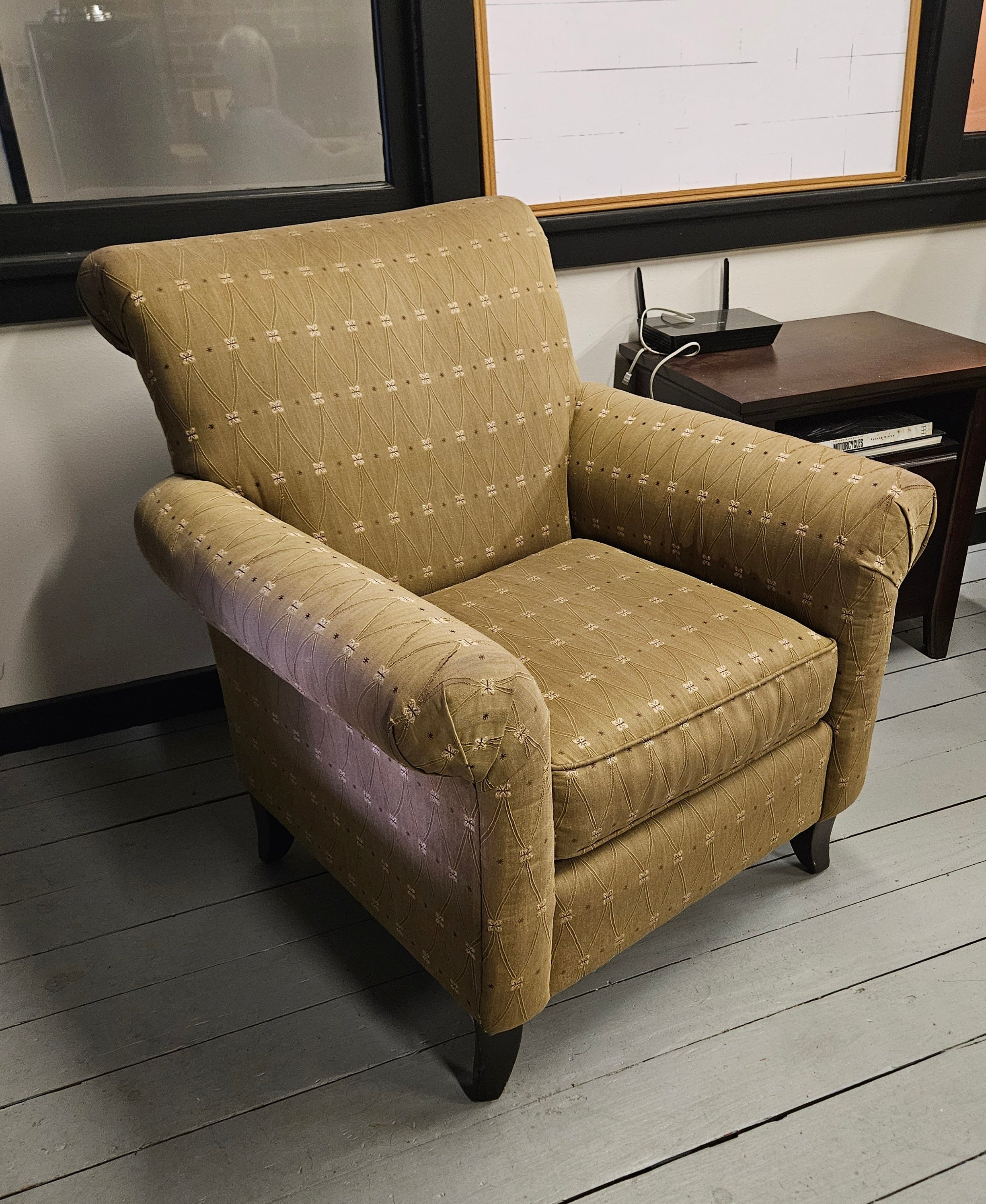 This upholstered wing back chair features a stunning light brown color, beautifully adorned with a geometric and abstract soft floral pattern. Designed for both comfort and style, it has rolled arms and a supportive back, complemented by elegant wood legs. It comes with two plush pillows, making it a perfect addition to any living space. This chair is in very good condition, perfect for adding a cozy touch to your home.