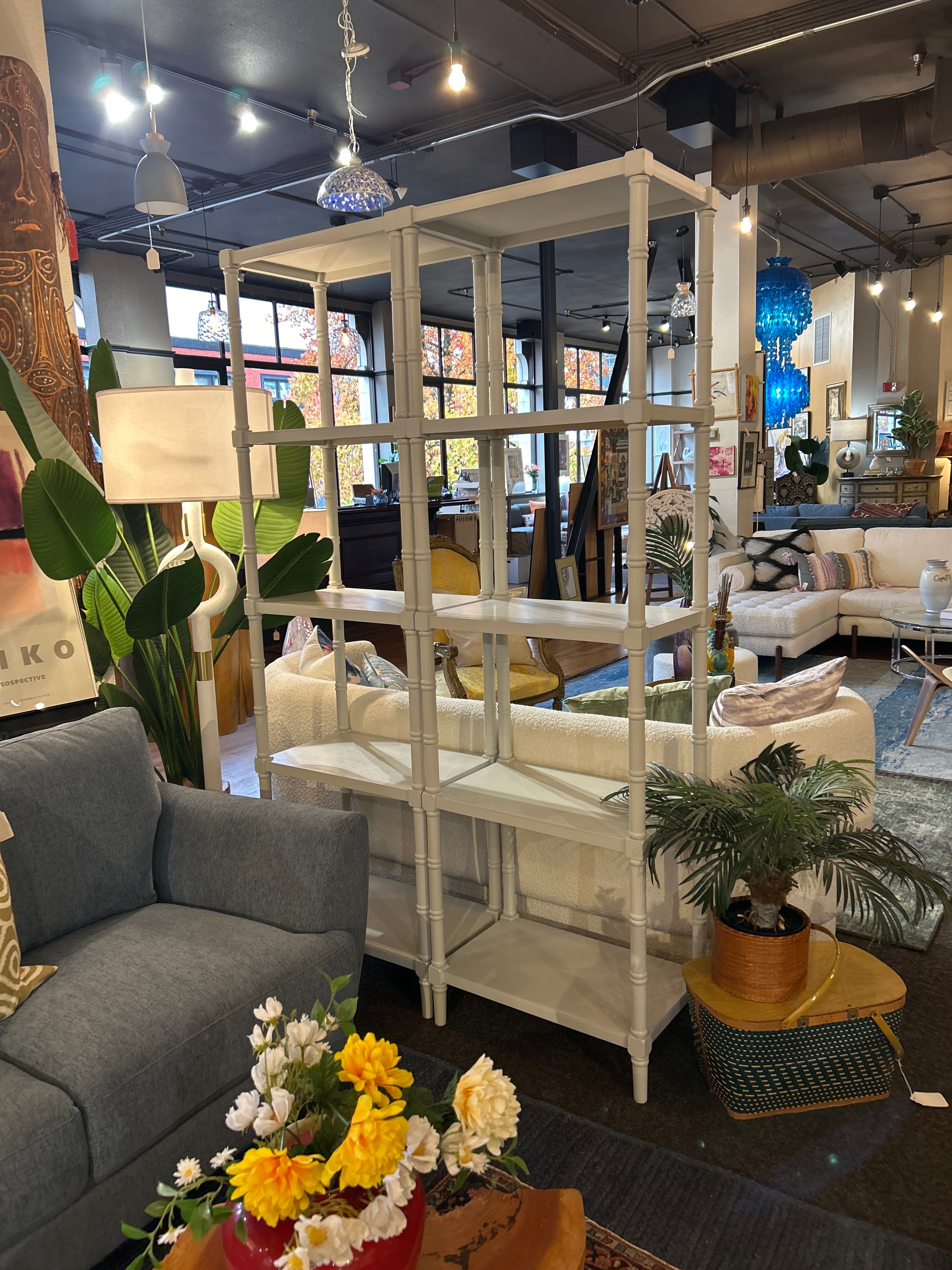 These stunning Regency faux bamboo curio shelves bring mid-century modern charm to any room.