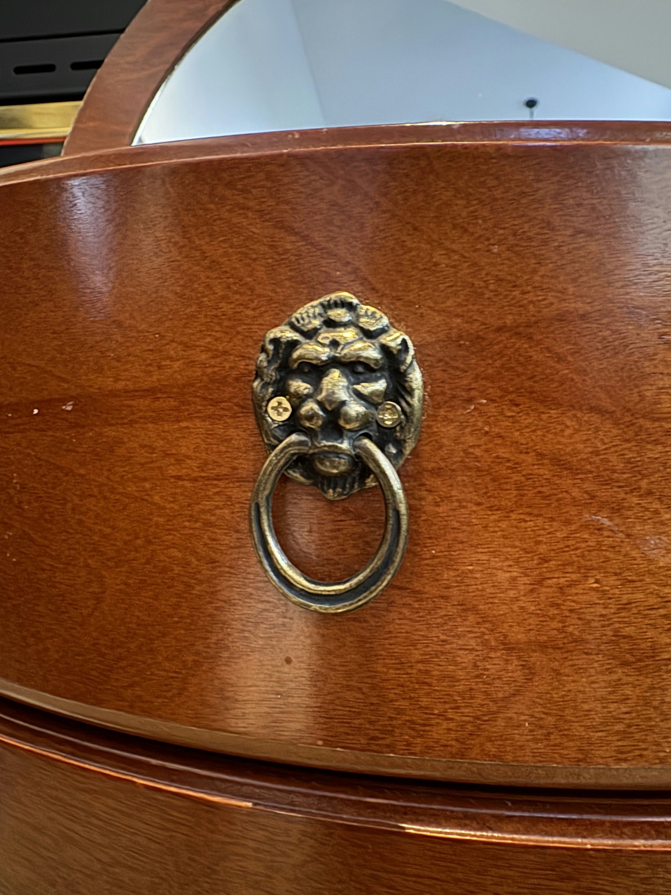 The top of the table elegantly opens to reveal a mirror, allowing it to function as a charming vanity. Crafted from solid mahogany, this piece is adorned with **lion heads brass knobs** and supported by **cabriole legs**, embodying classic French Louis XV style.