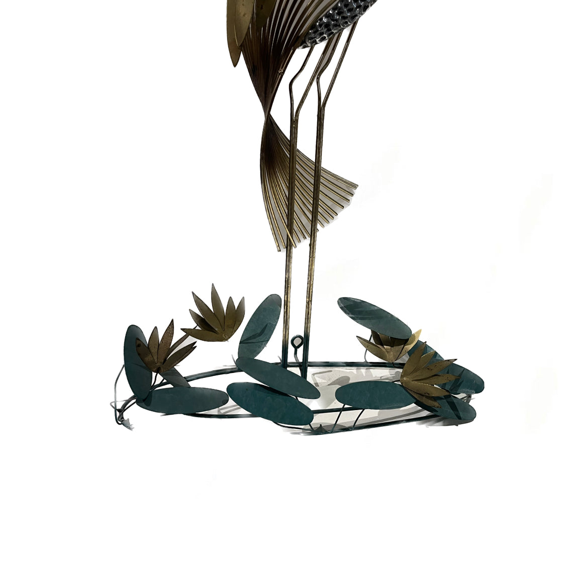 Original wall sculpture signed and dated 1988 by Curtis Jeré. Heron in silver and brass standing in lily pads with brass flowers.