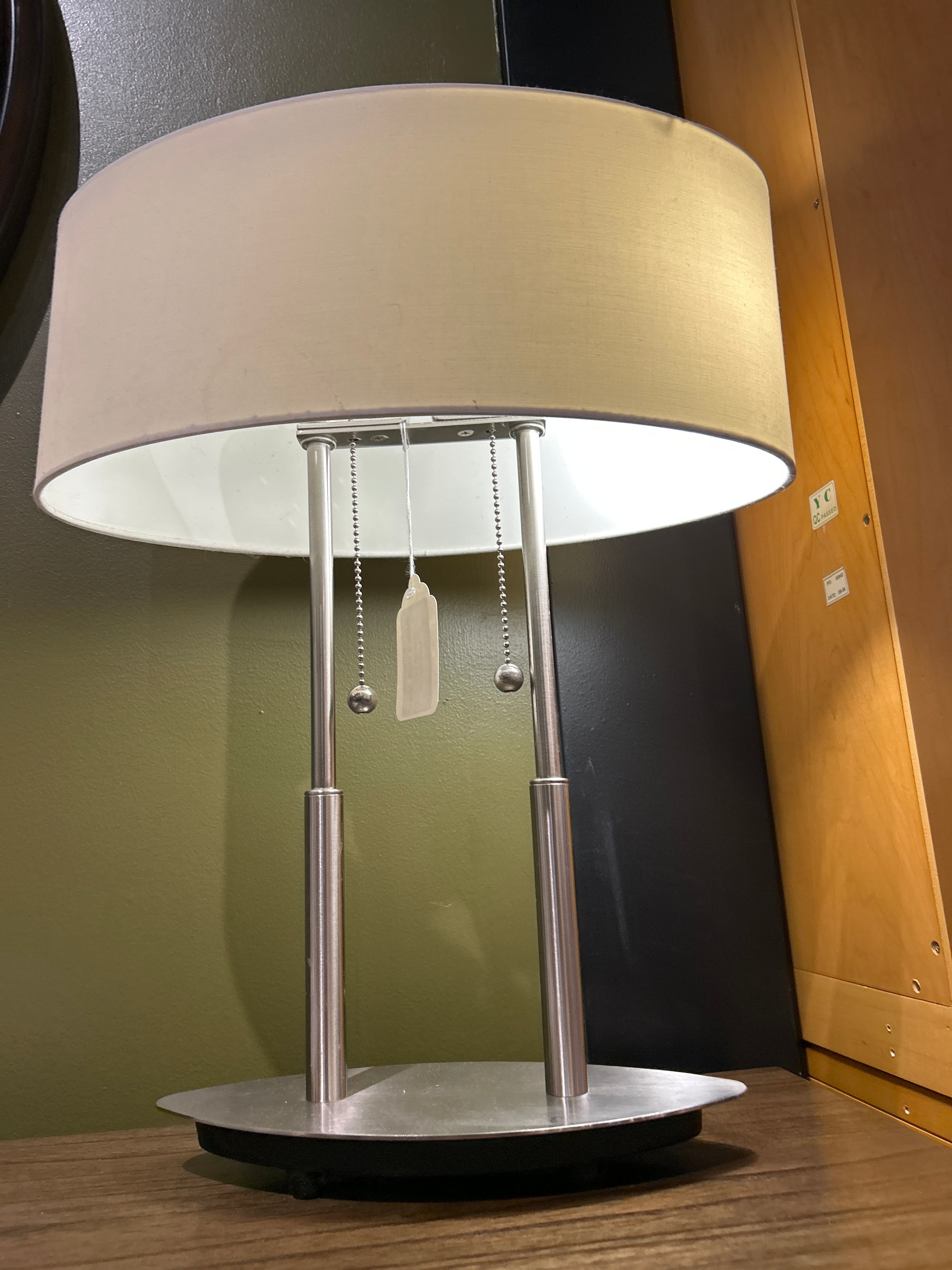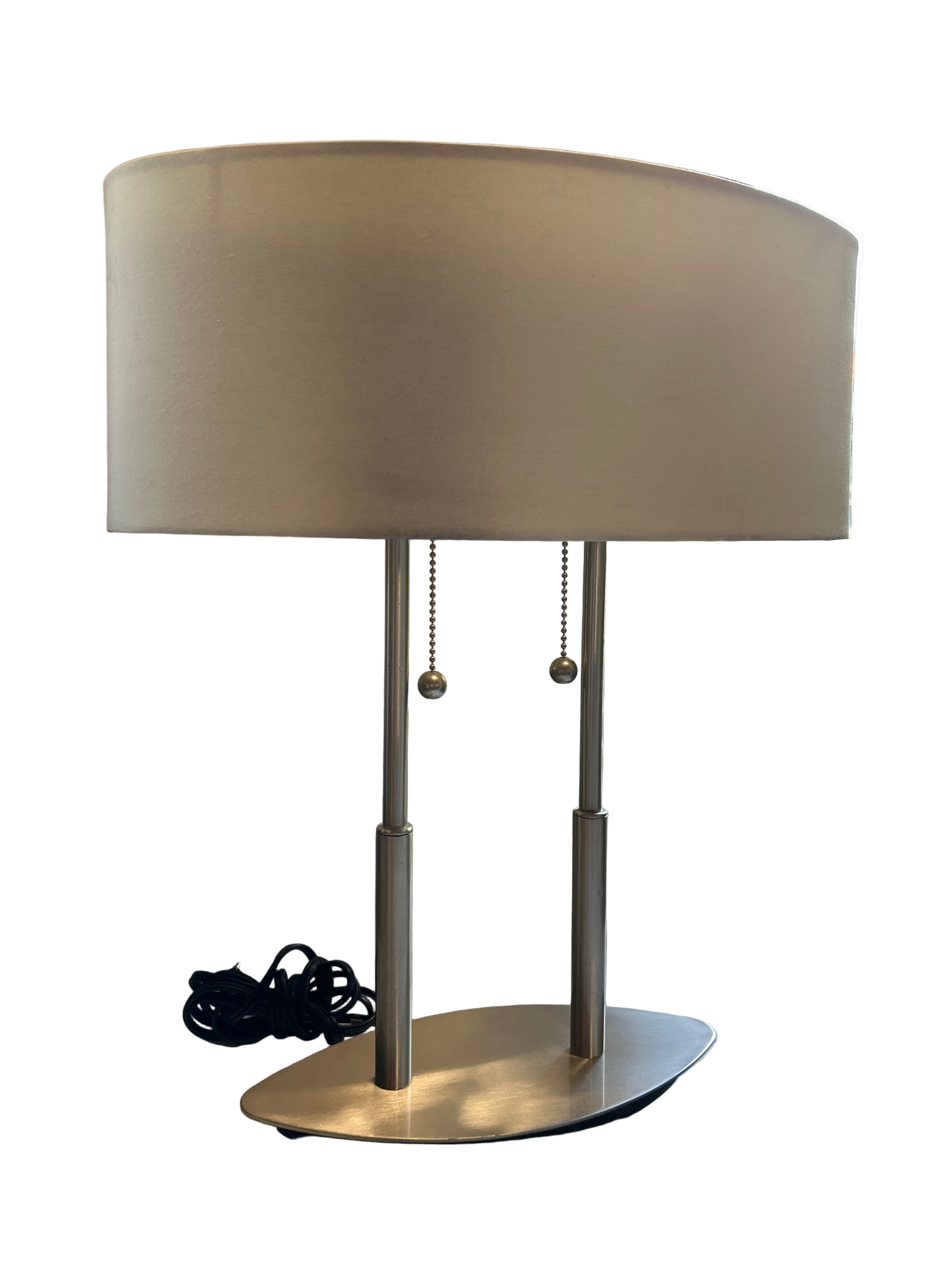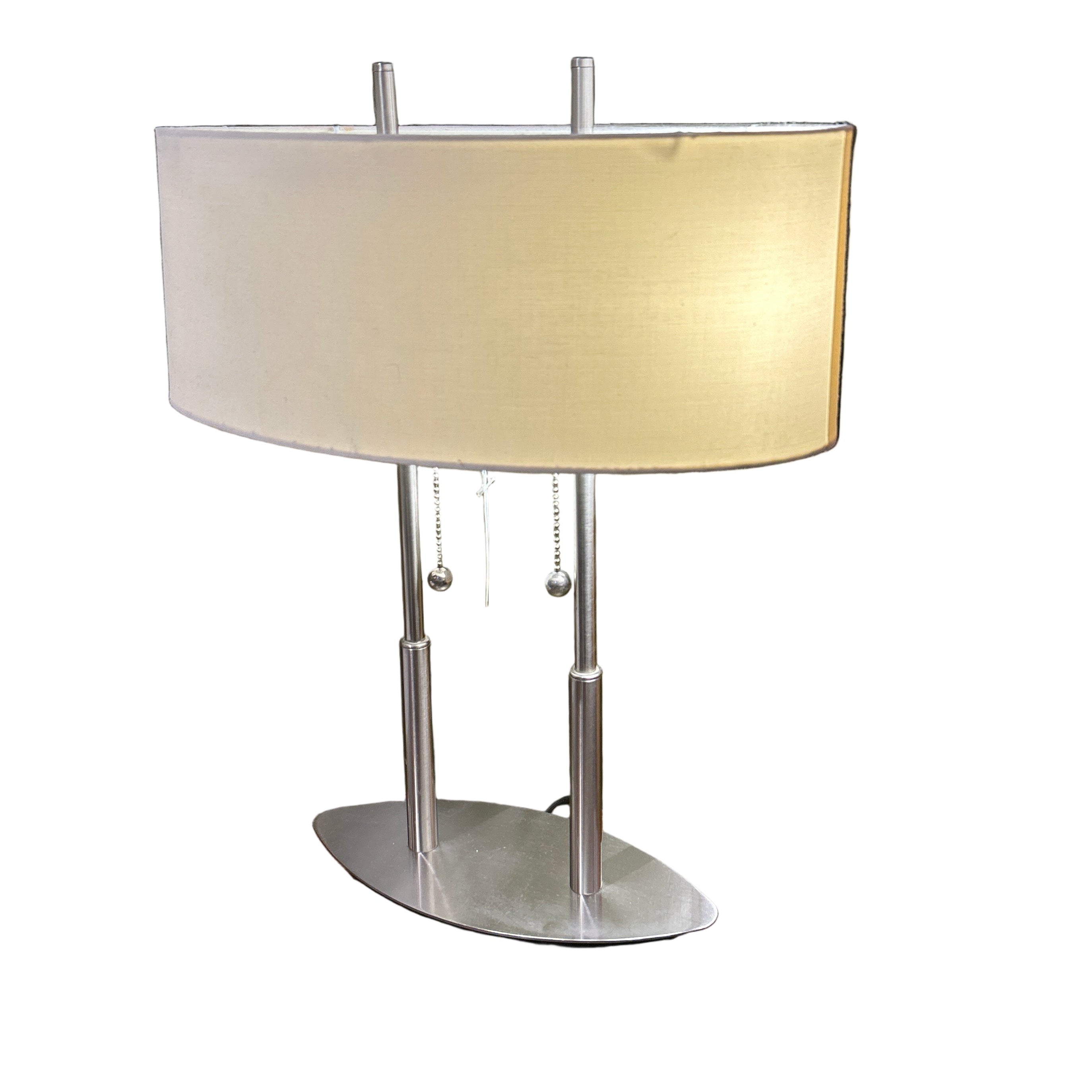 Elevate your space with this sleek and sophisticated table lamp featuring a polished silver dual-pole base and a soft beige oval fabric shade. This contemporary piece blends minimalist design with subtle curves—two slender metal poles rise from an elliptical silver base, supporting an elongated oval shade that casts a warm, ambient glow. Ideal for bedrooms, side tables, console tables or office suites, this lamp offers both style and function. The clean silver finish fits seamlessly in modern, transitional or mid-century inspired interiors, while the beige shade softens the metallic look with a cozy, inviting light.
