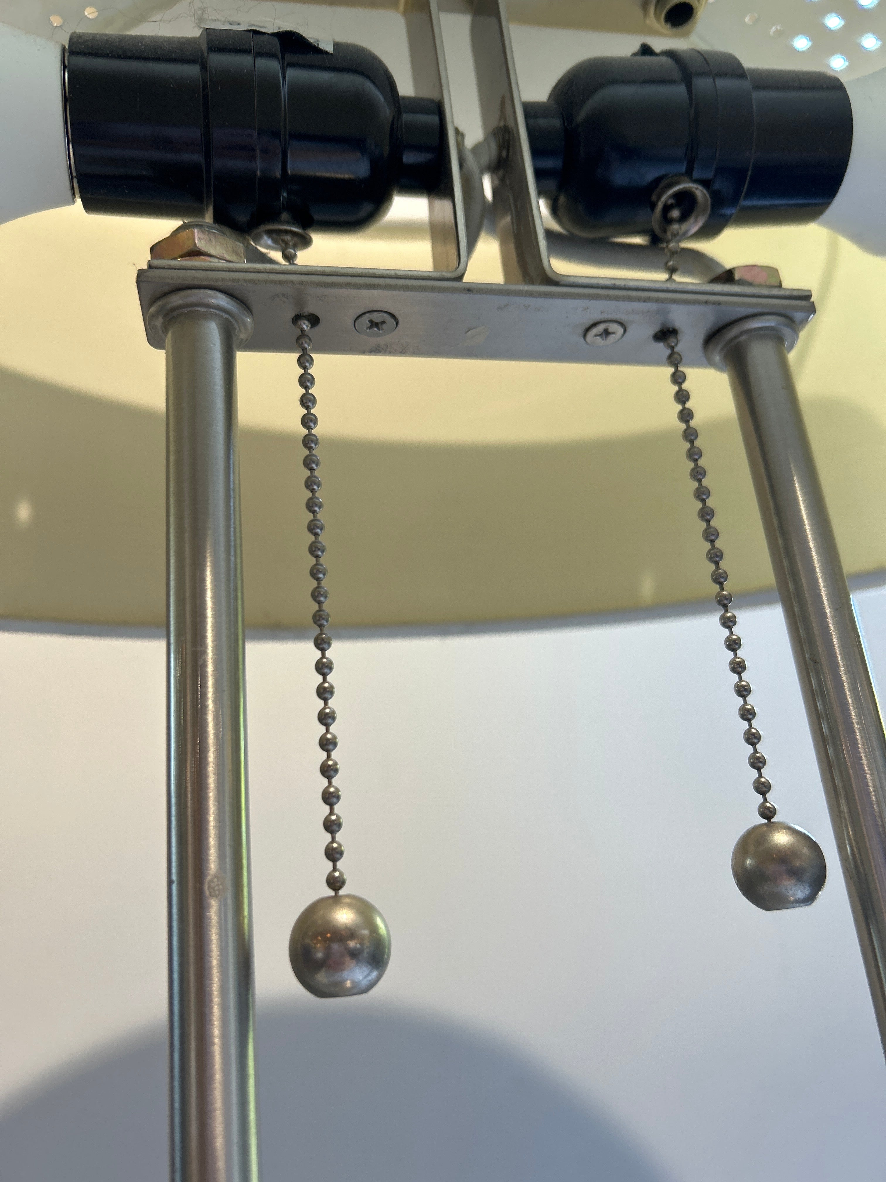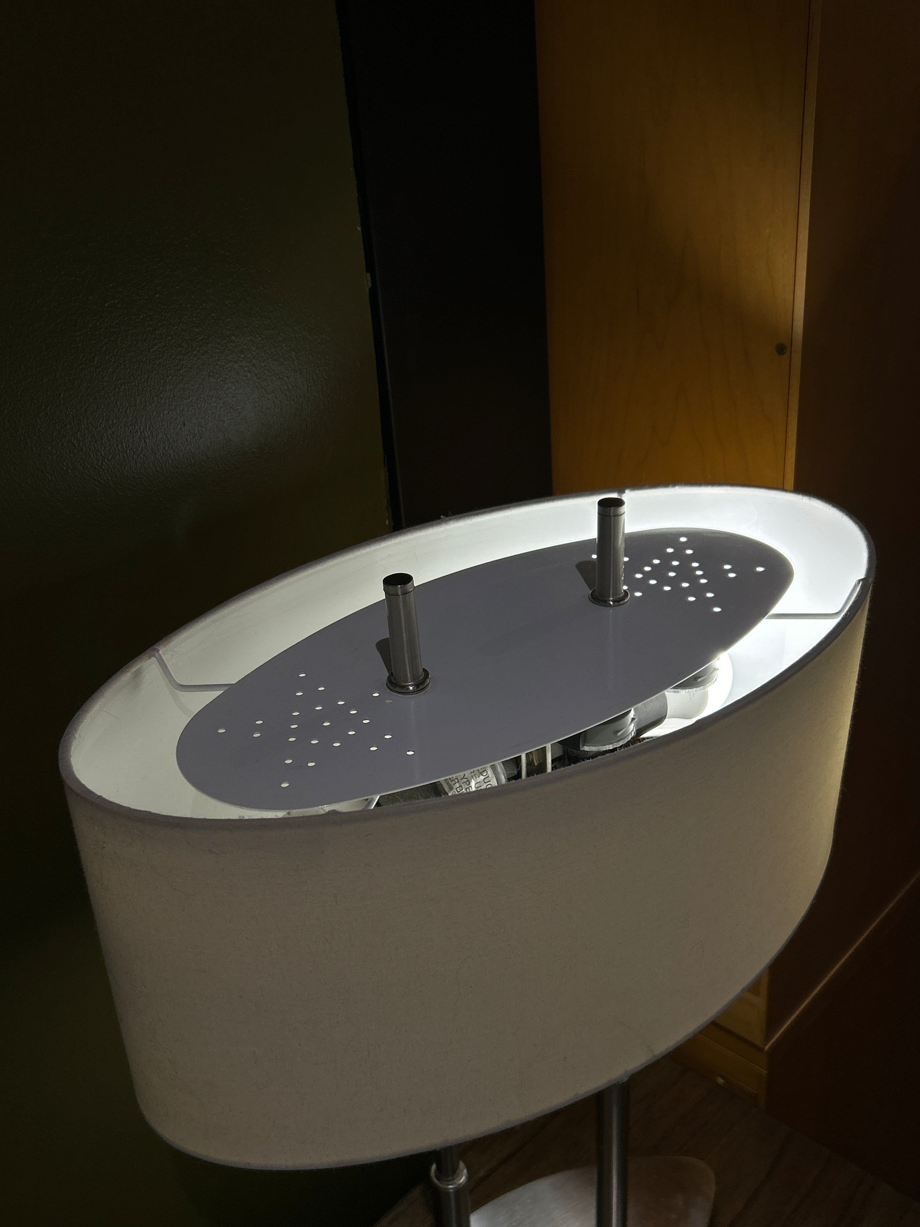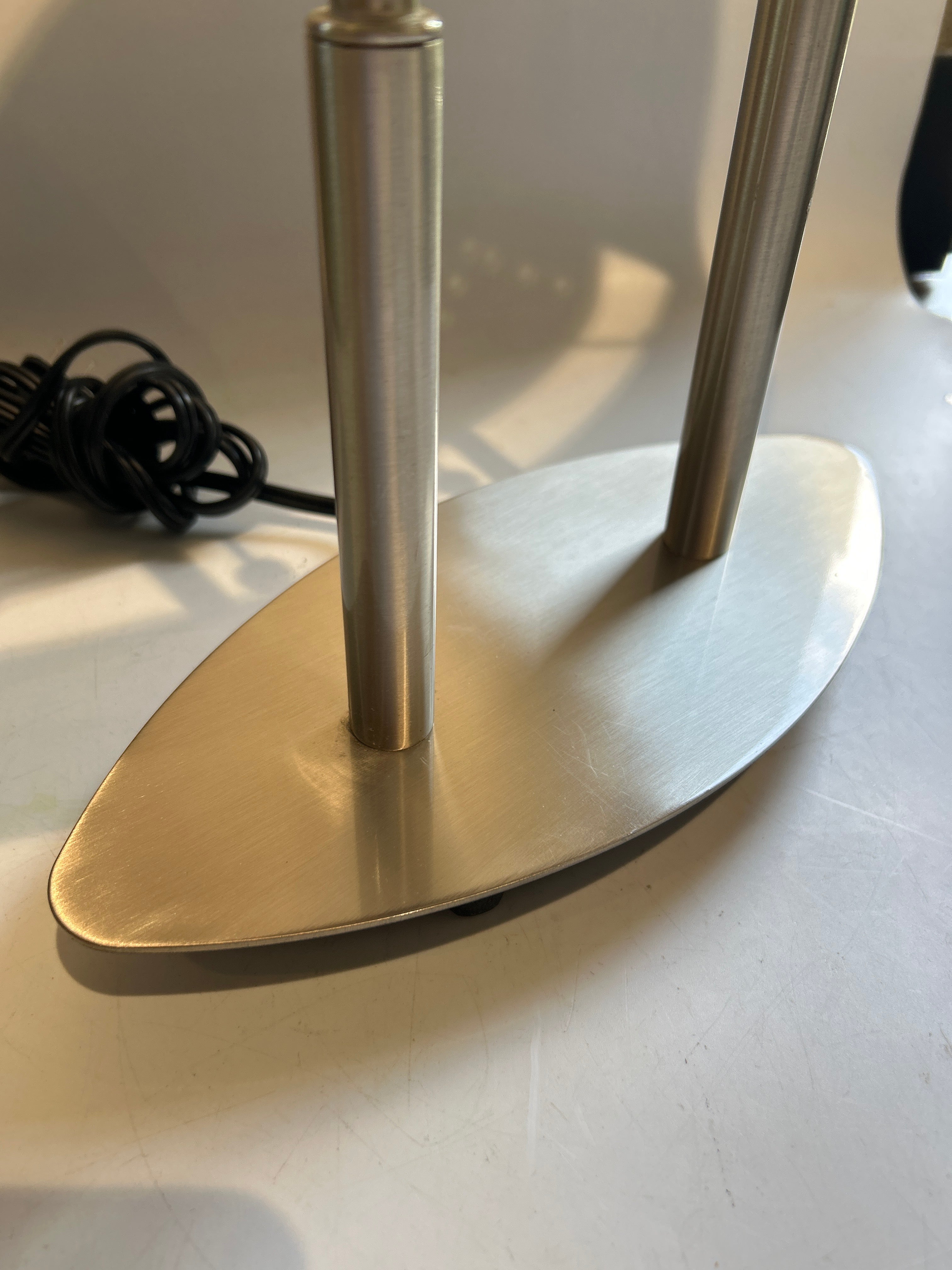 Elevate your space with this sleek and sophisticated table lamp featuring a polished silver dual-pole base and a soft beige oval fabric shade. This contemporary piece blends minimalist design with subtle curves—two slender metal poles rise from an elliptical silver base, supporting an elongated oval shade that casts a warm, ambient glow. Ideal for bedrooms, side tables, console tables or office suites, this lamp offers both style and function. The clean silver finish fits seamlessly in modern, transitional or mid-century inspired interiors, while the beige shade softens the metallic look with a cozy, inviting light.
