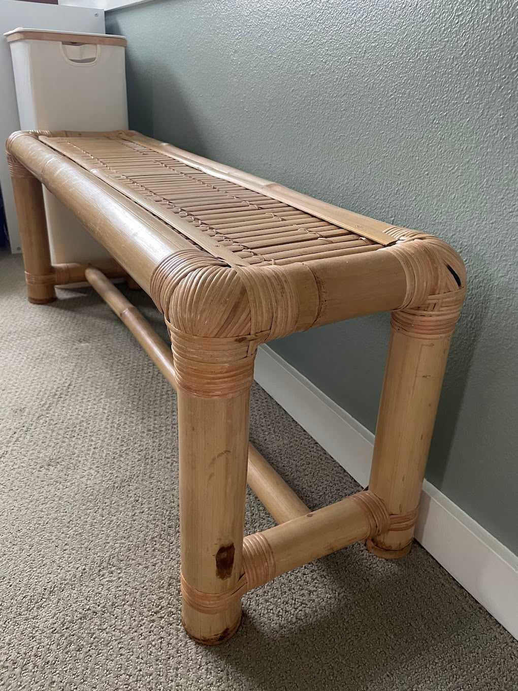 Palm Beach style woven reed design crafted bench ; bamboo, et. Perfect for a summery beach vibe, thick/heavy and perfect as a design statement.