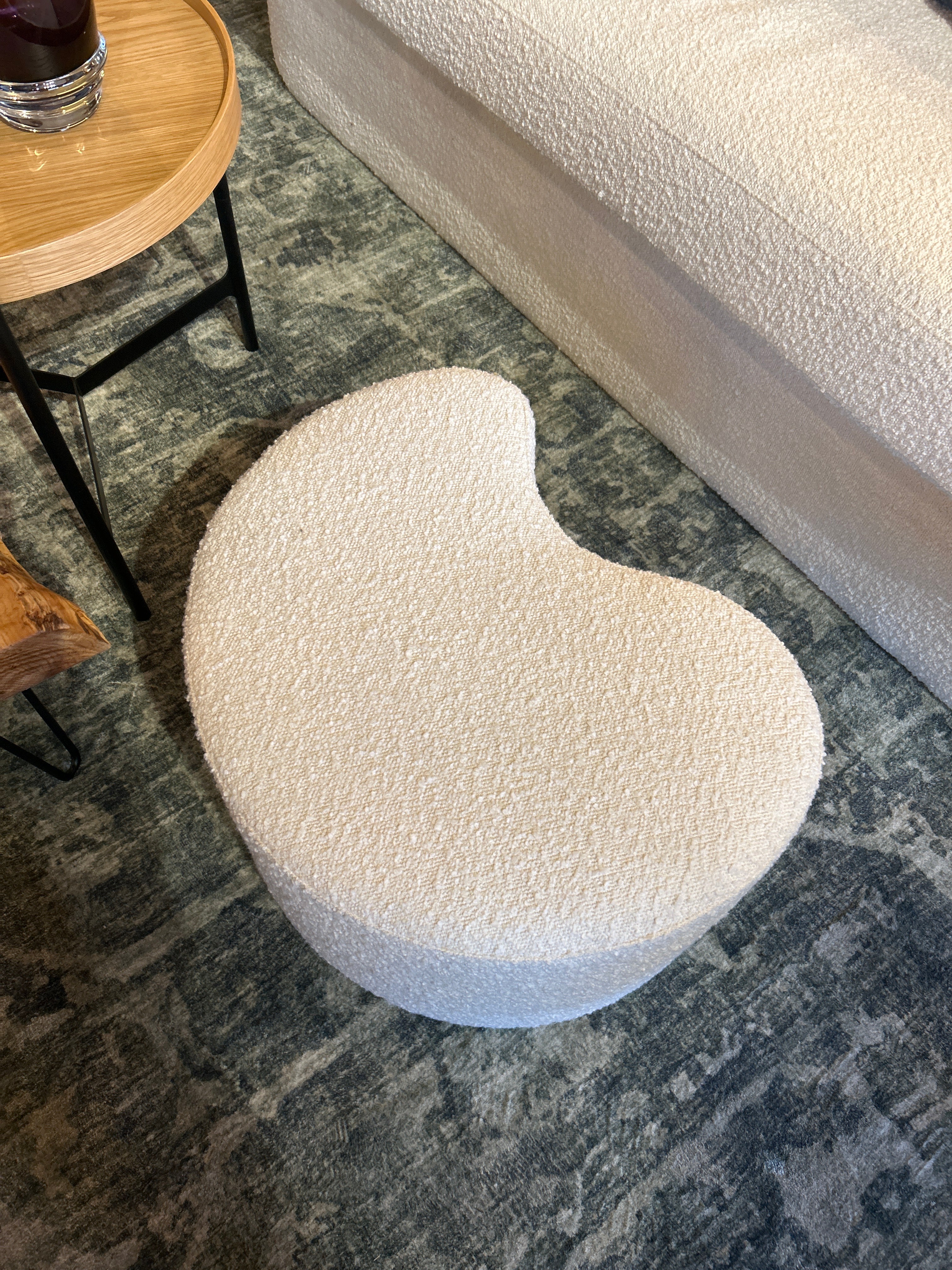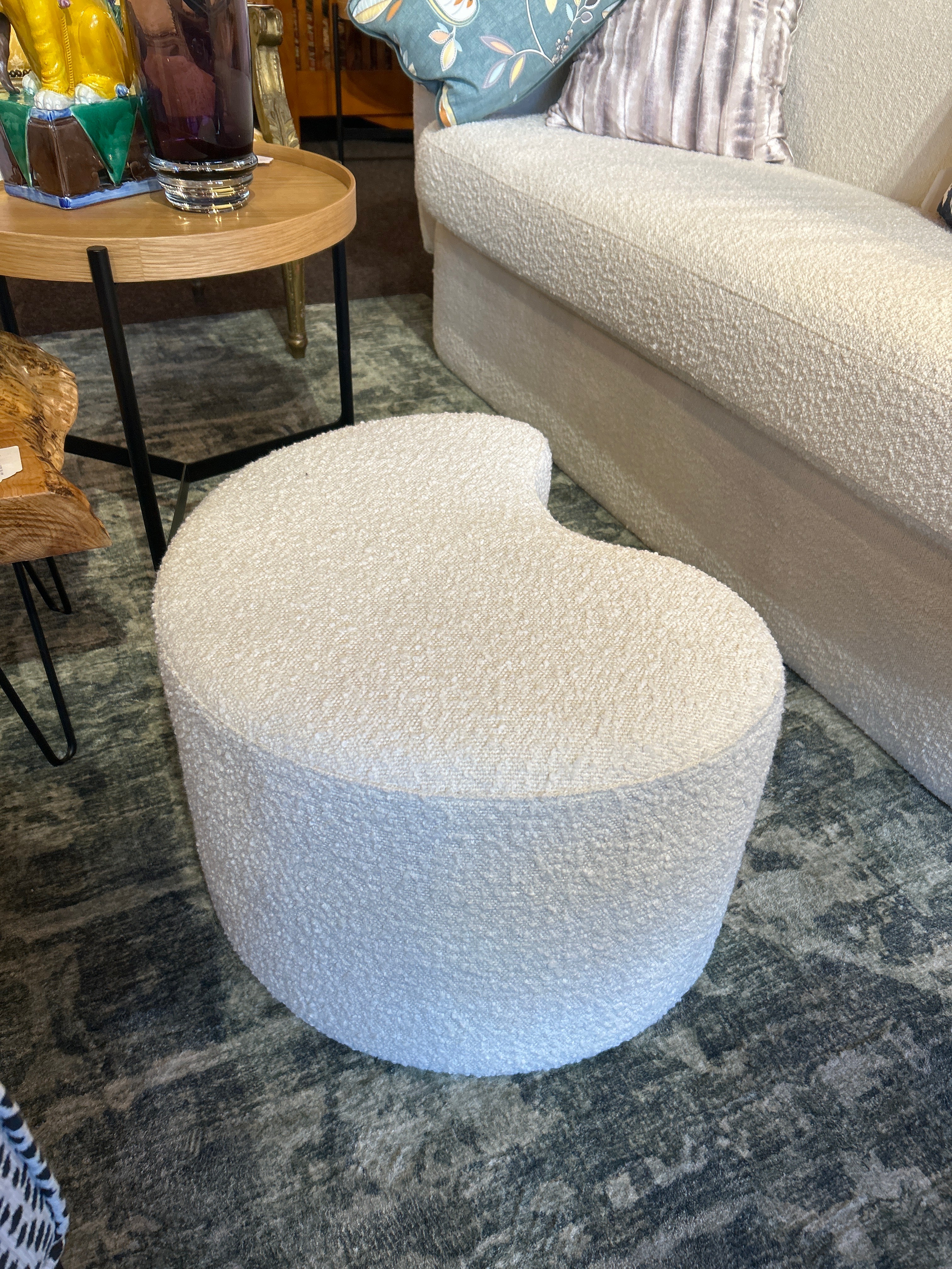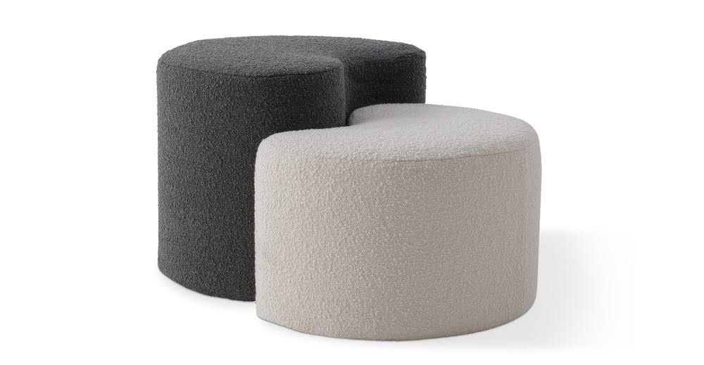 Essential Style Kick up your heels on this classic curvaceous ottoman. Made with flat smooth seams this piece will look right at home in your living room doubling as a coffee table or extra seat. Chic Construction The smooth round shape nods to revival styling and the multiple heights ads intrigue. Each Nook is built by hand using solid hardwood, and upholstered in our Heavy Indigenous Boucle. ABOUT INDIGENOUS BOUCLE Come home to this runway-worthy, extremely durable boucle fabric of incredible drape & natural feel. At 590 Grams per square meter, the Indigenous boucle is a delightfully curly fabric with beautiful variation in texture. Despite boucle being a fully woven loop fabric, from a distance, it might be mistaken for a loop and cut pile combo. Indigenous boucle has jaw-dropping texture and a comfortably soft surface.
