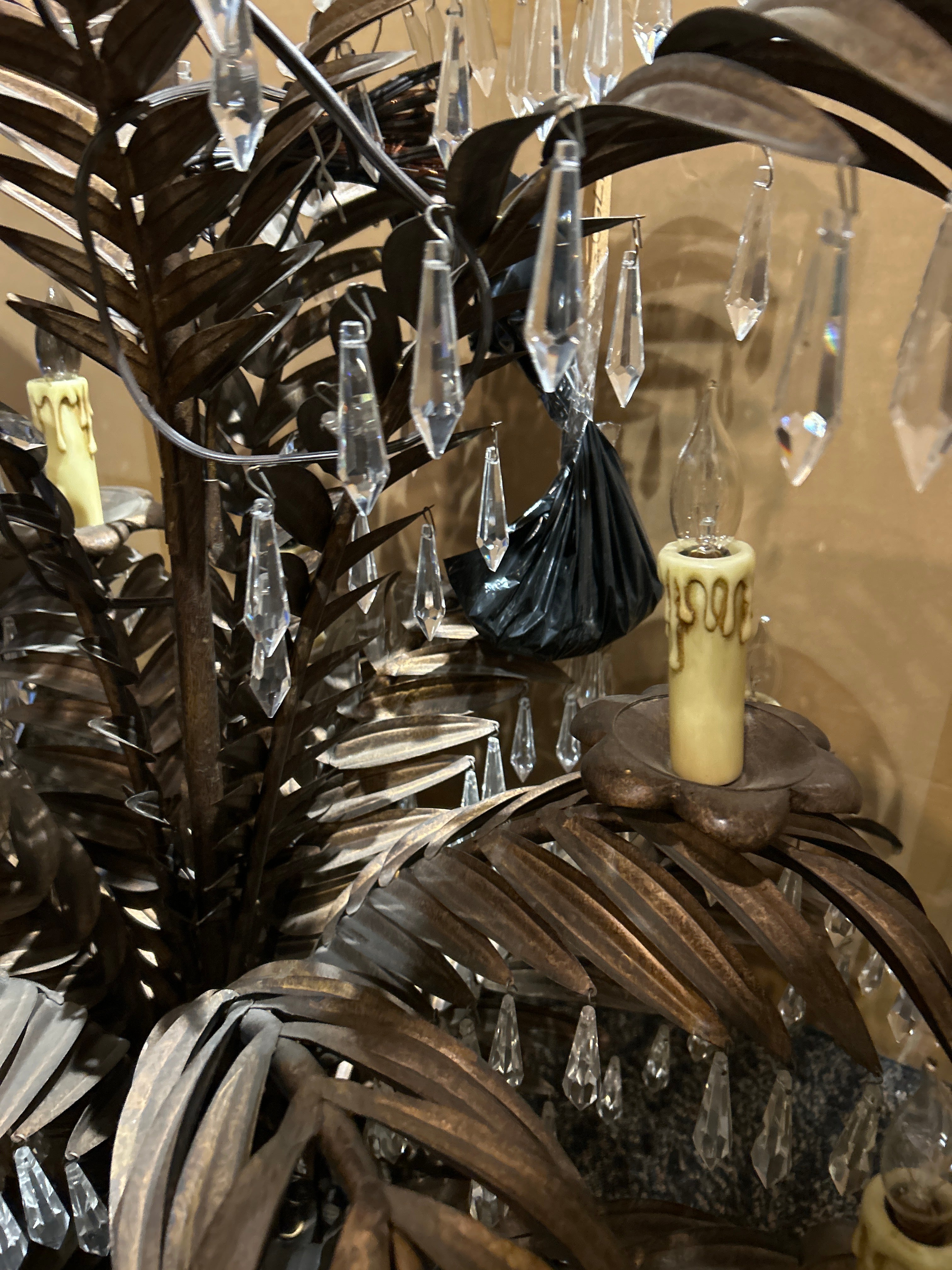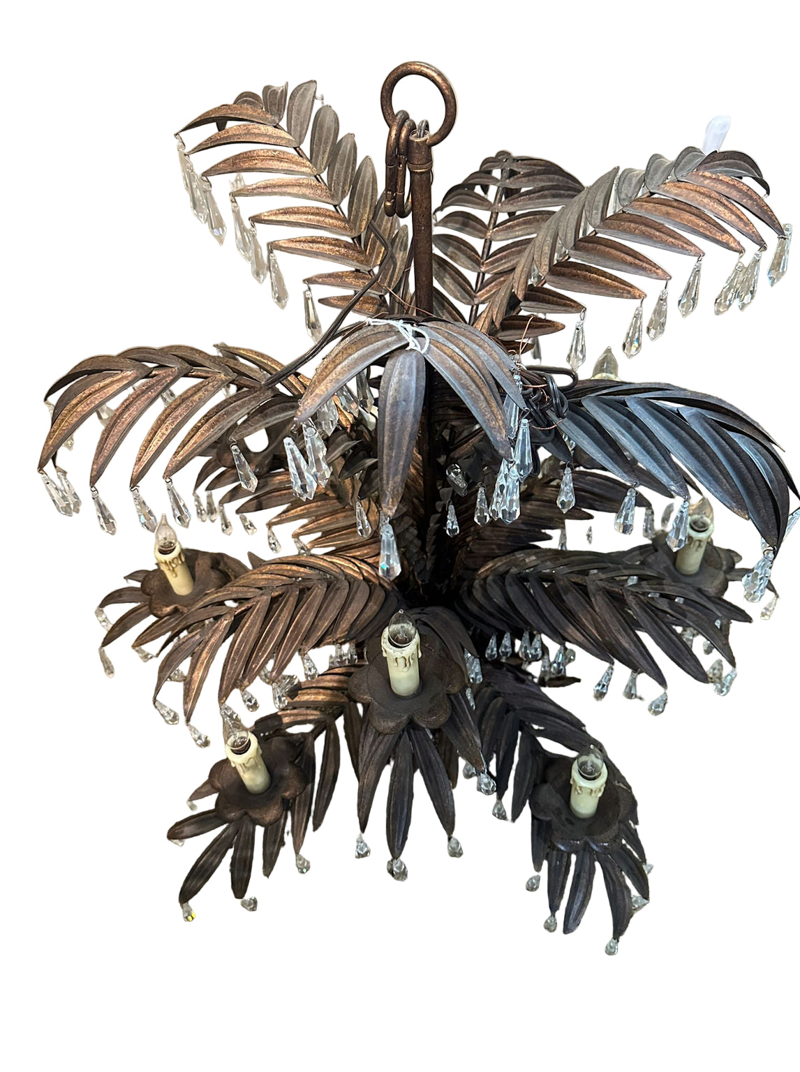 Palm Leaf Deco Chandelier, a refined blend of vintage charm and tropical elegance. Featuring bronze palm leaf accents and shimmering crystal details, this 36" x 39" hanging lamp casts a warm, inviting glow through electric candle lights. Perfect for mid-century modern and tropical-inspired interiors, it adds a sophisticated statement while enhancing ambiance with its timeless design.