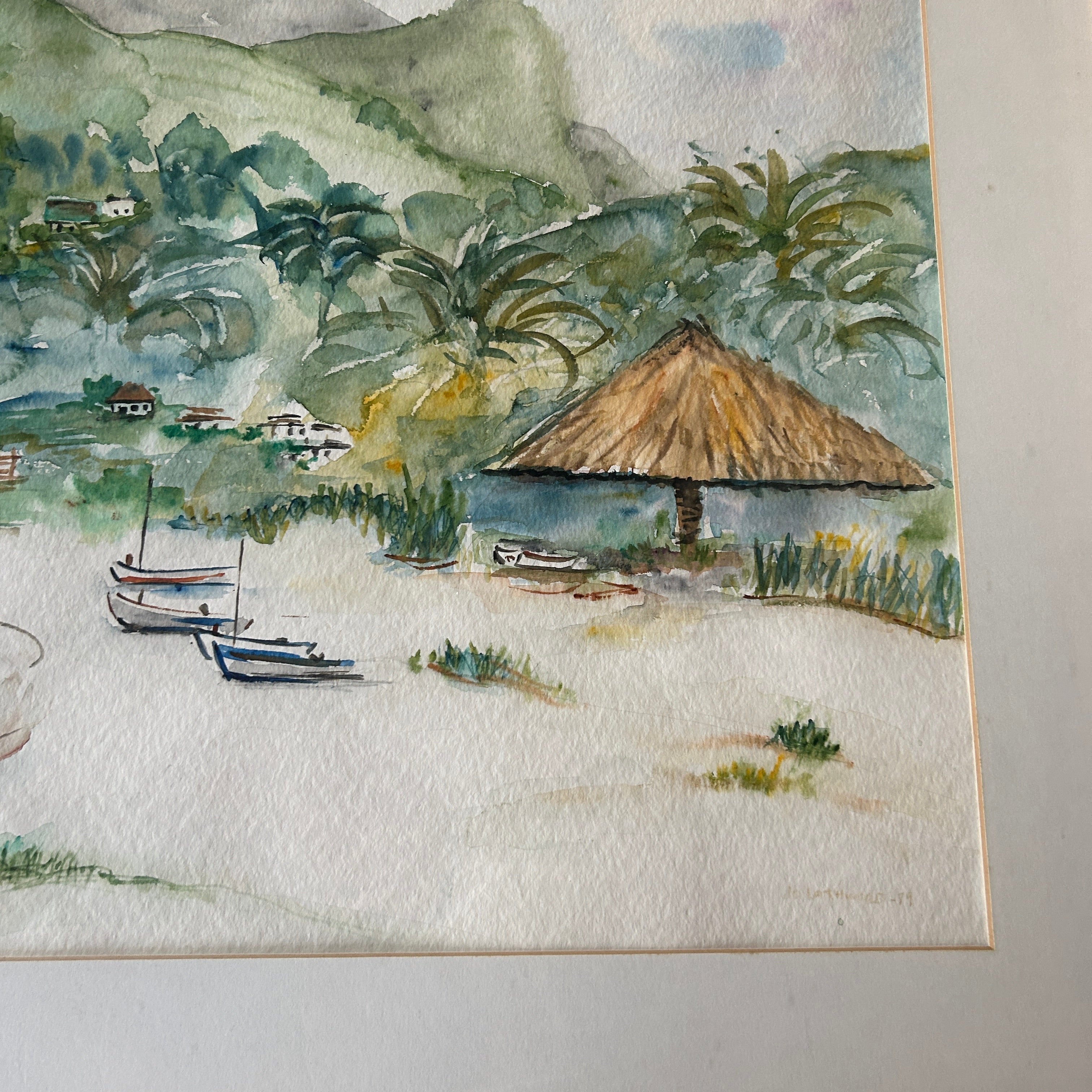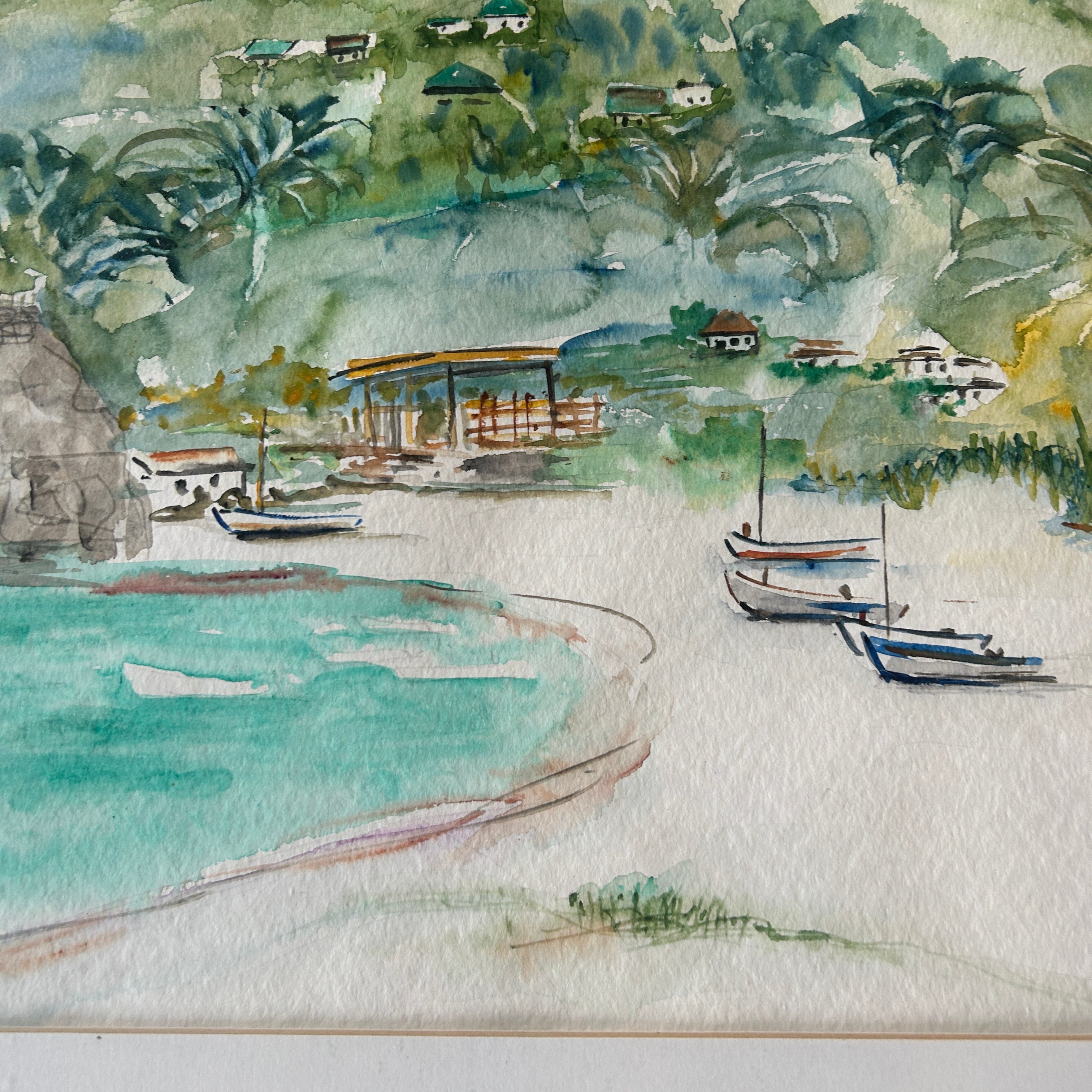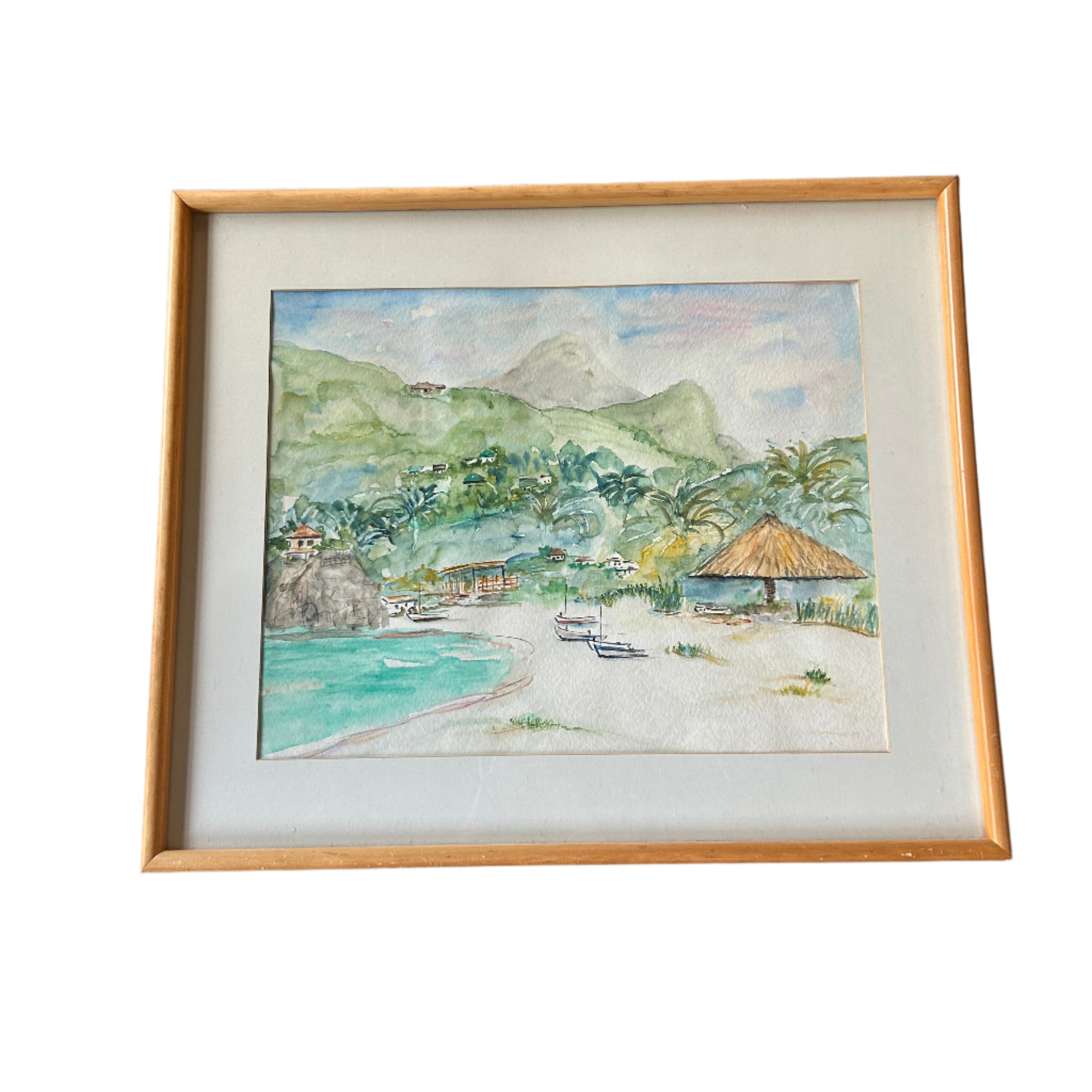 Capture the serene beauty of island life with this original watercolor painting, featuring a quiet beach scene framed by lush green hills and calm turquoise waters. Thatched-roof huts, palm trees, and docked boats lend a peaceful tropical charm to this hand-painted landscape. Presented in a natural wood frame with a white matte, it's ready to hang and perfect for bringing a sense of relaxation and escape to any space.