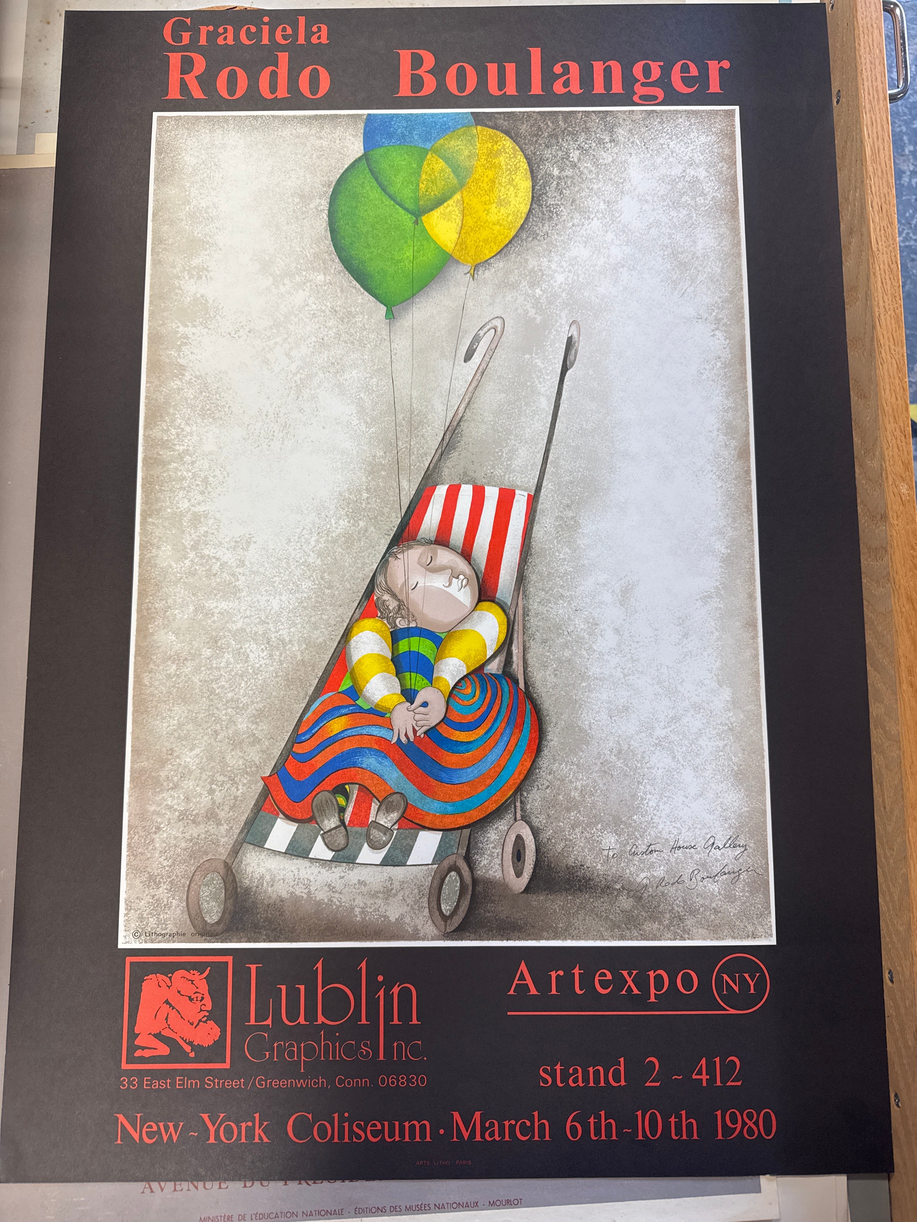 Celebrate the whimsical world of Graciela Rodo Boulanger with this vintage 1980 ArtExpo New York poster. It features one of her most beloved themes: a rosy-cheeked child sleeping in a stroller, surrounded by a cluster of balloons. This image captures everything that collectors love about Boulanger. Soft curves, beautiful colors, and a gentle, dreamlike humor that turns childhood into poetry. Hand-signed by the artist, this poster blends accessible wall art with fine art appeal. It is perfect for nurseries, playrooms, modern interiors, or anyone starting a collection of 20th-century graphic art.